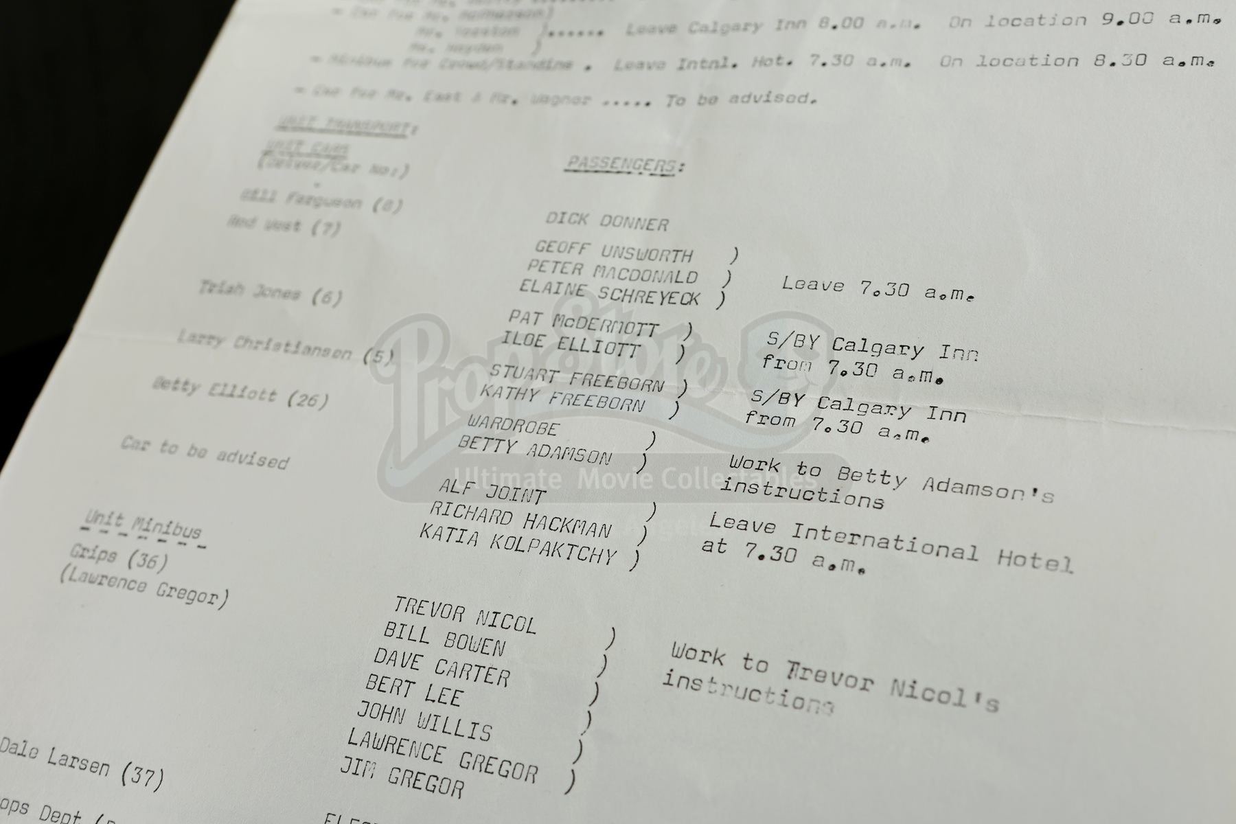 The 11 8 x 10 black-and-white photographs are from both the original film and its sequel, and show the actors on set. Some photos show minor creases due to production use and age, but the set remains in very fine condition. Dimensions (call sheet): 36 cm x 22 cm (14” x 8 ½”); (envelope): 22 cm x 11 cm (8 ¾” x 11 cm); (small photographs): 9 cm x 5 cm (3 ½” x 5”); (large photographs): 20 cm x 26 cm (8” x 10”)
