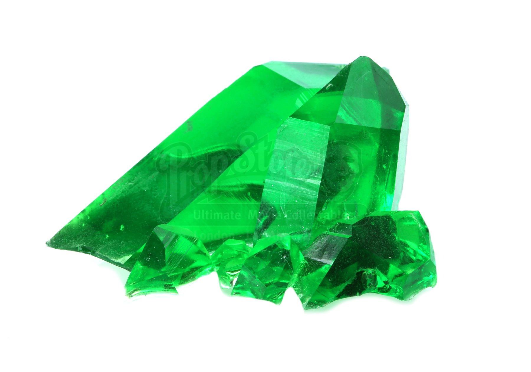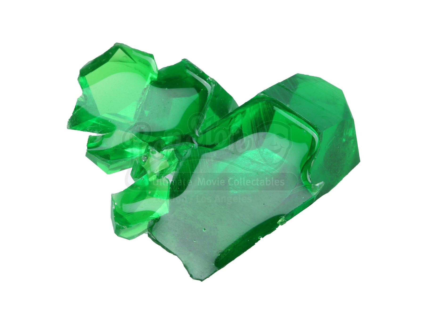 This piece was originally part of the kryptonite necklace utilised by Lex Luthor. It is made of clear resin and shaped like a naturally occurring crystal. The shard is finished with a green tint, giving it the appearance of the alien mineral. The back of the shard shows evidence that it was once part of a larger piece. Overall, this lot is in fine condition. Dimensions: 5 cm x 4 cm x 2.5 cm (2” x 1 ½” x 1”)