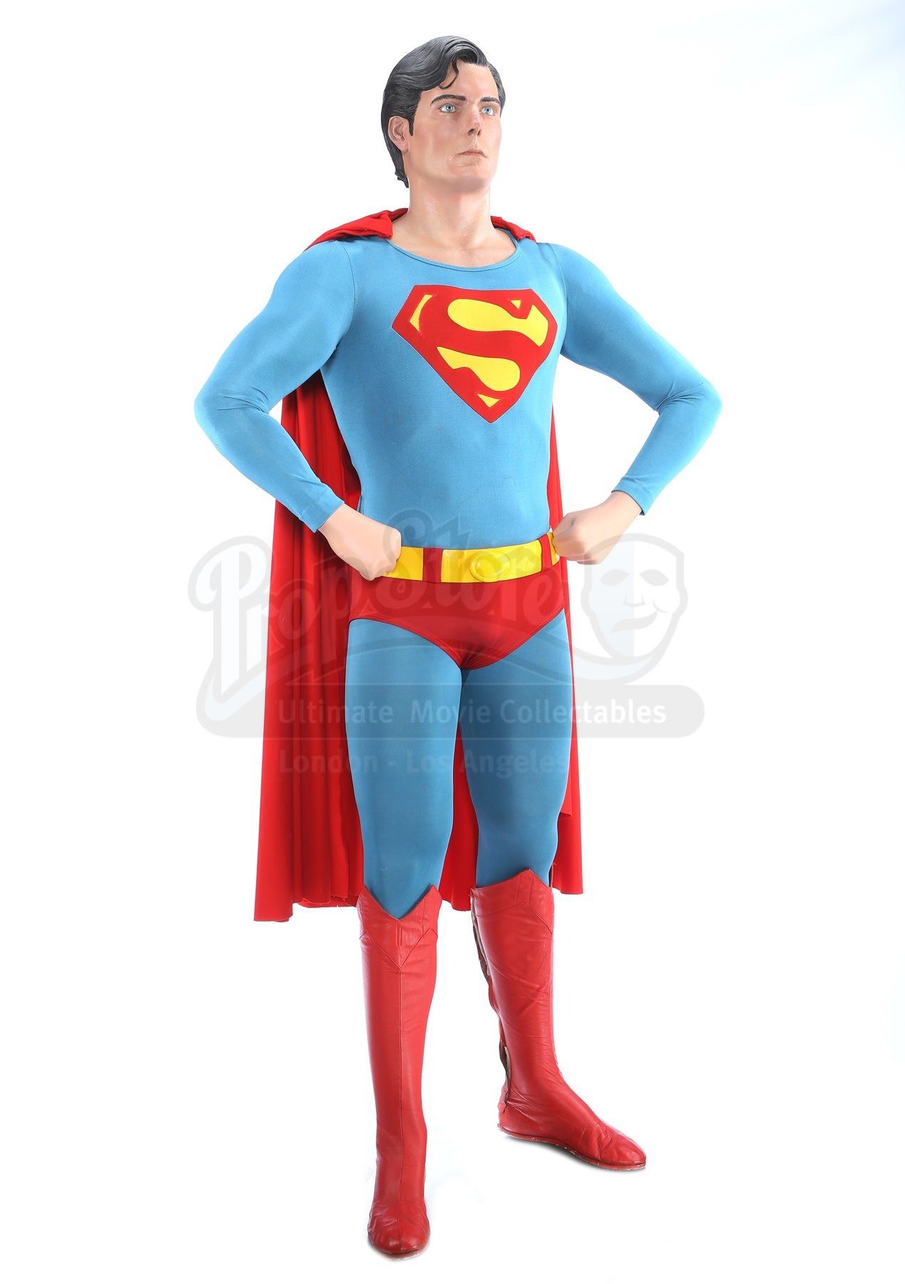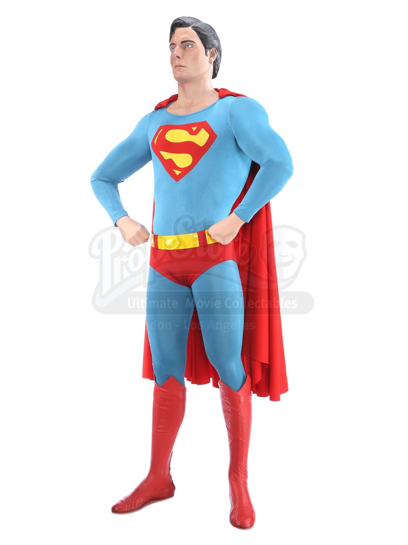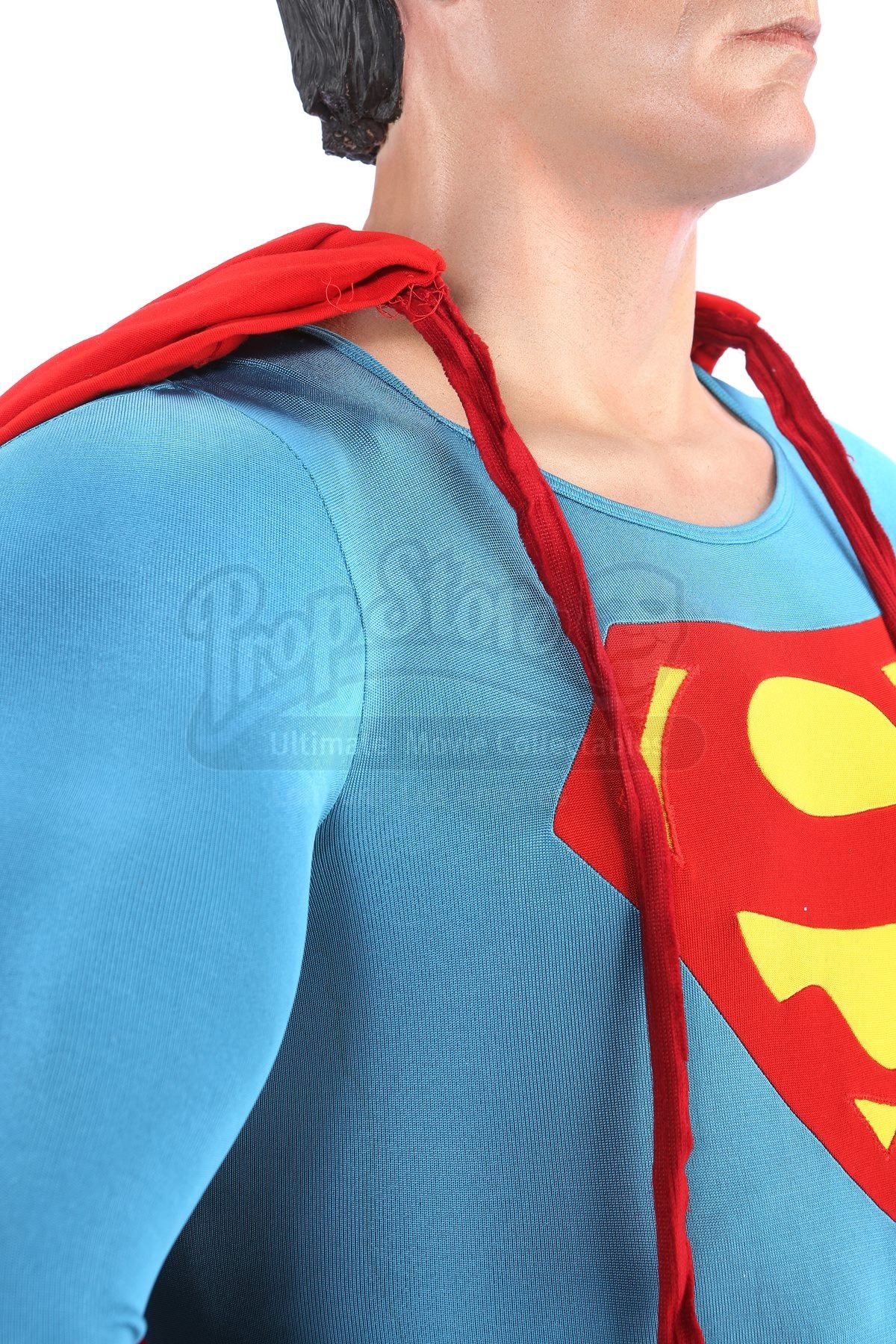 The classic costume is mounted on a bespoke mannequin with a painted lifecast of Christopher Reeve screwed in place. The statue is mounted to a metal base in the shape of Superman’s emblem, with a rod entering the left boot through the zipper, which is stitched shut. The complete costume shows minor wear due to production use and age, with one missing cape shoulder button and a few stray threads on the cape, along with a few moth holes. The costume remains in otherwise very fine condition. Dimensions (on display): 91.5 cm x 51 cm x 198 cm (36” x 20” x 78”)