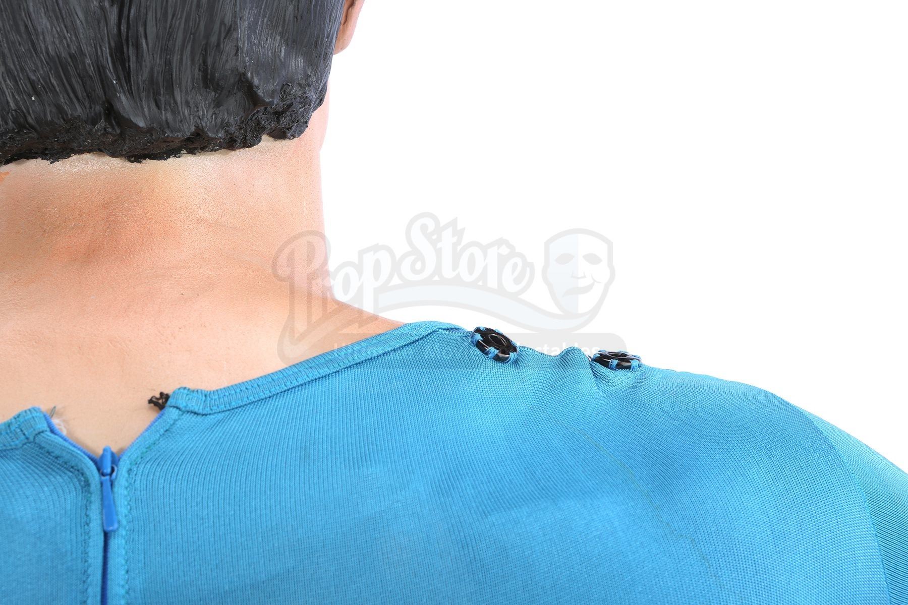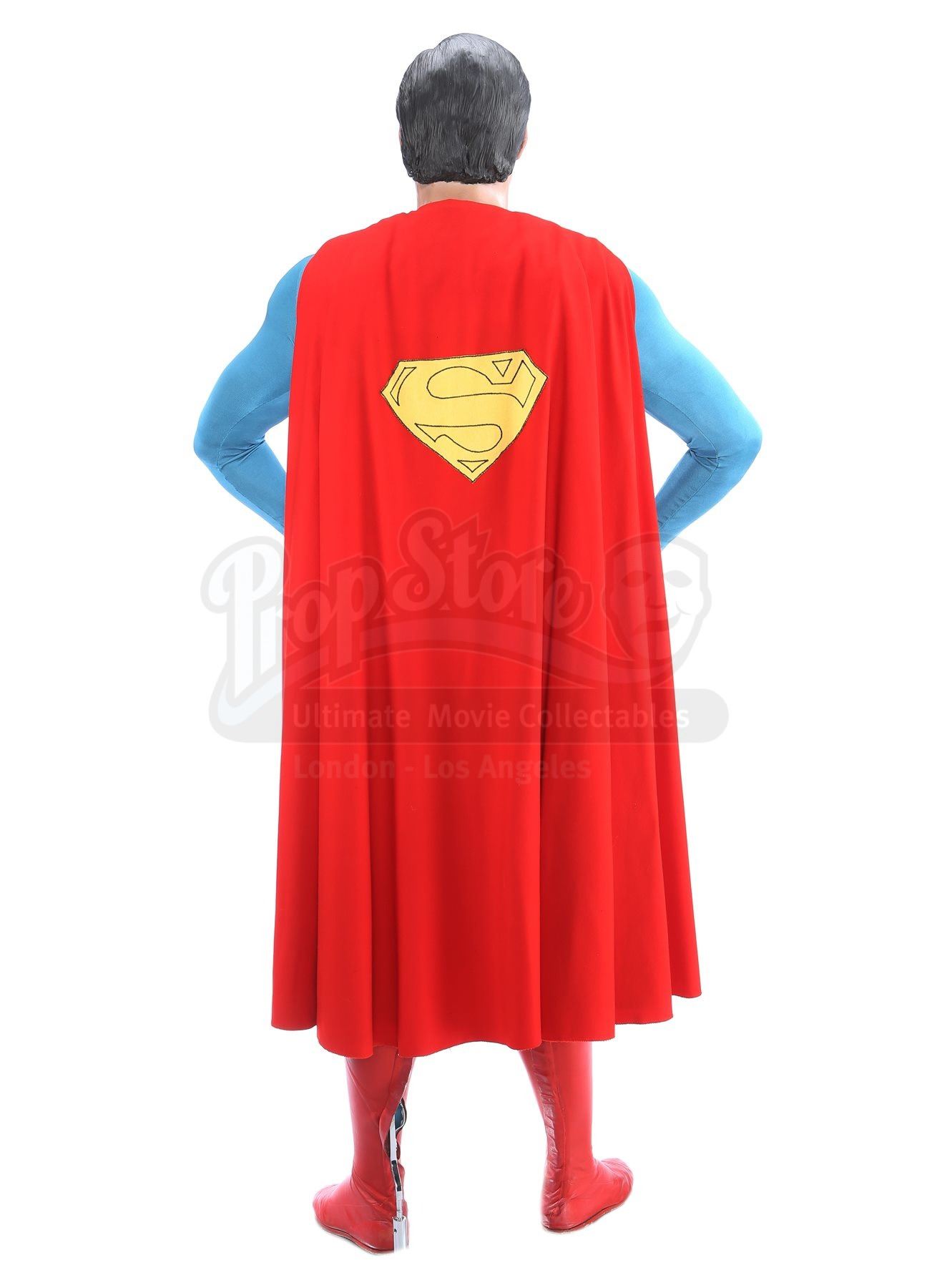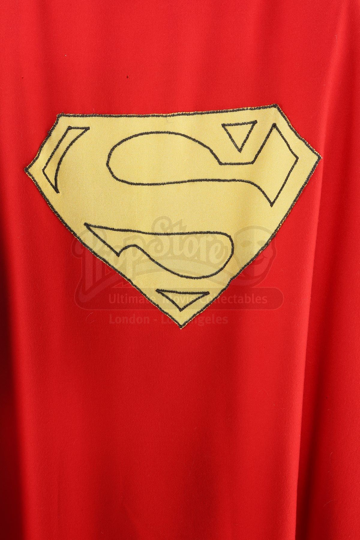 The classic costume is mounted on a bespoke mannequin with a painted lifecast of Christopher Reeve screwed in place. The statue is mounted to a metal base in the shape of Superman’s emblem, with a rod entering the left boot through the zipper, which is stitched shut. The complete costume shows minor wear due to production use and age, with one missing cape shoulder button and a few stray threads on the cape, along with a few moth holes. The costume remains in otherwise very fine condition. Dimensions (on display): 91.5 cm x 51 cm x 198 cm (36” x 20” x 78”)