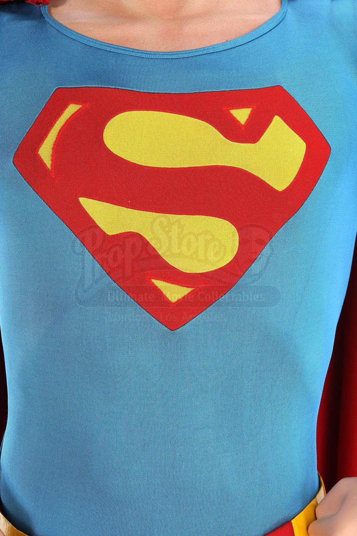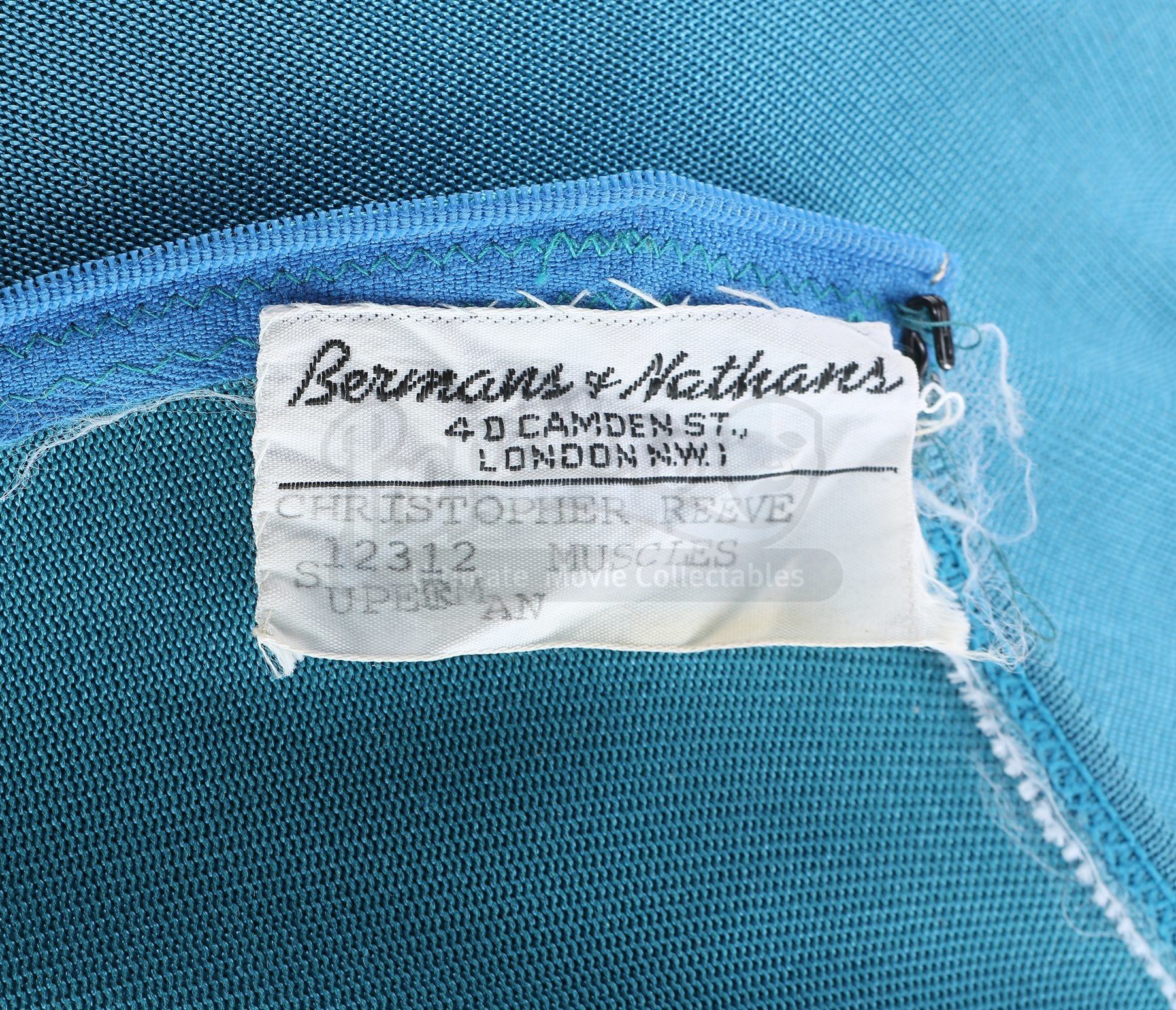 Superman’s instantly recognisable long-sleeve tunic is made of a custom-woven, stretchy blue nylon material manufactured during the production, and displays Superman’s classic “S” logo in red and gold on the chest. The tunic has a hidden zipper at the back, and features a Bermans & Nathans wardrobe label stitched near the neck that reads “CHRISTOPHER REEVE 12312 MUSCLES SUPERMAN”, as it was designed to be worn with a muscle suit. The leggings are made of the same material, and include a wardrobe label that reads “CHRISTOPHER REEVE WATER SUPERMAN” as it was designed to be worn during shots in a water tank. The tunic and the leggings both include holes at the waist, which allowed the actor to be wired for flying scenes.