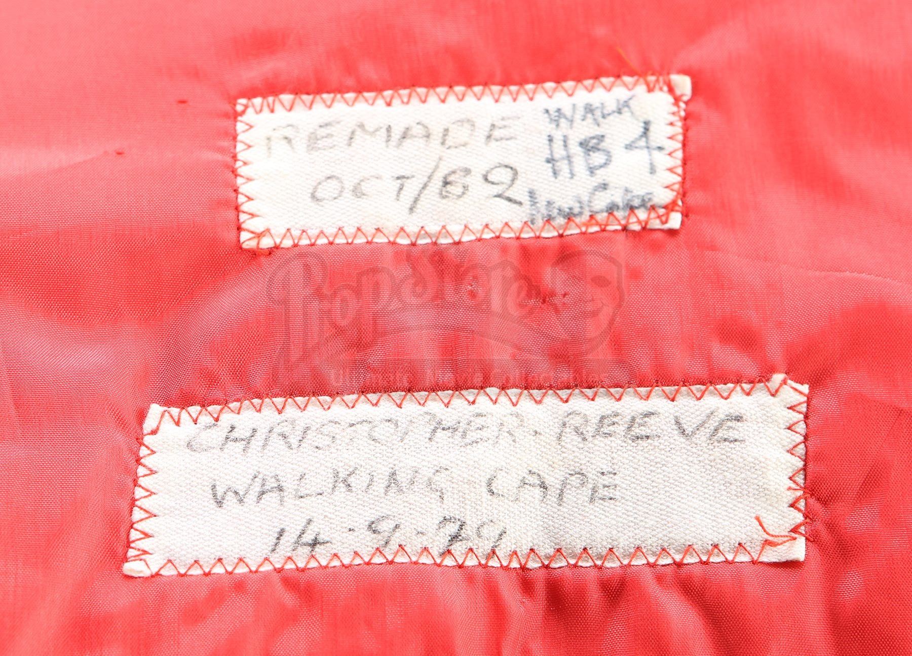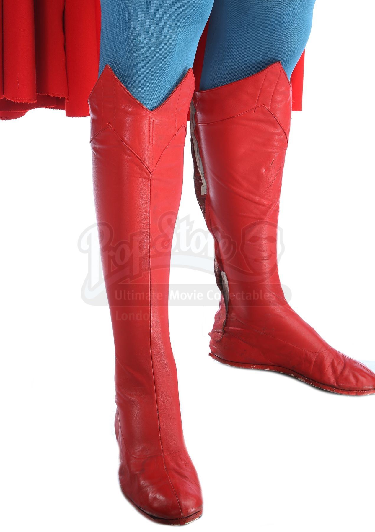 The red trunks feature an elastic waistband with a label that reads “CHRISTOPHER REEVE 12312 SUPERMAN NEW”, and include a yellow-painted leather belt that fastens at the back with hook-and-bar closures. The knee-length cape is made of red wool, and attaches to the tunic via snap-buttons on the shoulders. The back of the cape features a yellow stitched “S” logo with black threading. Two labels are stitched inside, one reading “REMADE OCT/82 WALK HB 4 NEW CAPE”, and the other reading “CHRISTOPHER REEVE WALKING CAPE 14-9-79”. This indicates that the cape was made for the original film, and then remade for the third. Superman’s knee-high boots are made of red leather, and display “FLYING ONLY” handwritten inside each booth using black ink. The boots close at the back with a zipper hidden behind a leather flap.