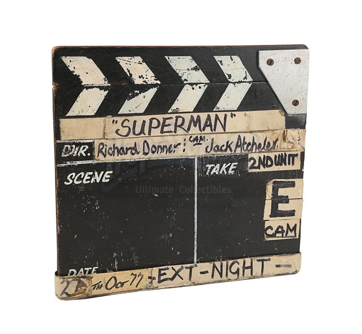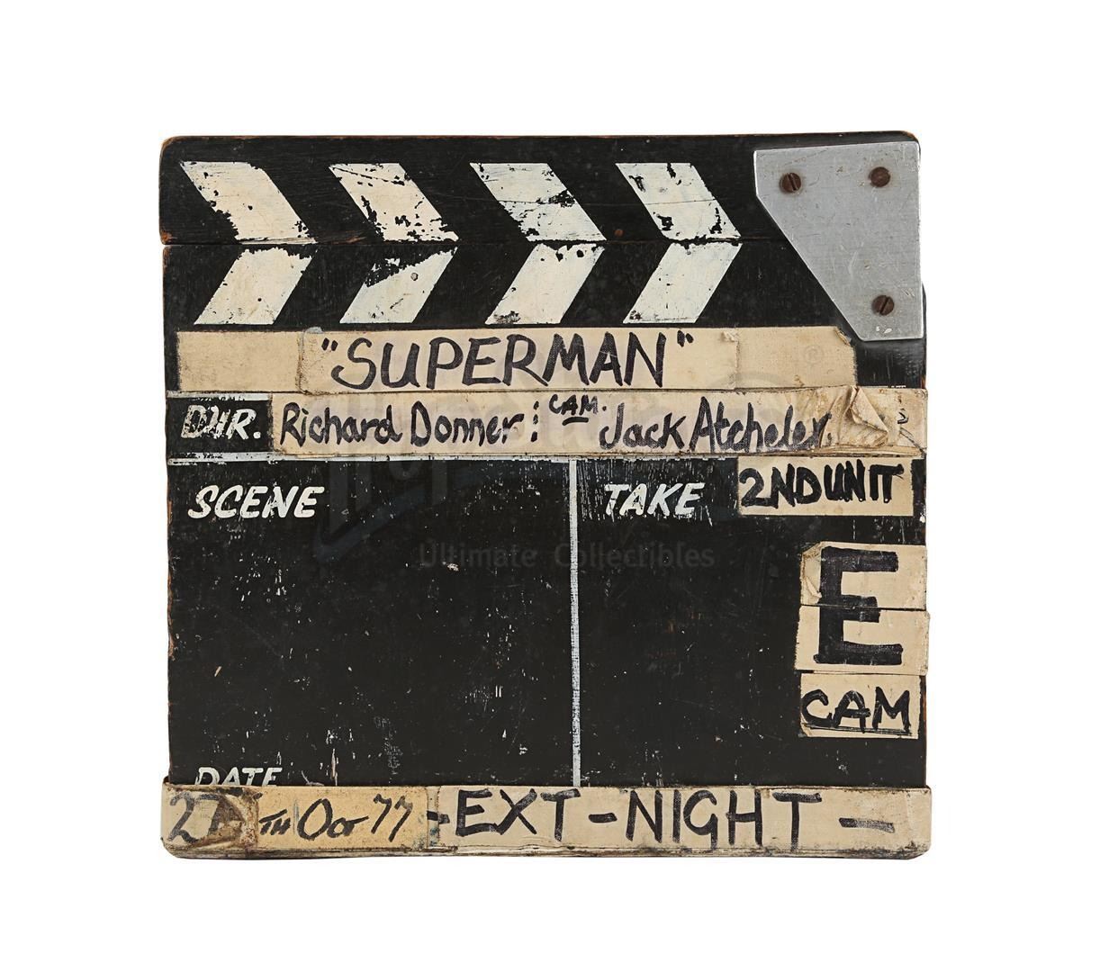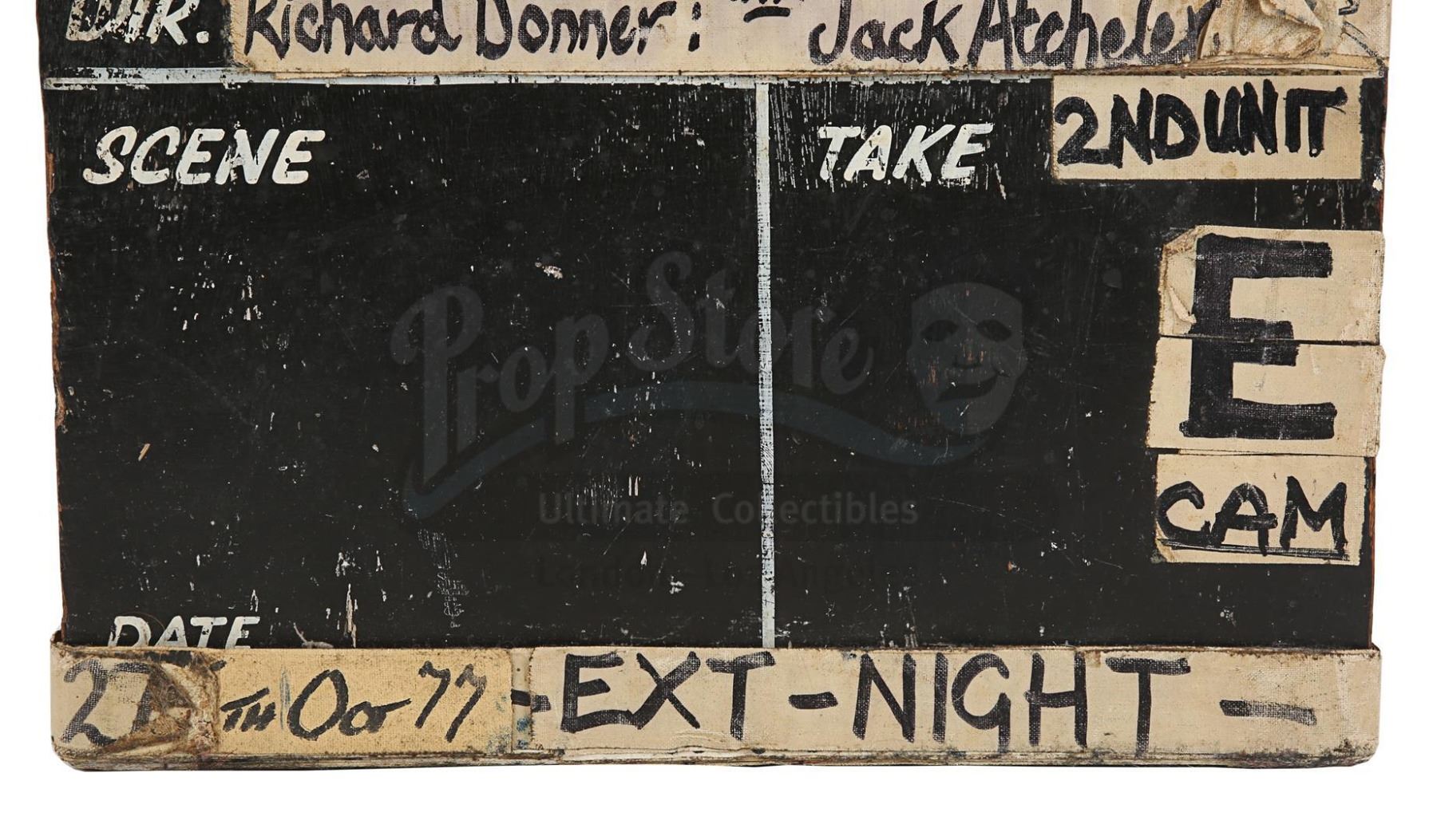 A second unit clapperboard from the production of Richard Donner's superhero film Superman. Used by the second unit during filming, the slate is made of wood, with a clapperstick affixed to the top. A line runs down the middle of the slate creating two fields, titled "Scene" and "Take", respectively. Adhesive canvas tape featuring black handwritten text is applied all over the clapperboard. The production title and the name of director Richard Donner and additional photographer Jack Atcheler are located at the top, while "27th Oct 77" and "Ext-Night" run along the bottom.