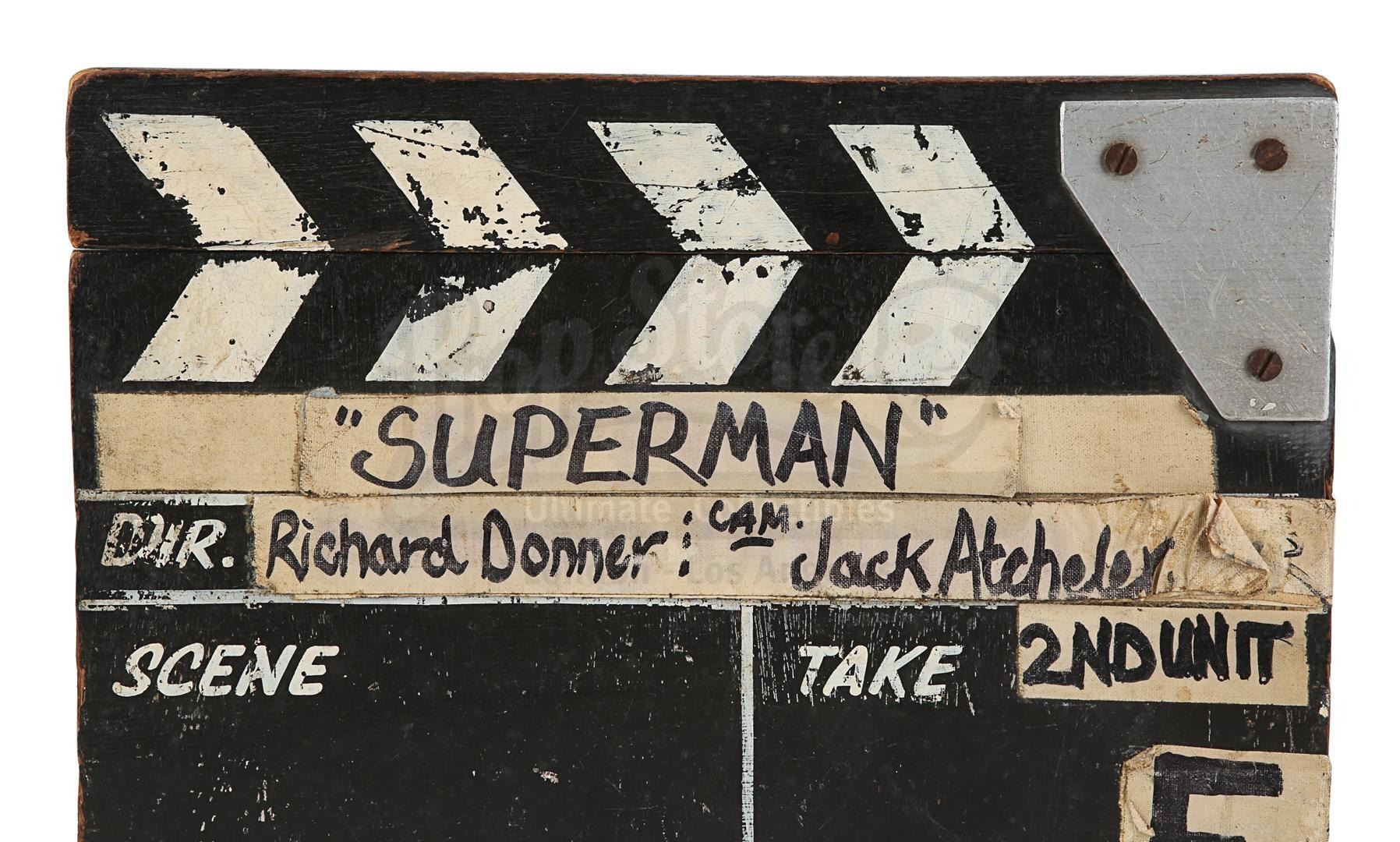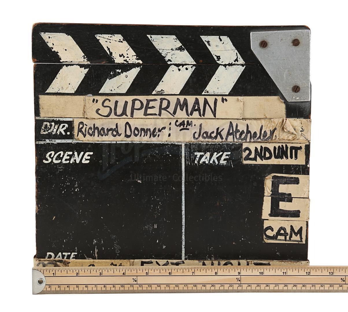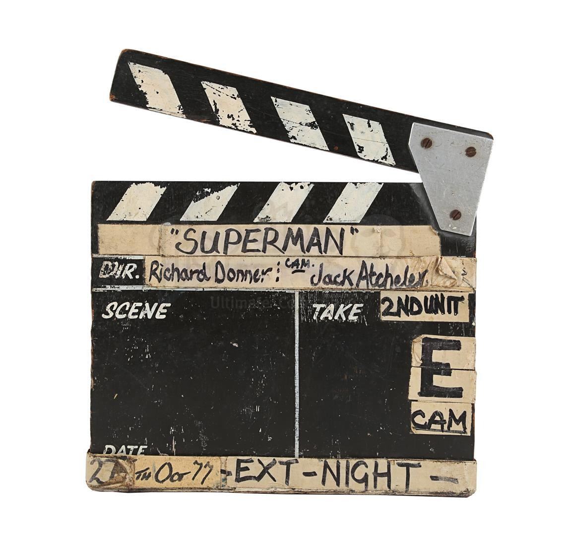 A second unit clapperboard from the production of Richard Donner's superhero film Superman. Used by the second unit during filming, the slate is made of wood, with a clapperstick affixed to the top. A line runs down the middle of the slate creating two fields, titled "Scene" and "Take", respectively. Adhesive canvas tape featuring black handwritten text is applied all over the clapperboard. The production title and the name of director Richard Donner and additional photographer Jack Atcheler are located at the top, while "27th Oct 77" and "Ext-Night" run along the bottom.