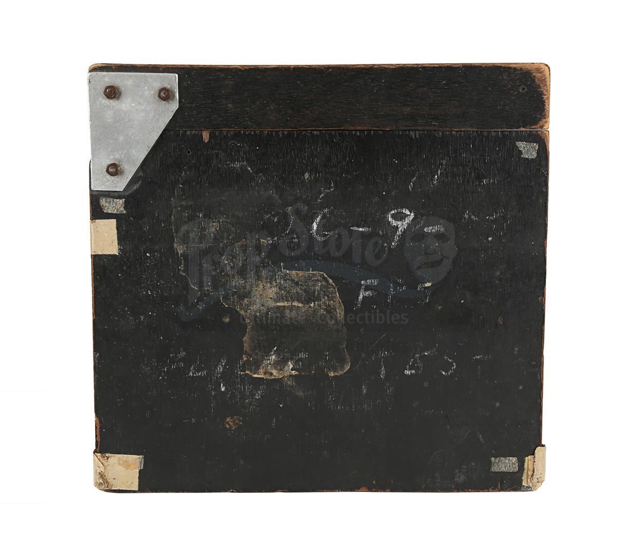 Atcheler worked with model effects director Derek Meddings for scenes involving miniature models on the planet Krypton. Principal photography wrapped on 28 October 1977, indicating the board was used during the final days of filming. Thick layers of tape are applied in some fields, indicating that this clapperboard was reused many times. The lot exhibits minor paint wear, evidence of chalk marks on the back and scratching on the metal hinge, while the edges of the tape have begun to peel away in places. Dimensions: 2.5 cm x 31.5 cm x 29.5 cm (1" x 12 1/2" x 11 1/2")