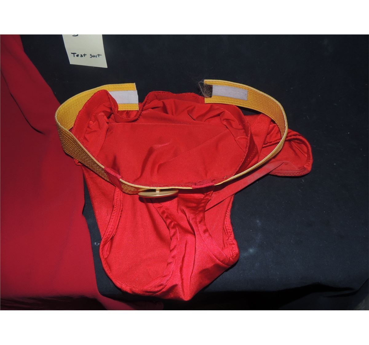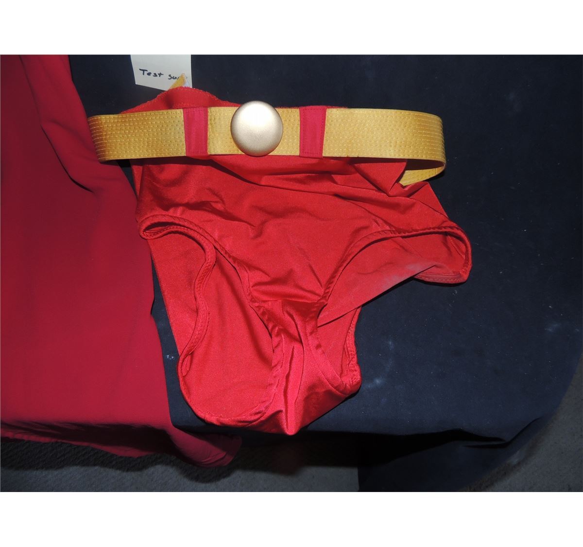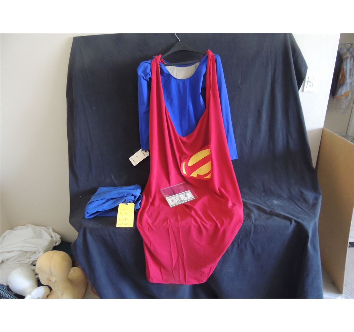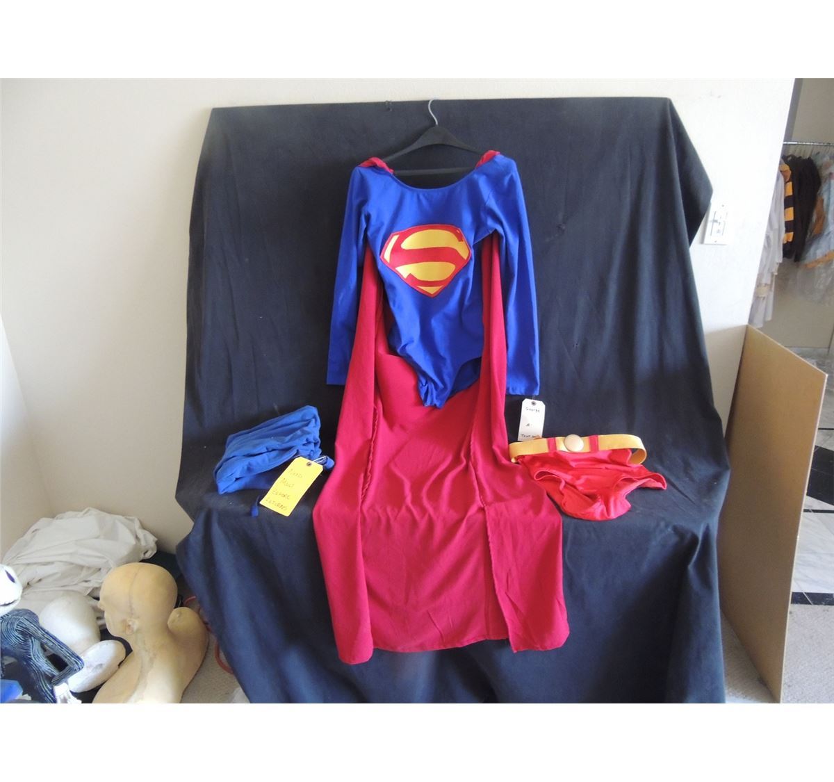 The leotard is a store bought example they sewed an S on. The cape, tights, belt, and I believe even the pants are all studio made.
