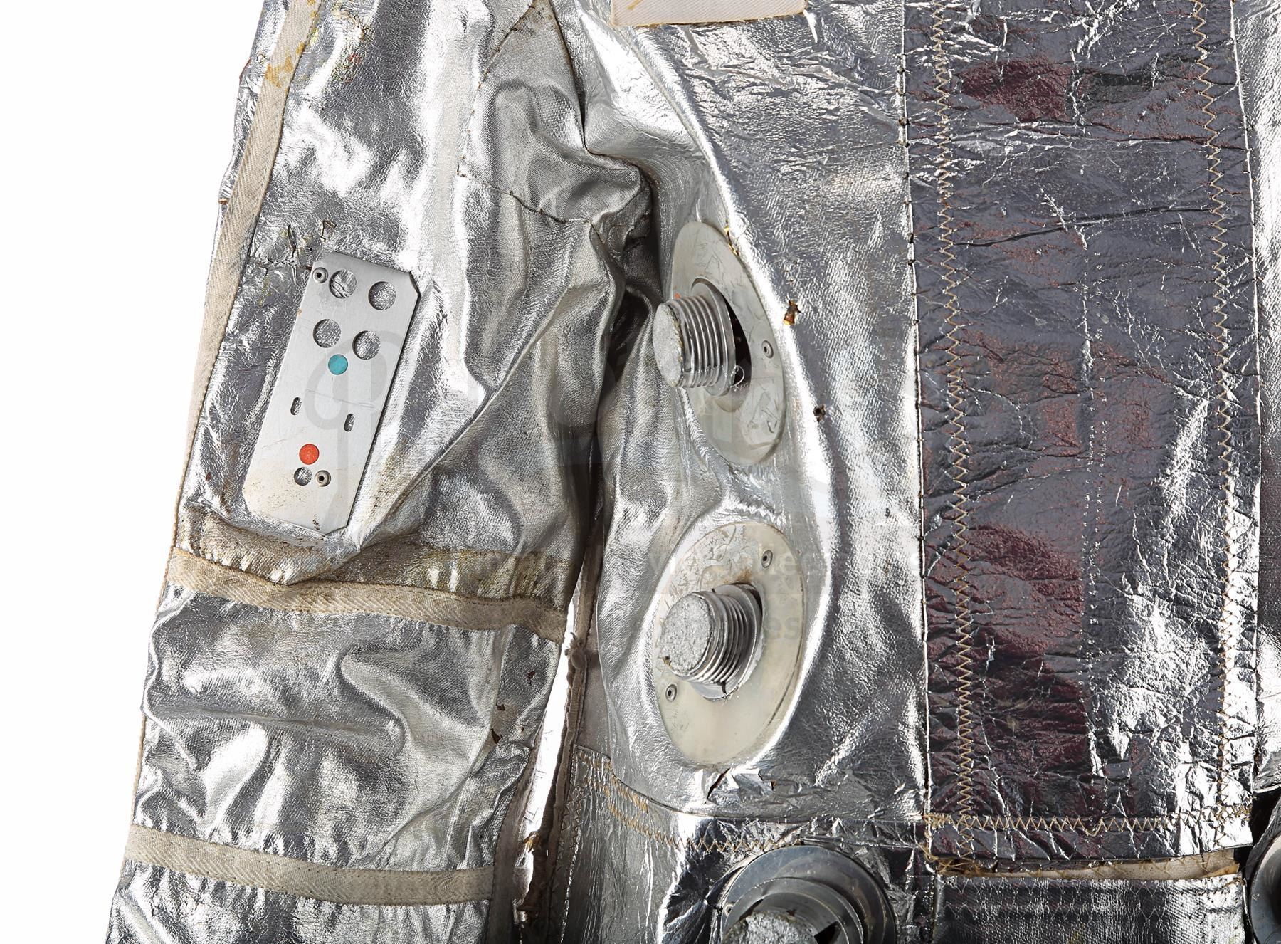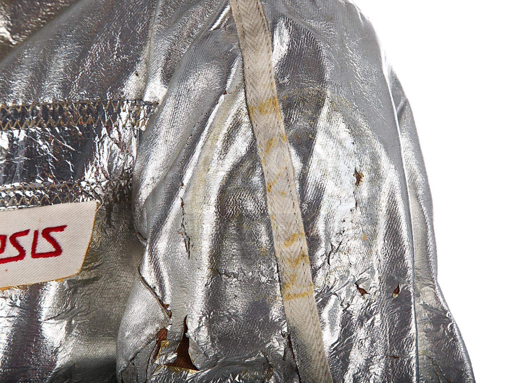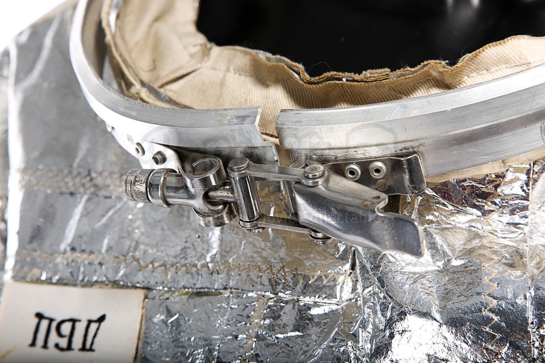 It shows signs of wear from aging. The reflective film is peeling from the suit, and the neck ring has broken away. The patches have been moved from the shoulders to the chest, while the Soviet patch has fallen off entirely, leaving glue residue on the right arm from alterations (it was previously situated on the left shoulder). There are also strips of glue residue where the gloves and boots were fastened.
