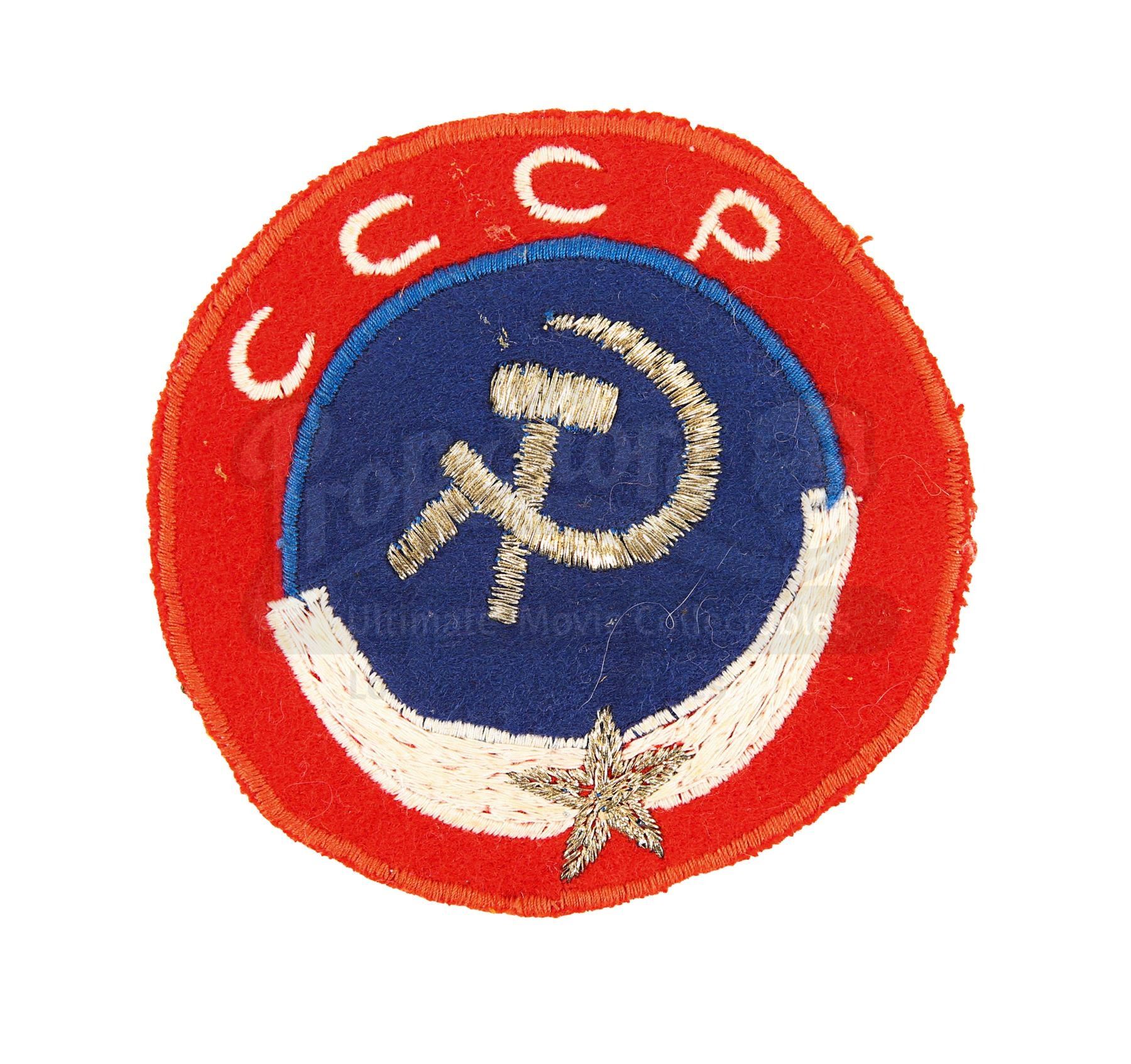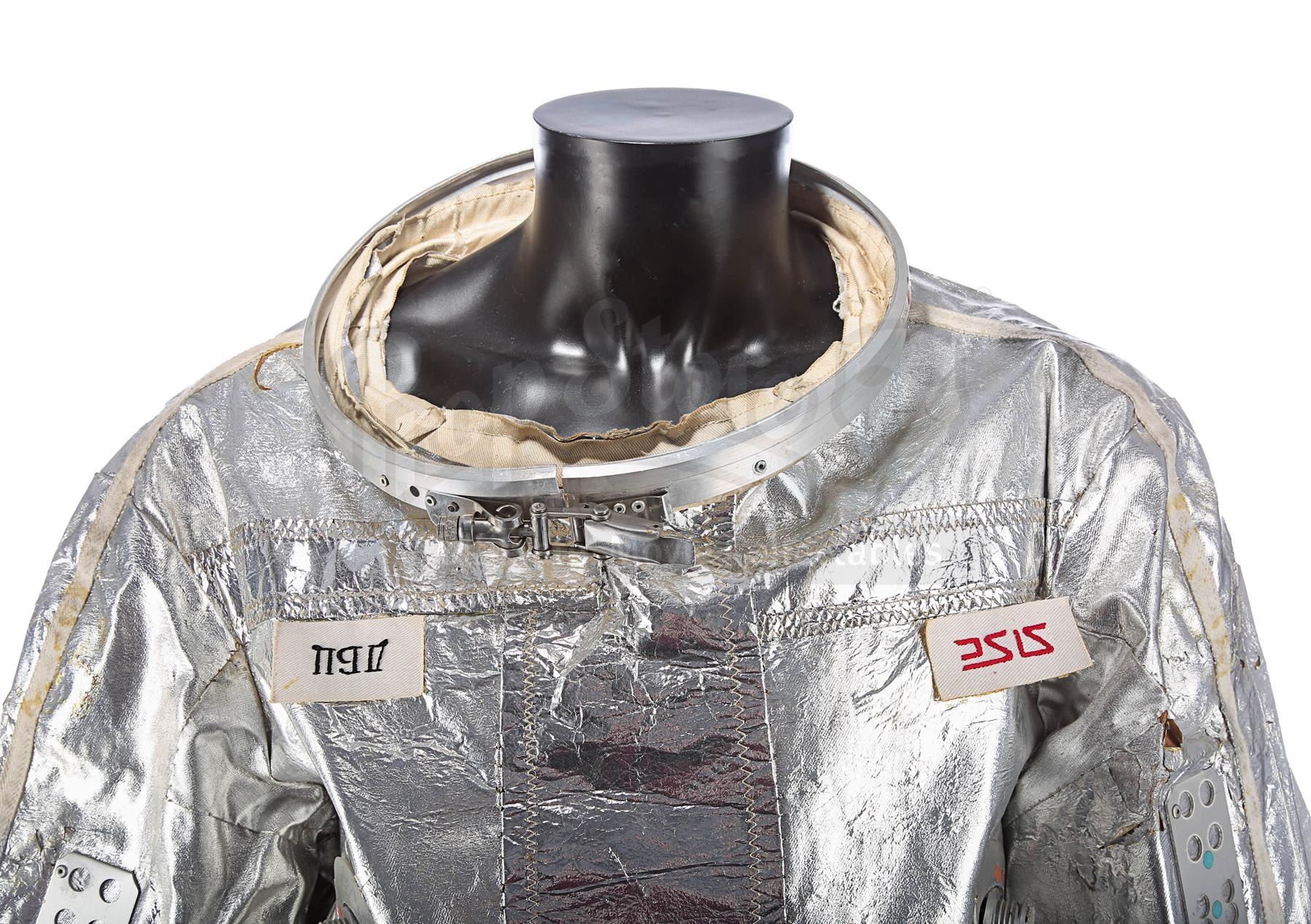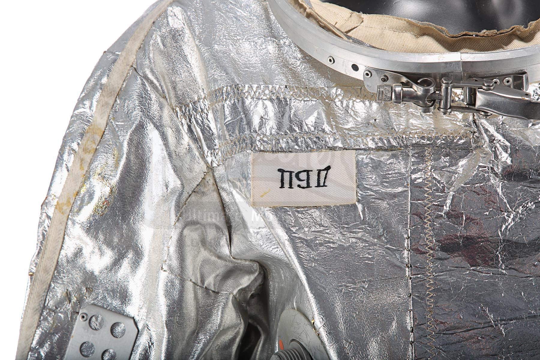 The spacesuit is made of cotton, with a reflective plastic film and a metal helmet neck ring. It features six knobs with missing dials, four metal panels fixed to the arms and legs, two white patches, and a red, white and blue Soviet patch. The costume has open slots at either side of the waist and a zip-up back.