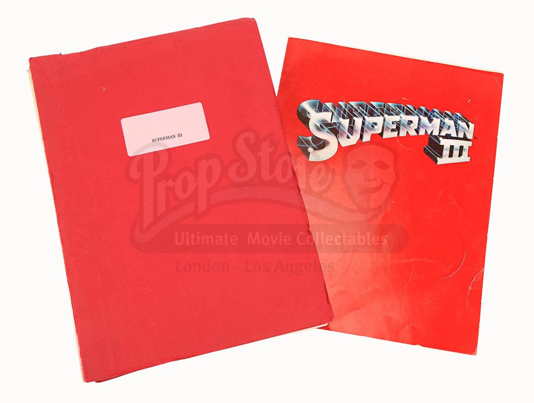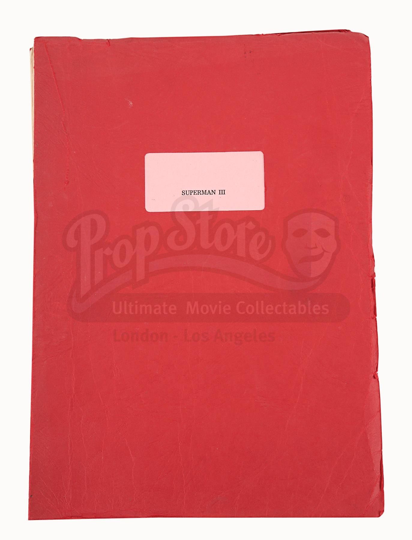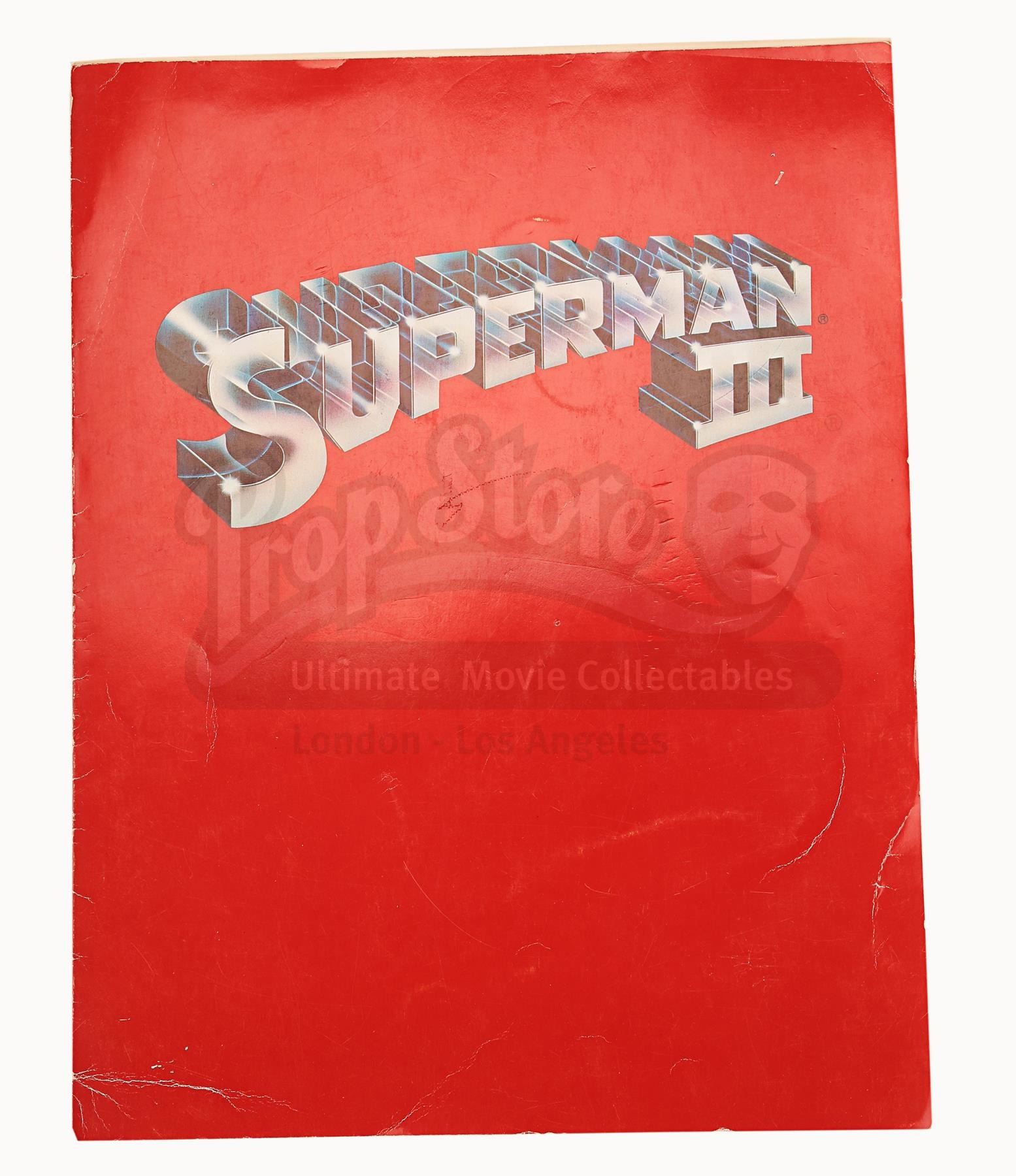 A production-used script and programme for Richard Lester's superhero sequel Superman III. Bound in a red card cover with metal butterfly fasteners, the script is a final draft with revisions dated "June 1982". Credited to David and Leslie Newman, it comprises 173 pages, including the title page, and has been printed on white and pink A4 paper. The bulk of the script is unannotated, but "David Wynn-Jones" is handwritten on the title page. Wynn-Jones was the zoptic front projection supervisor.