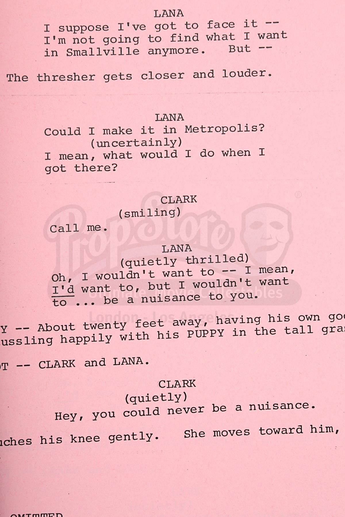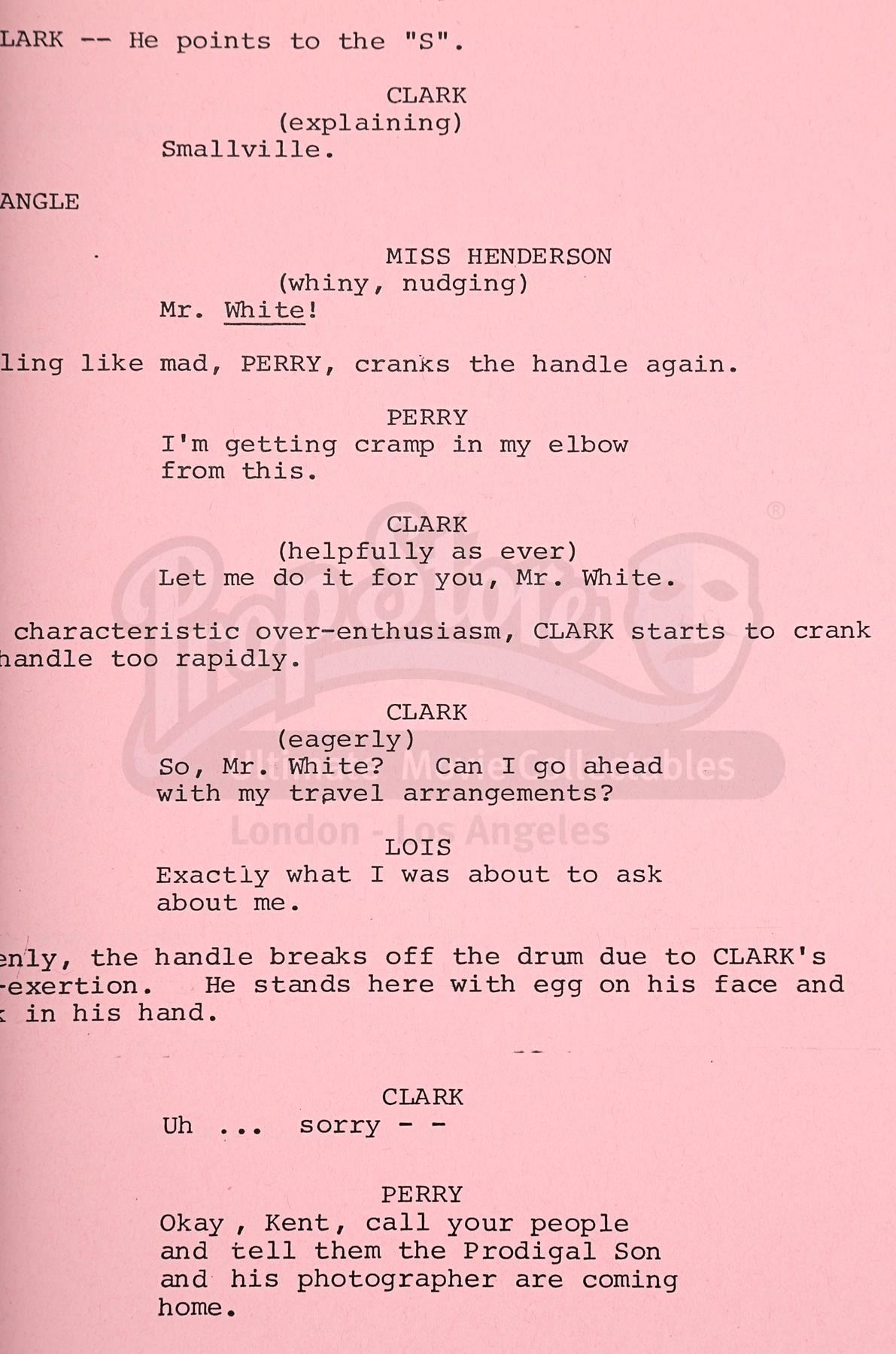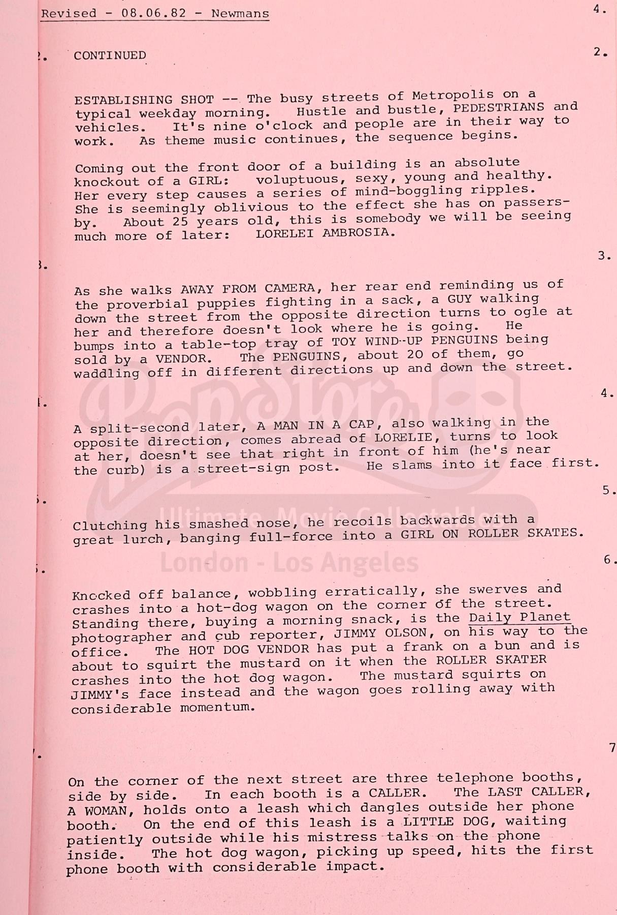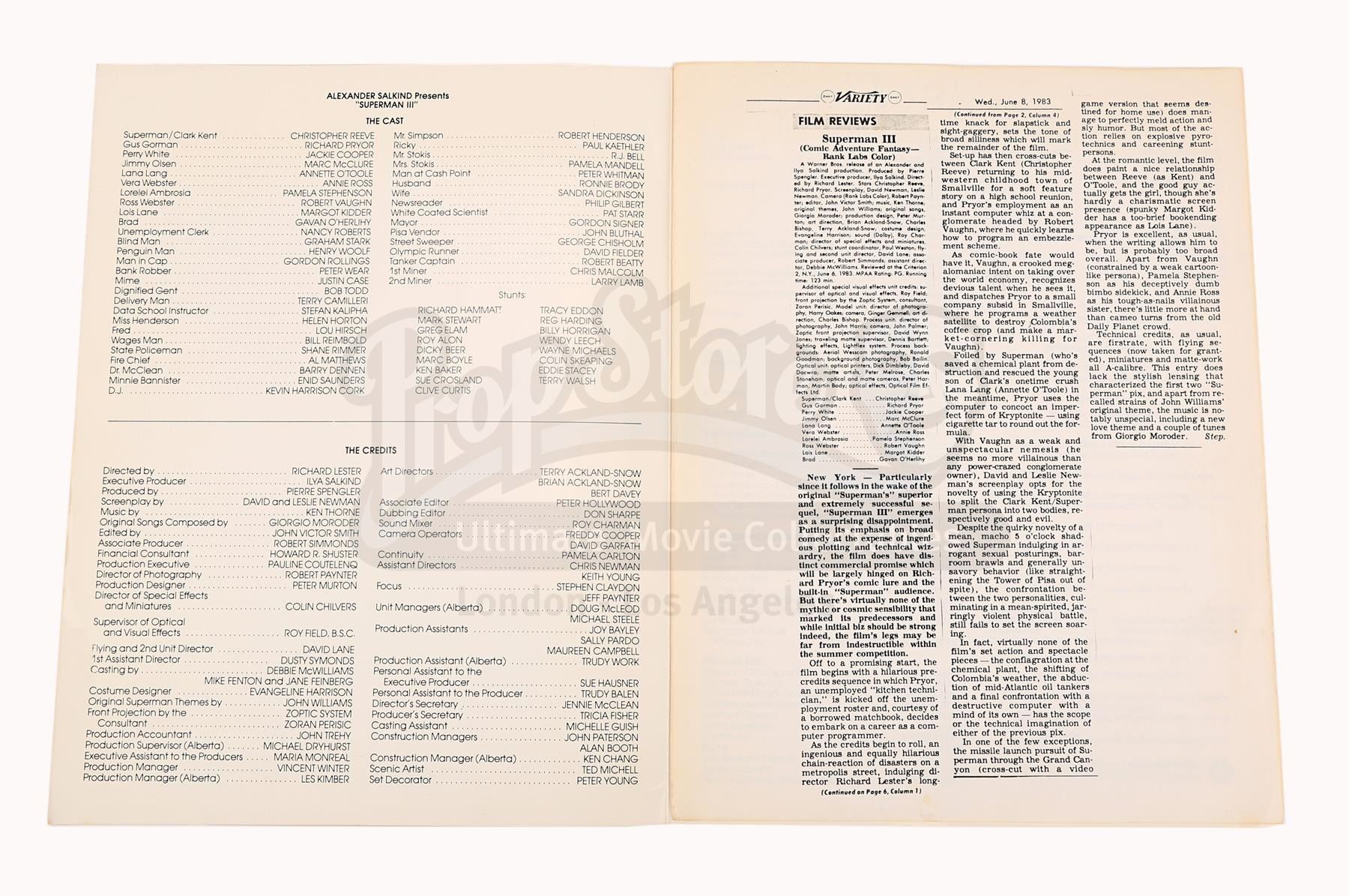 A production-used script and programme for Richard Lester's superhero sequel Superman III. Bound in a red card cover with metal butterfly fasteners, the script is a final draft with revisions dated "June 1982". Credited to David and Leslie Newman, it comprises 173 pages, including the title page, and has been printed on white and pink A4 paper. The bulk of the script is unannotated, but "David Wynn-Jones" is handwritten on the title page. Wynn-Jones was the zoptic front projection supervisor.
