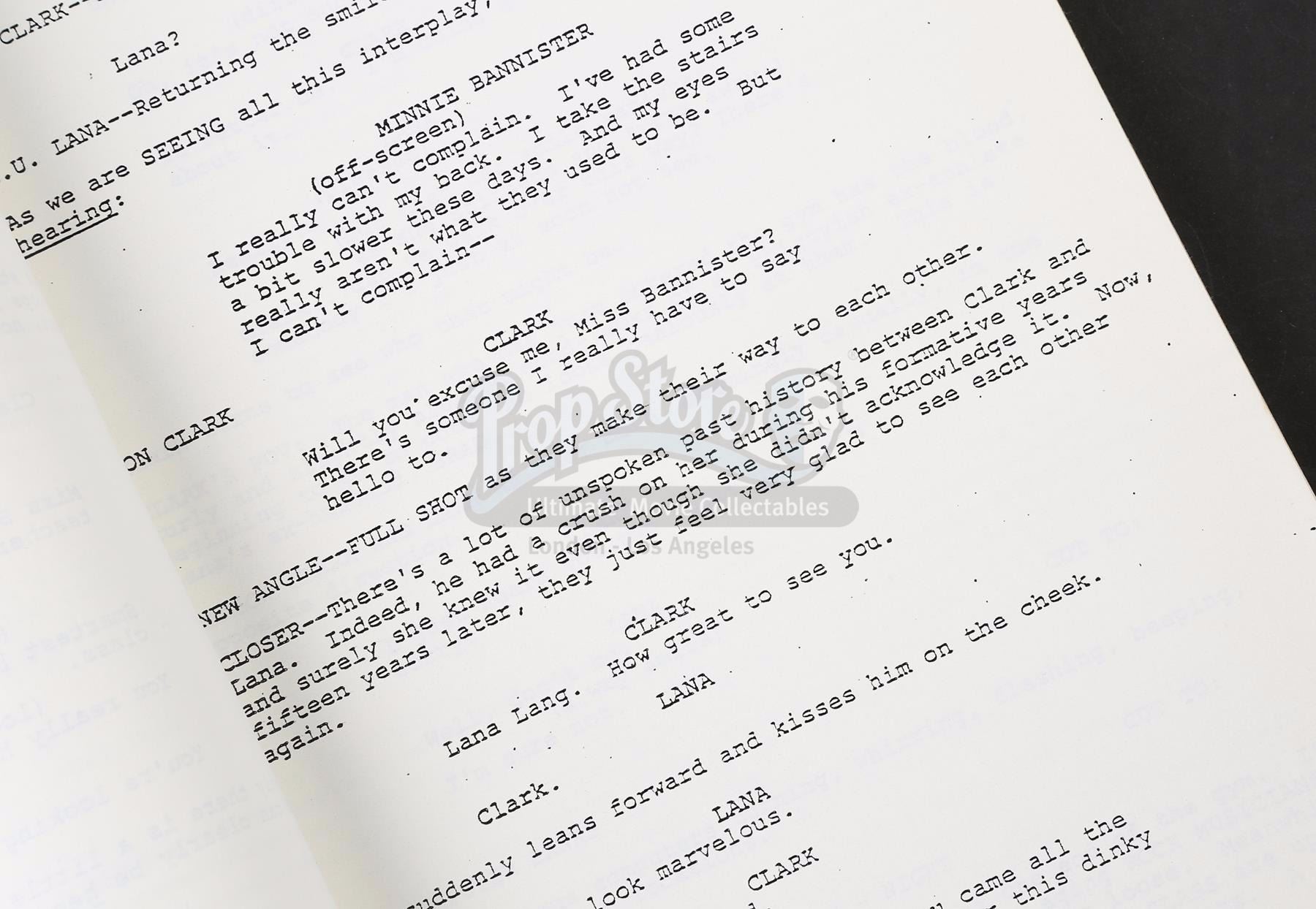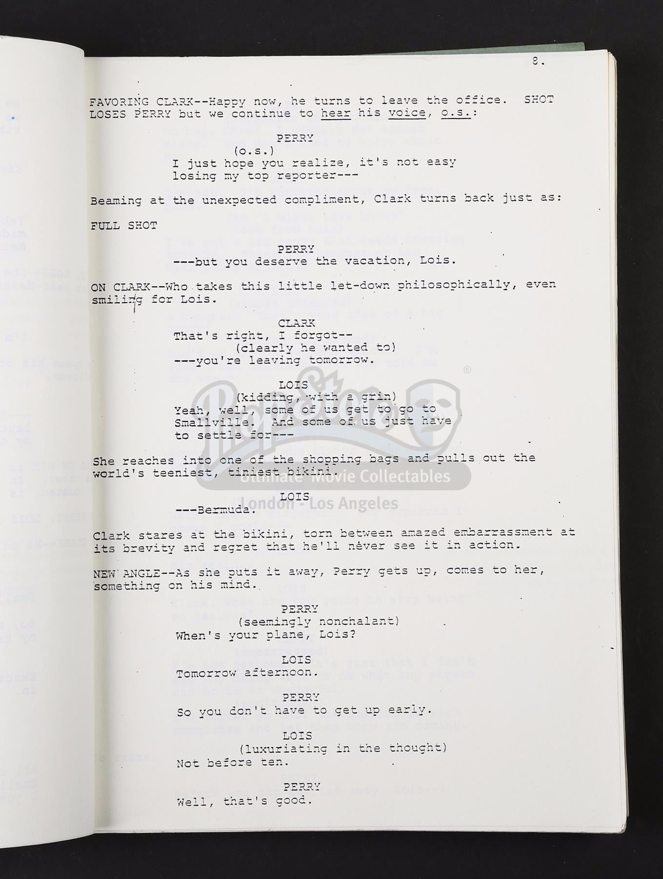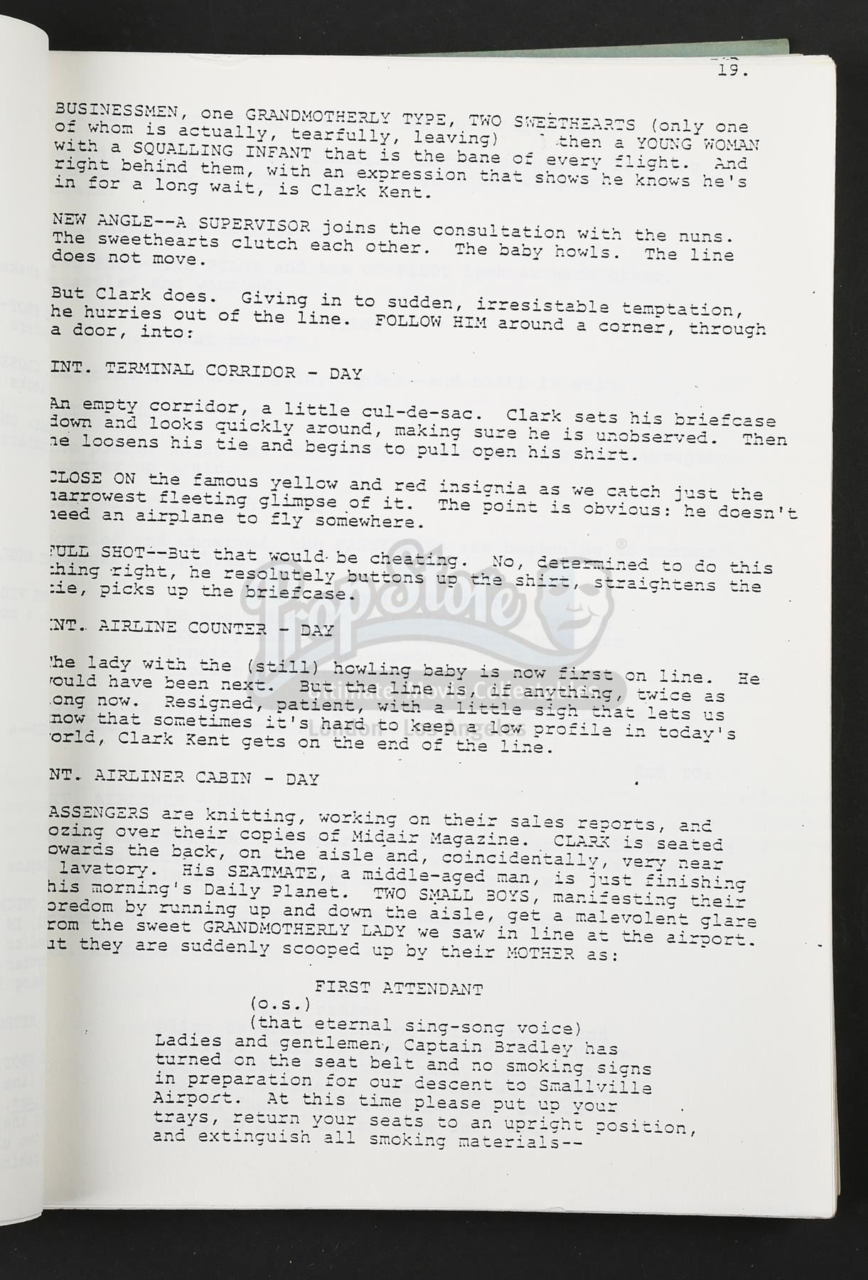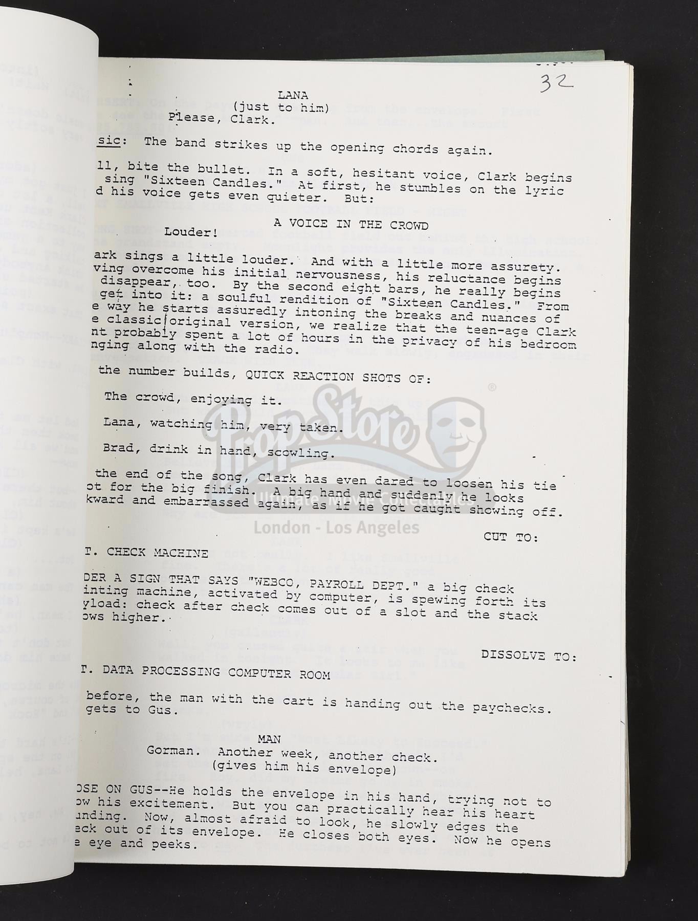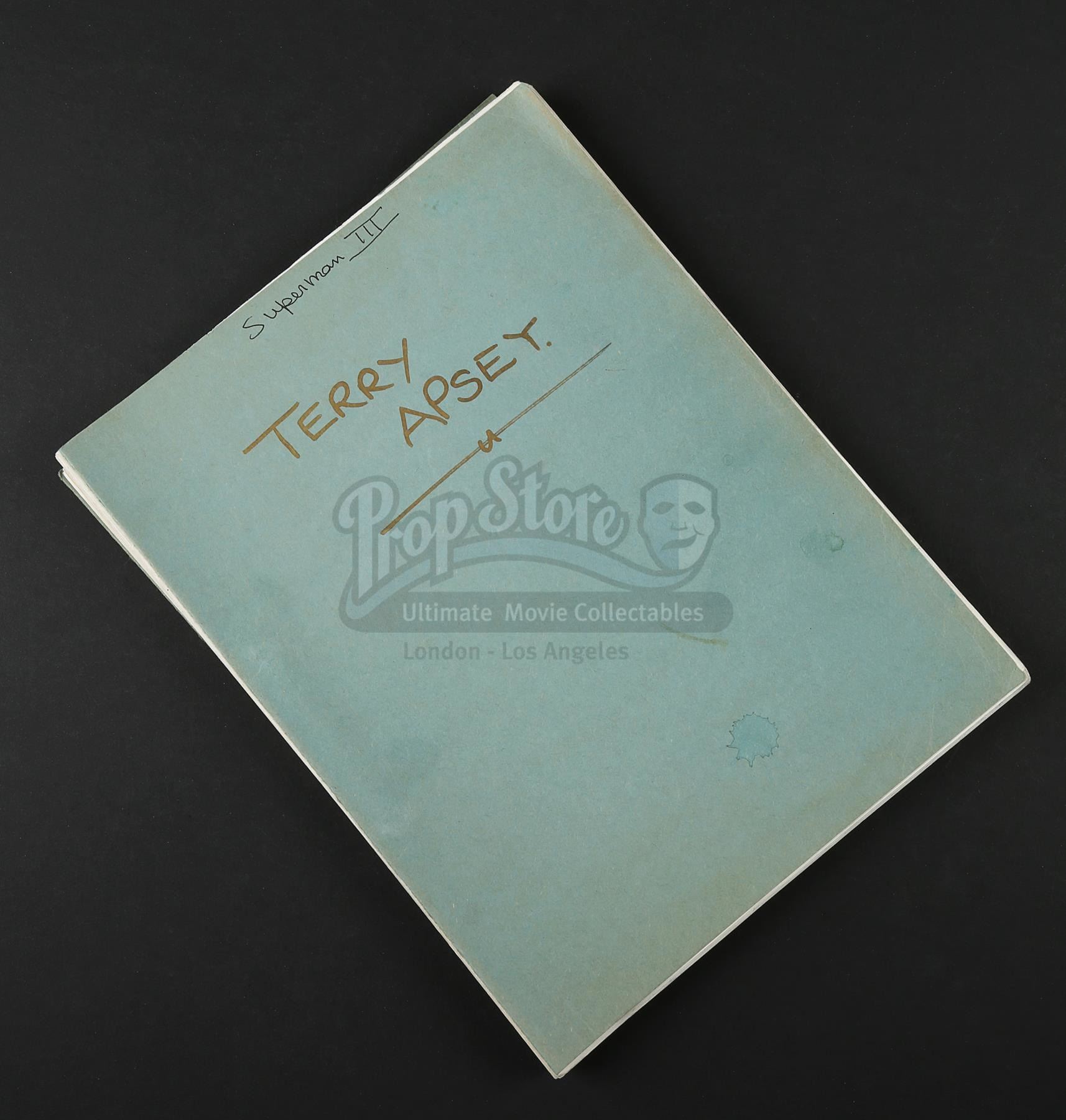 A production-used script from Richard Lester's superhero sequel Superman III. Written by David and Leslie Newman, this final-draft script is dated October 1981 and was issued to uncredited construction manager Terry Apsey. The script is bound in a blue card cover with script clips and contains 161 US Letter-sized pages printed on white paper. Displaying only minor folds and wear at the edges of the pages, with some minor water marks to the front cover from production use, it remains in overall good condition. Dimensions: 28 cm x 22 cm x 2 cm (11'' x 8 3/4'' x 3/4'')