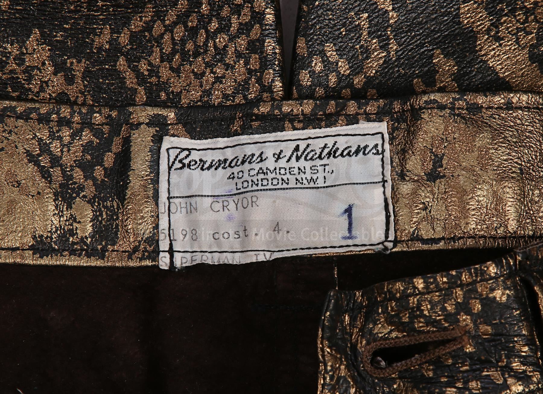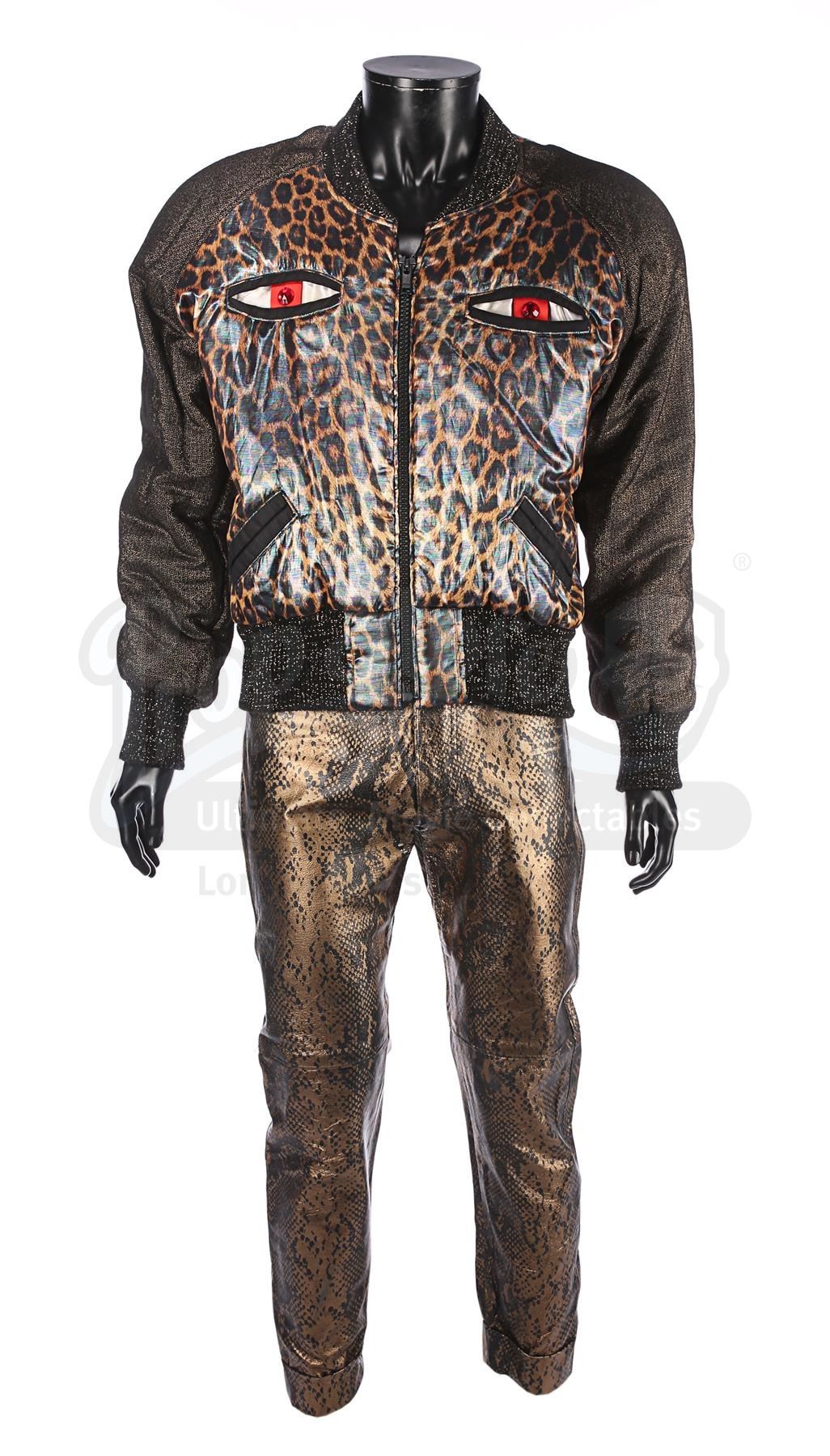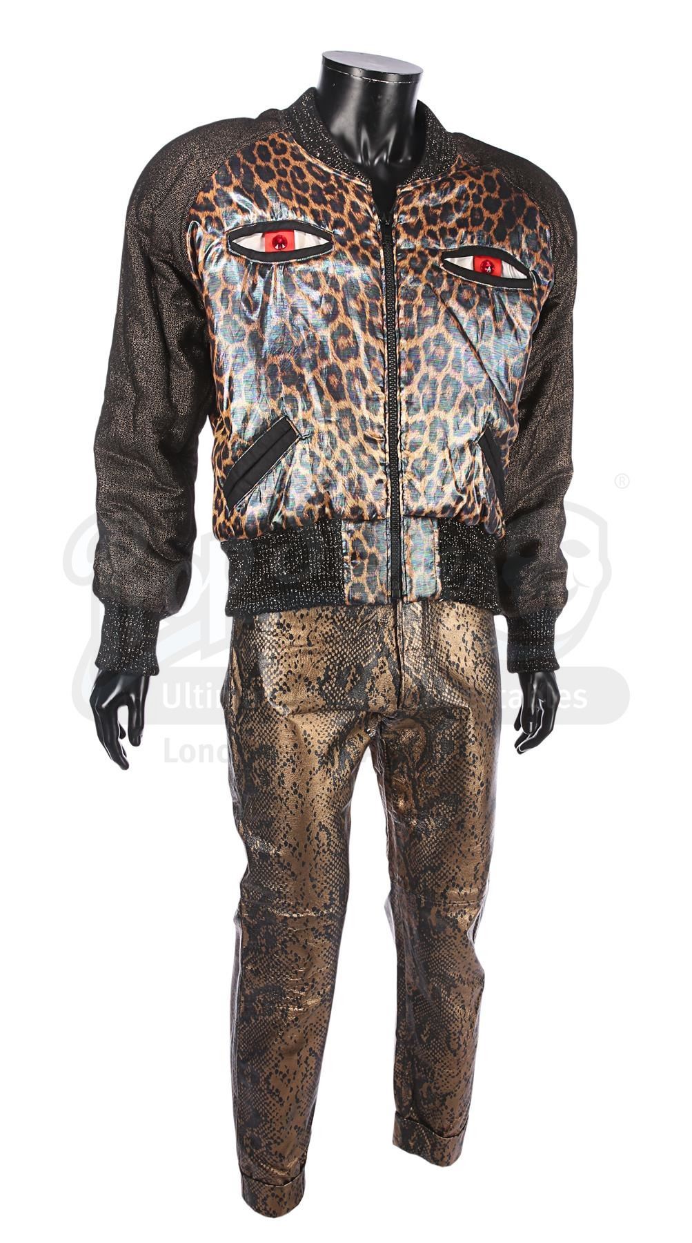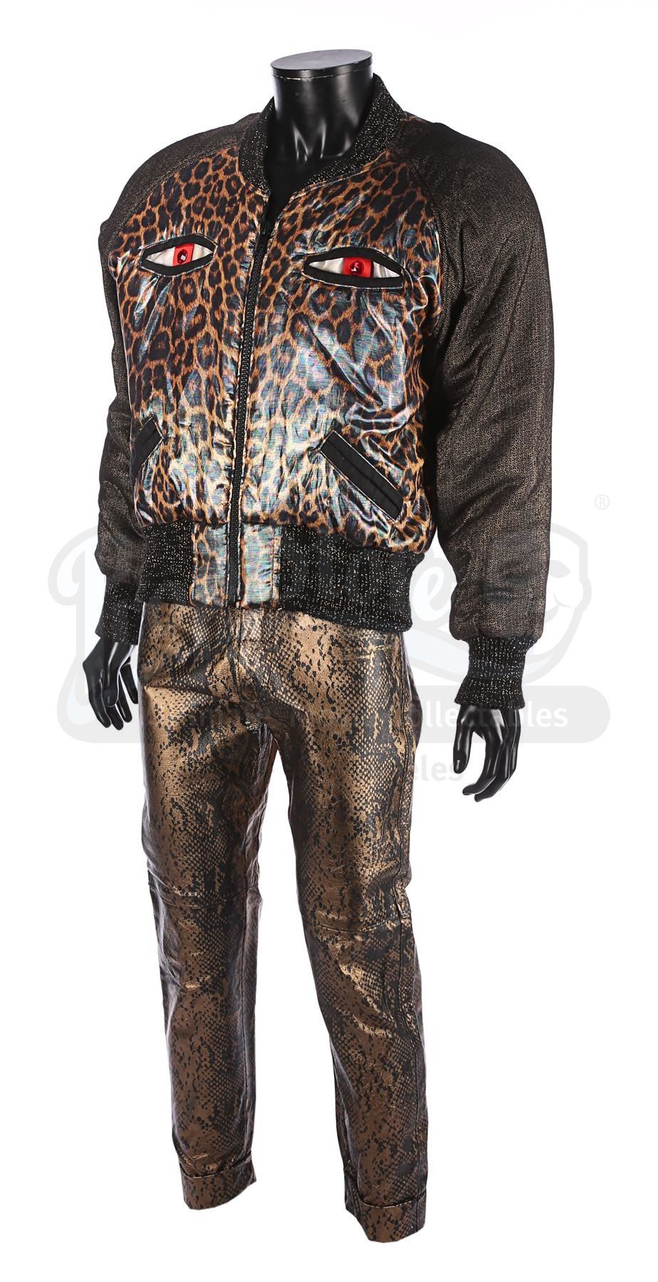 The jacket features a shiny leopard-face design with a pearlescent finish. Its two breast pockets form the leopard's eyes. The trousers are styled to look like reptile skin with a golden finish. Each item contains a Berman's & Nathan's label, which reads "John Cryor [sic] 5198 cost. 4. Superman IV". The clothes exhibit some wear from production use, including plucked stitching and some scuffing on the trousers.