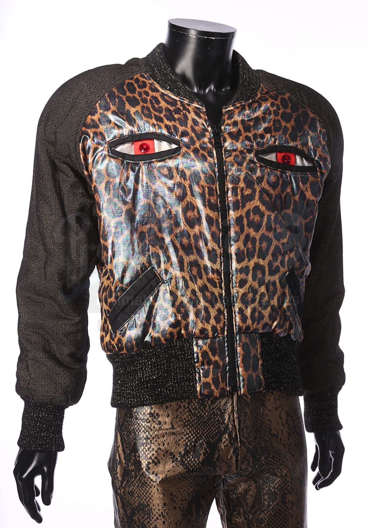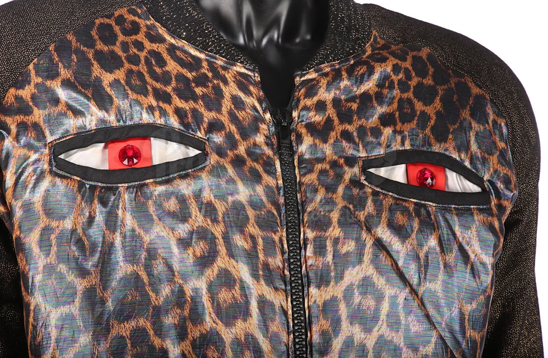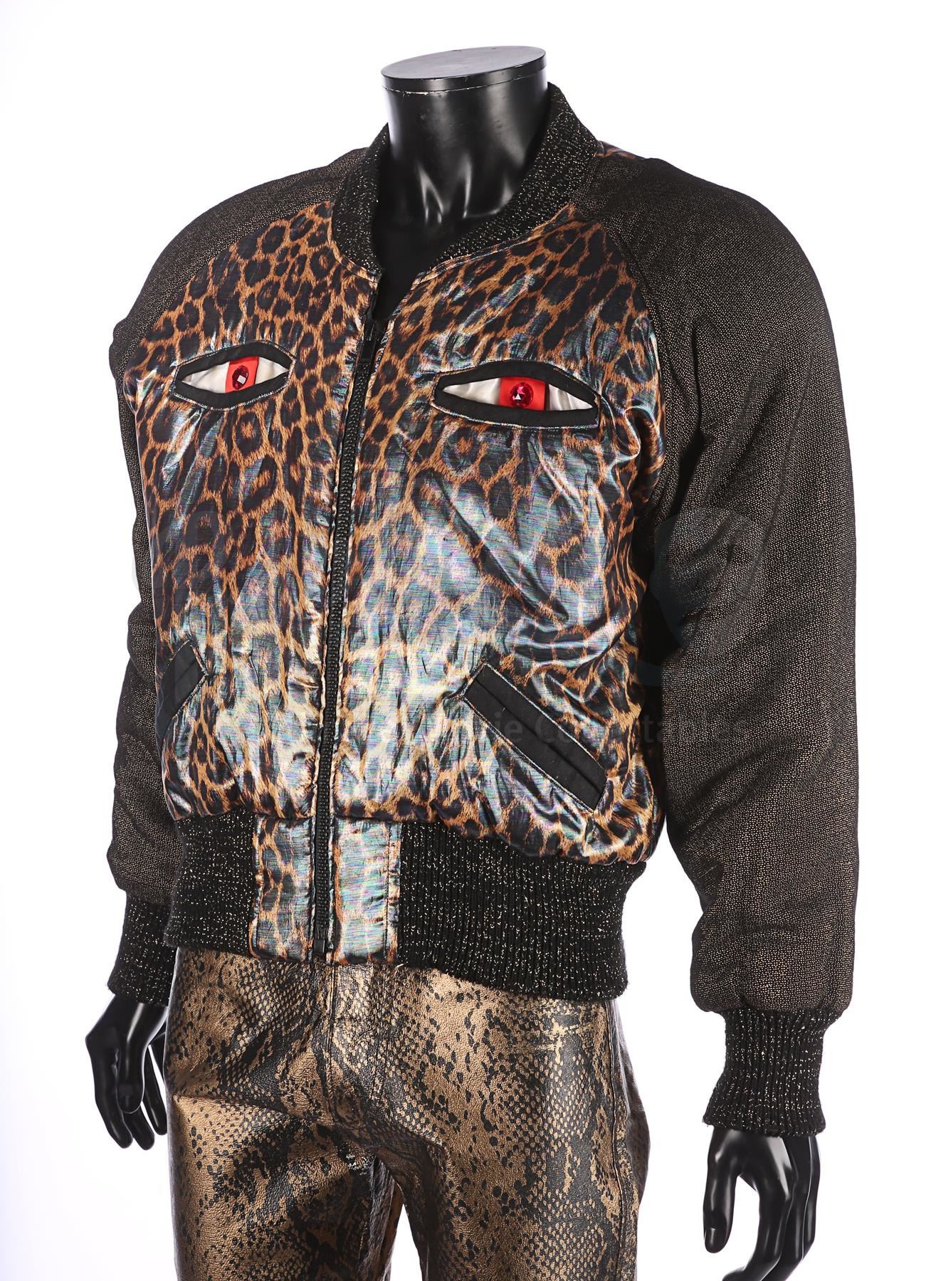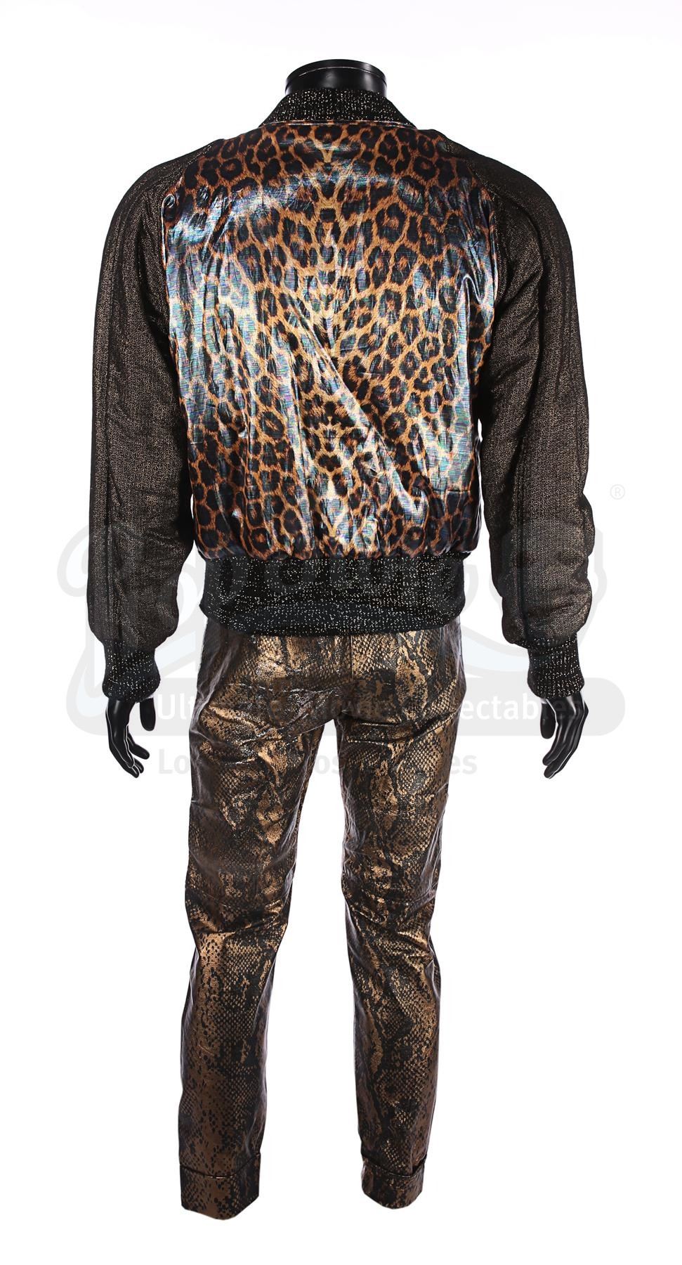 The jacket features a shiny leopard-face design with a pearlescent finish. Its two breast pockets form the leopard's eyes. The trousers are styled to look like reptile skin with a golden finish. Each item contains a Berman's & Nathan's label, which reads "John Cryor [sic] 5198 cost. 4. Superman IV". The clothes exhibit some wear from production use, including plucked stitching and some scuffing on the trousers.