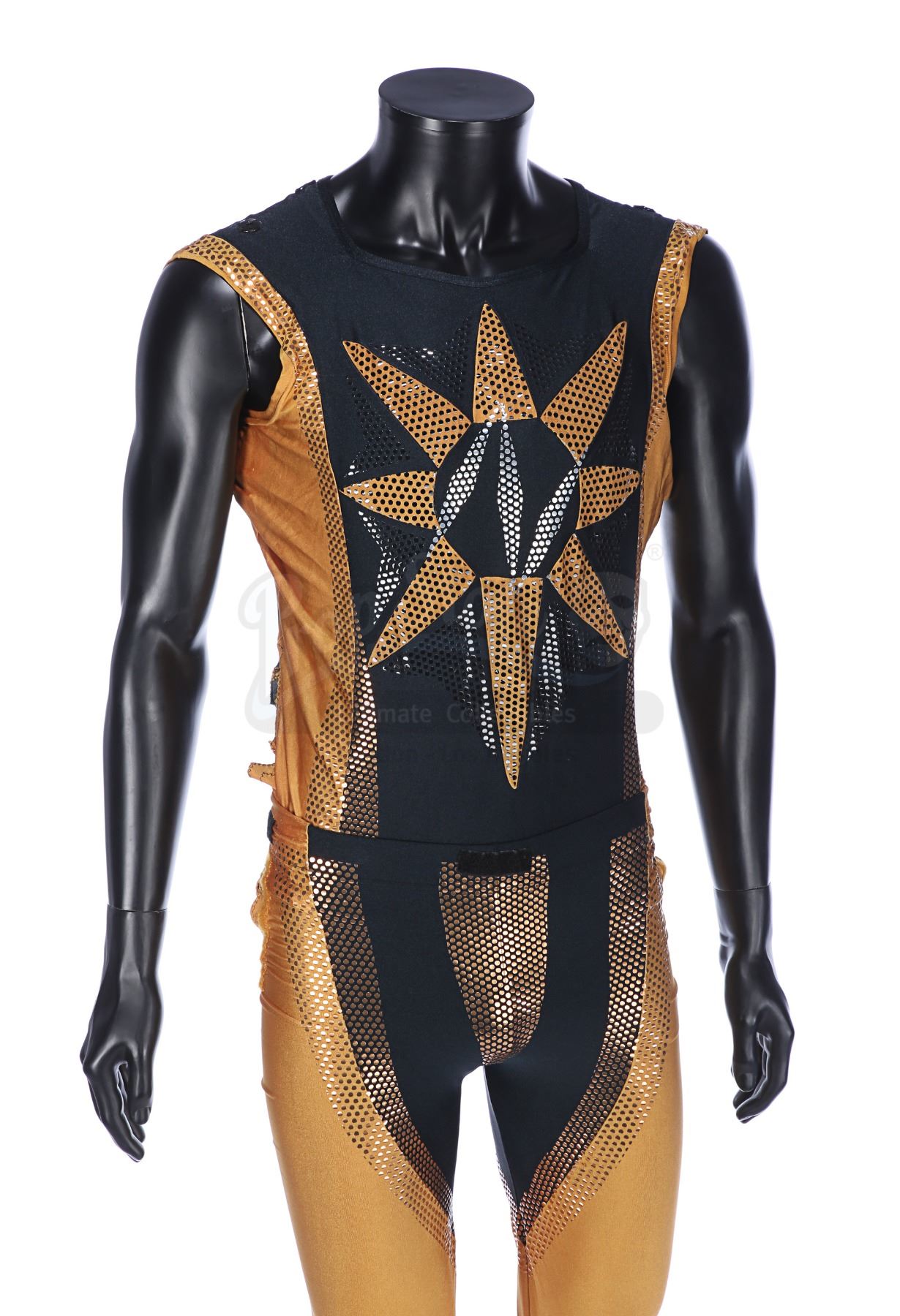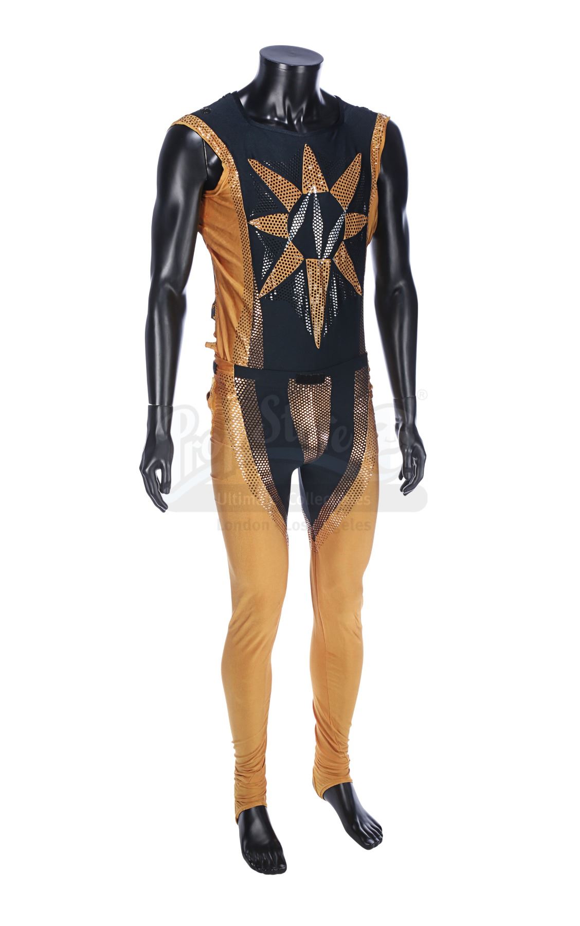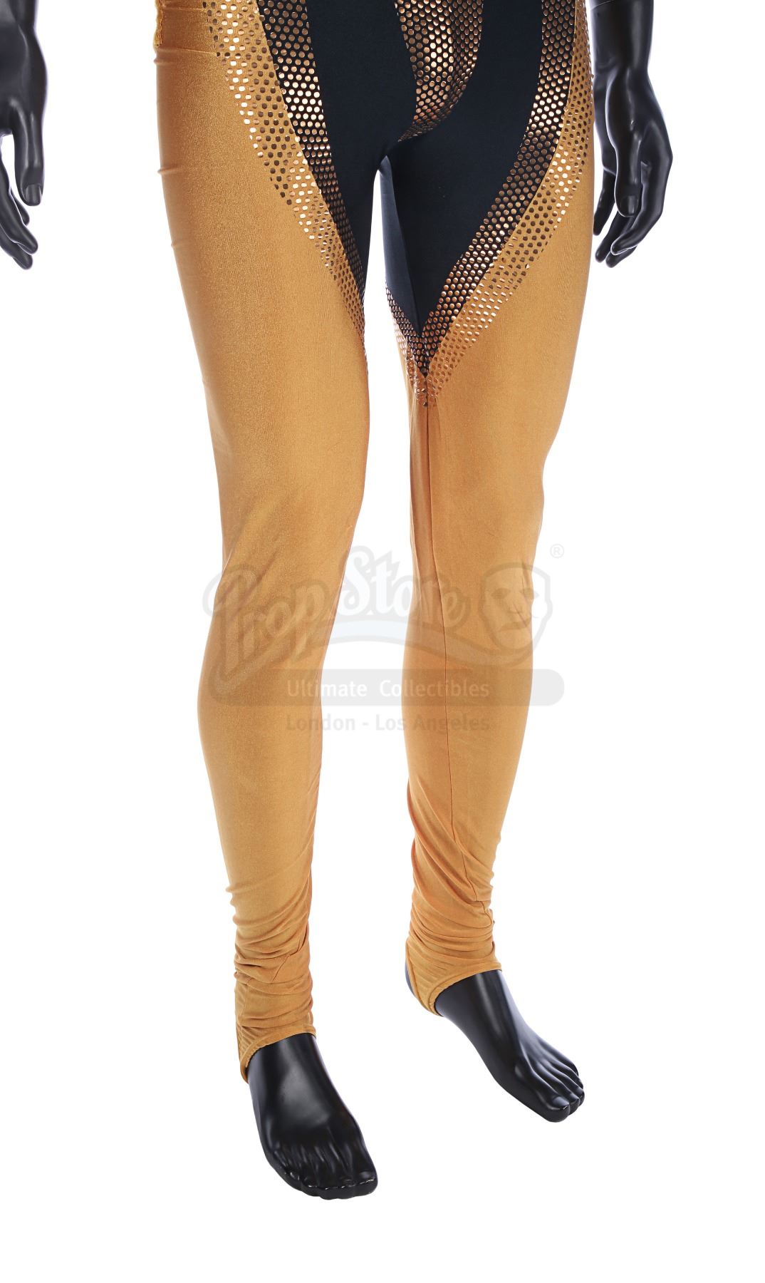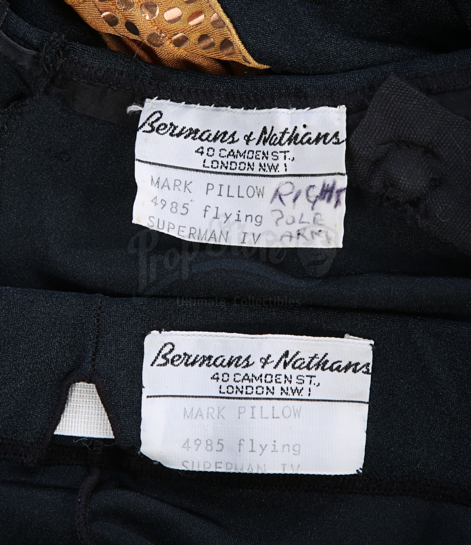 Created for the film's flight sequences, the custom gold-and-black leotard features an "N" in silver dots inside a star emblem. Four poppers run along the shoulders where the cape was attached. Made from matching fabric, the leggings display elasticated stirrups and Velcro patches around the waist. Bermans & Nathans labels inside both garments read "Mark Pillow 4985 flying Superman IV", with handwritten text reading "Right Pole Arm" in the leotard. Slits are present on the leggings for the attachment of a harness. The costume displays minor wear, dirt marks and comes with a wardrobe tag.