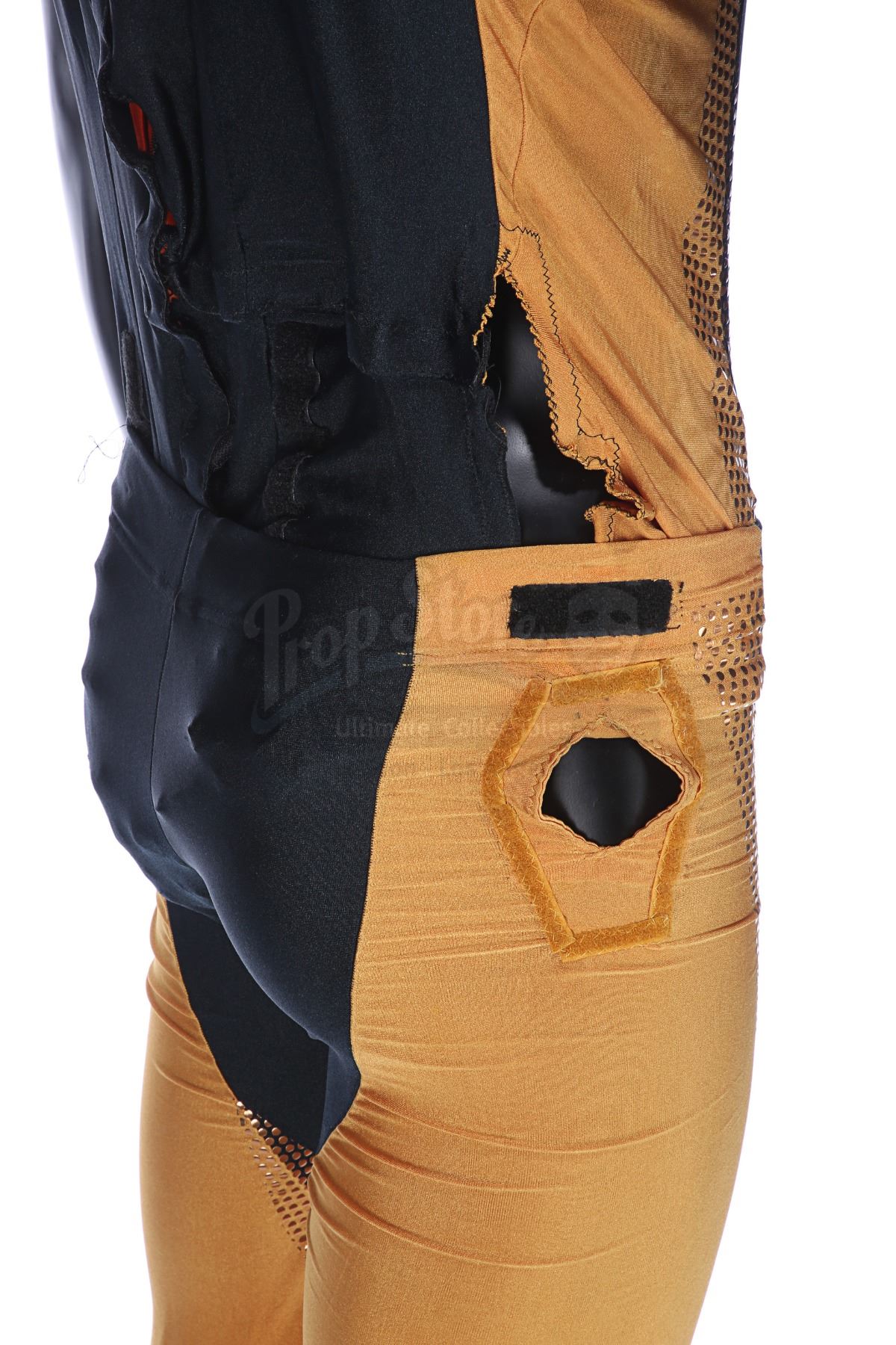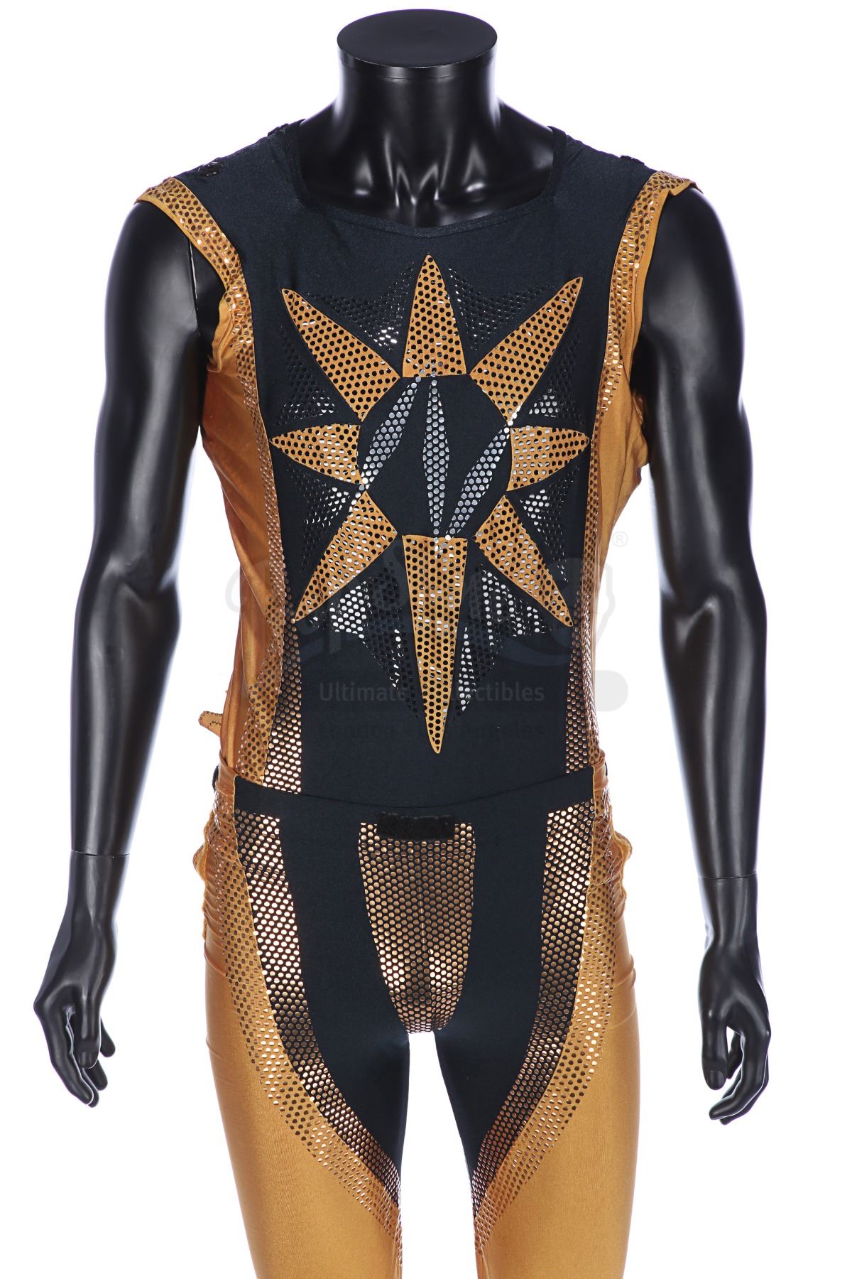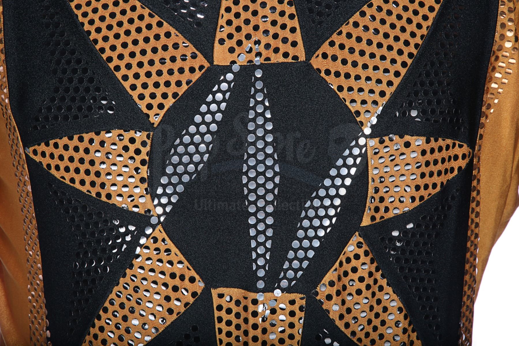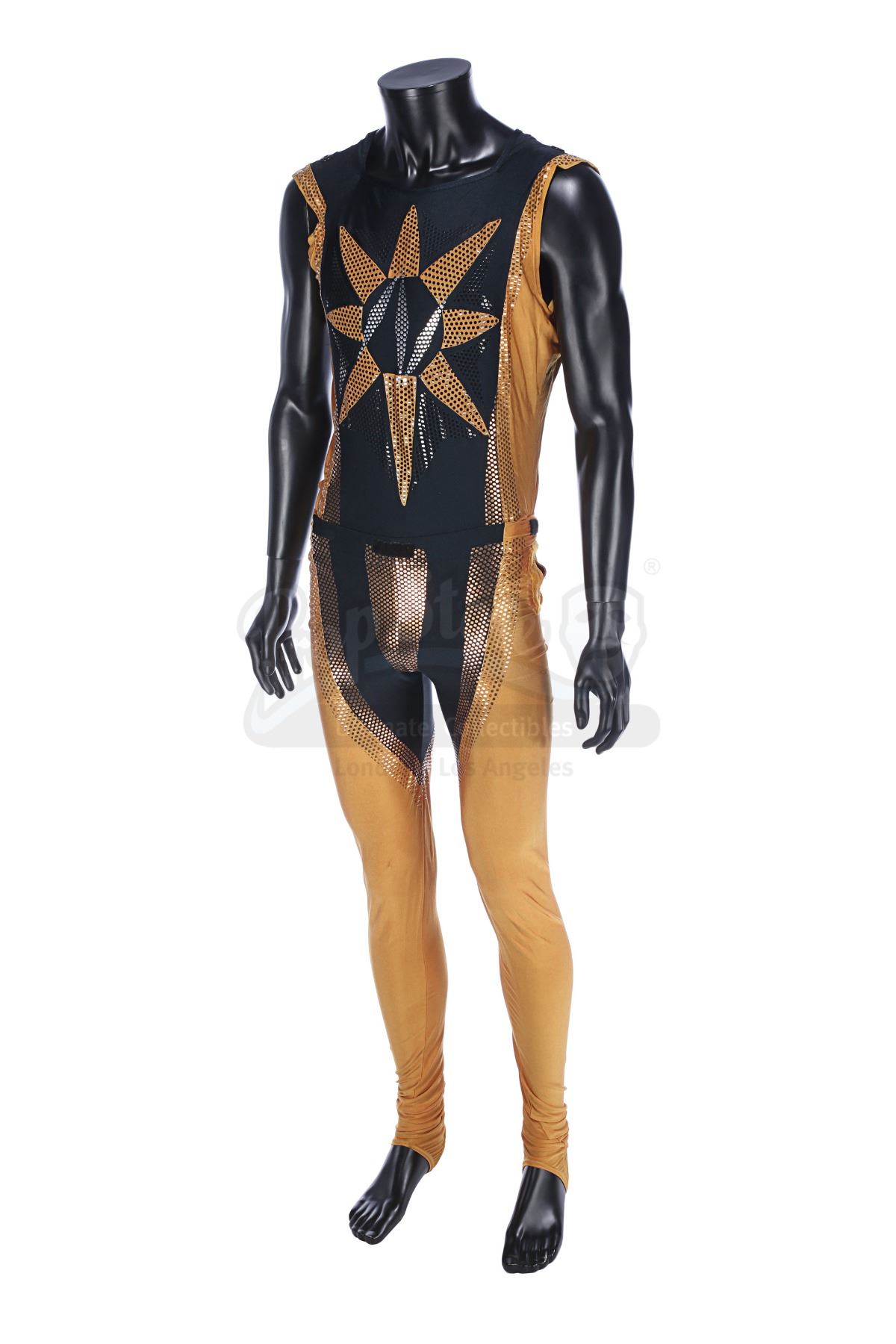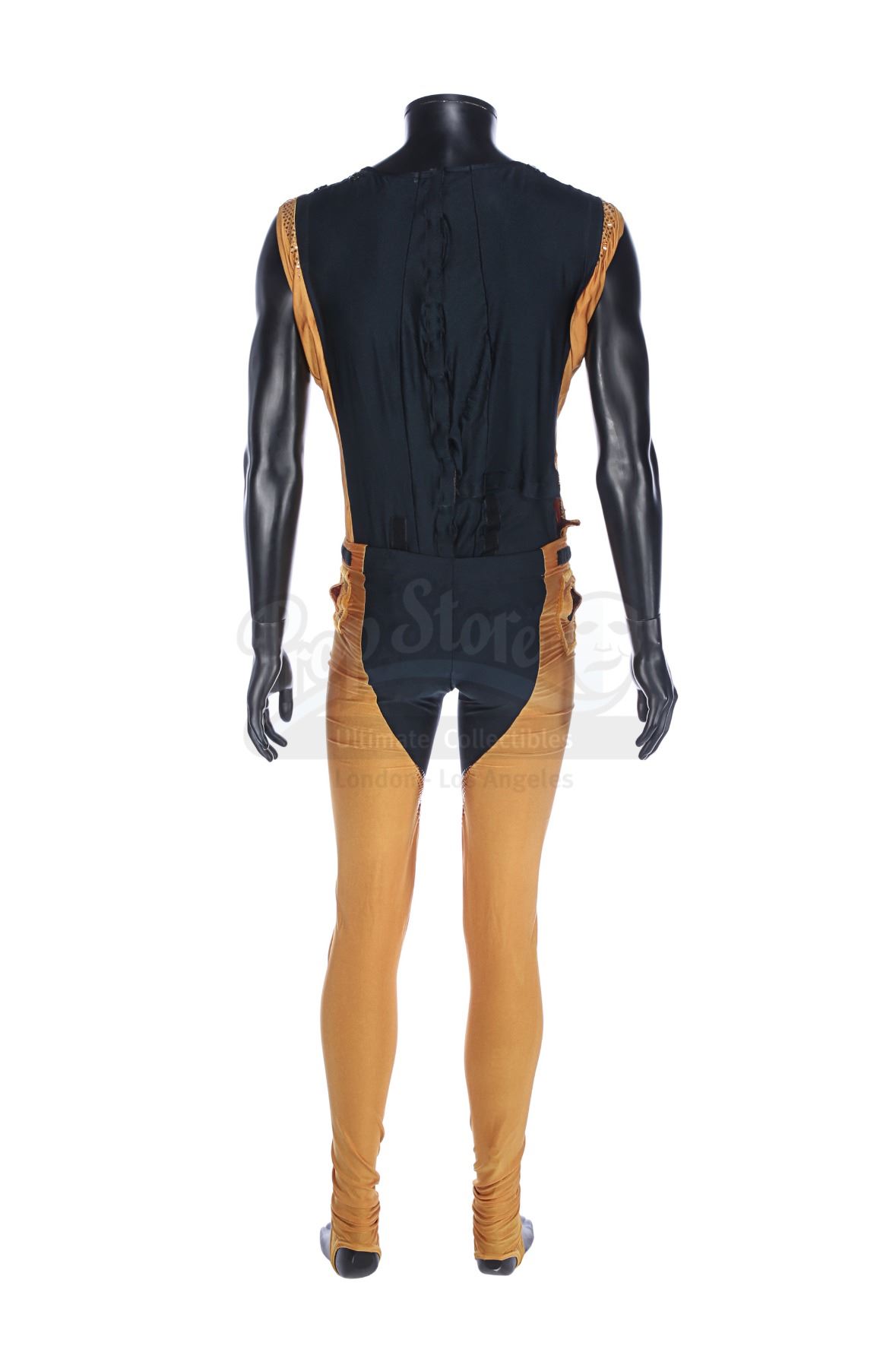 Created for the film's flight sequences, the custom gold-and-black leotard features an "N" in silver dots inside a star emblem. Four poppers run along the shoulders where the cape was attached. Made from matching fabric, the leggings display elasticated stirrups and Velcro patches around the waist. Bermans & Nathans labels inside both garments read "Mark Pillow 4985 flying Superman IV", with handwritten text reading "Right Pole Arm" in the leotard. Slits are present on the leggings for the attachment of a harness. The costume displays minor wear, dirt marks and comes with a wardrobe tag.