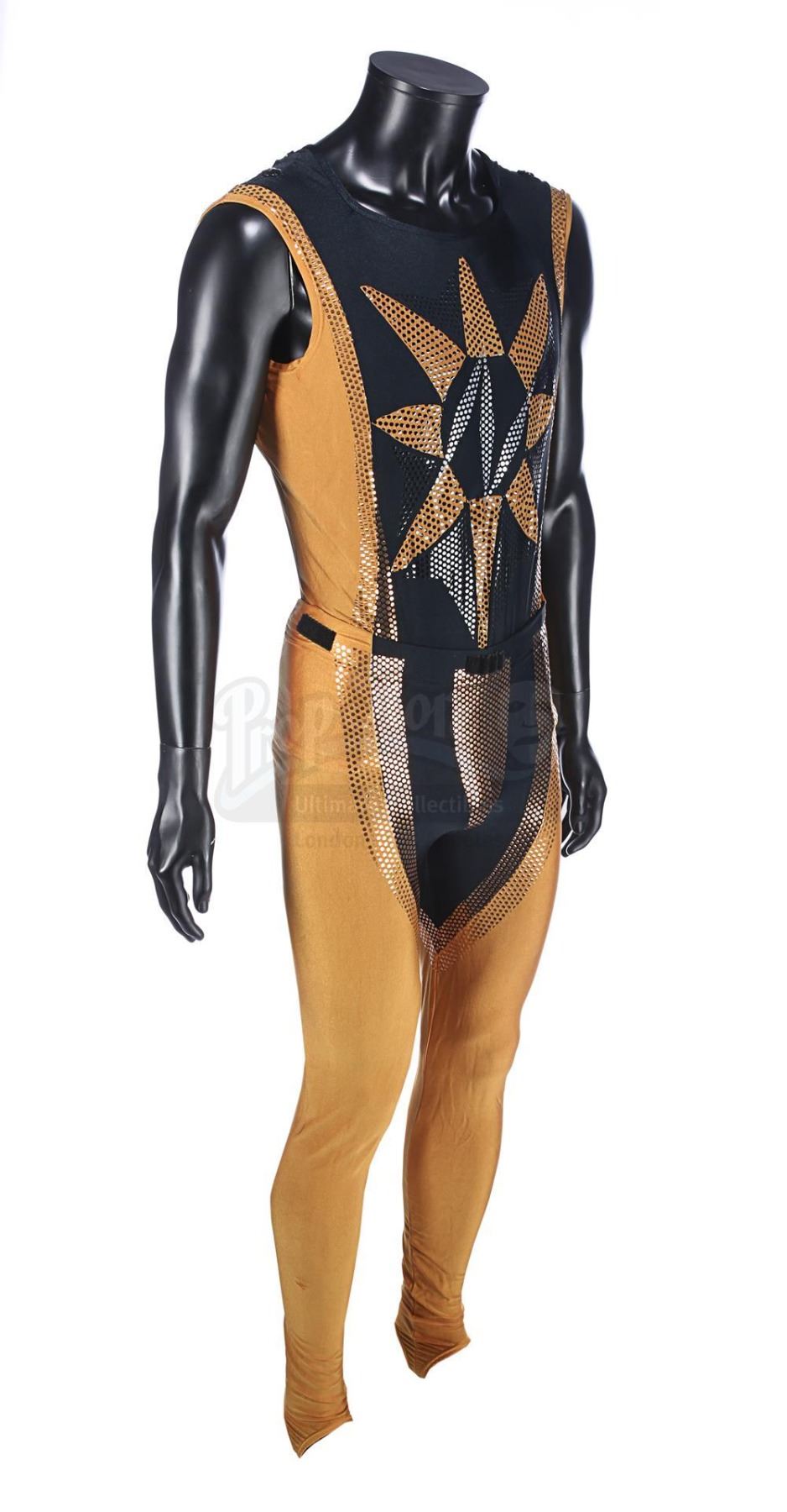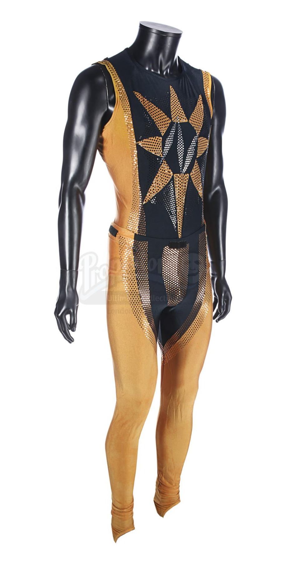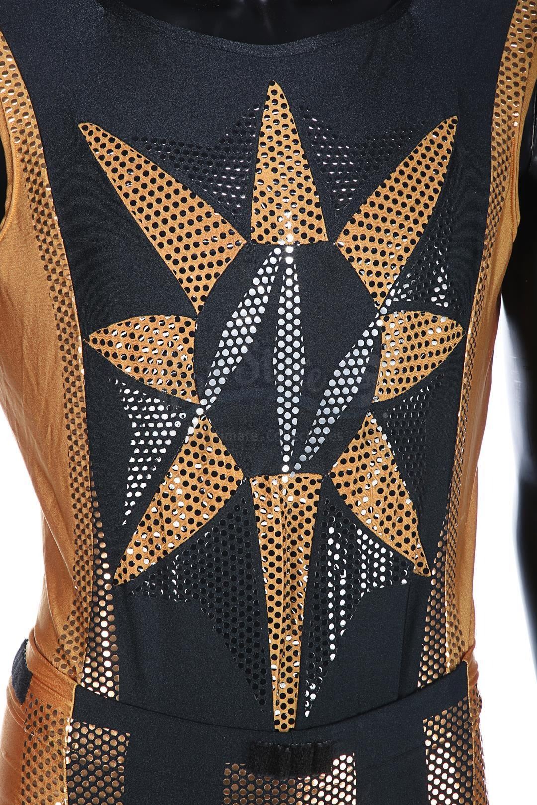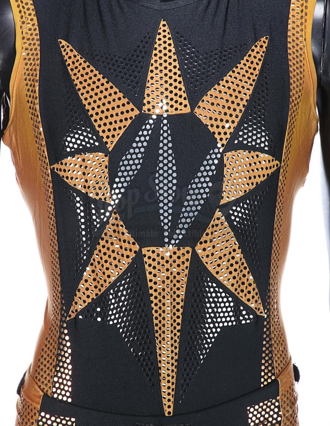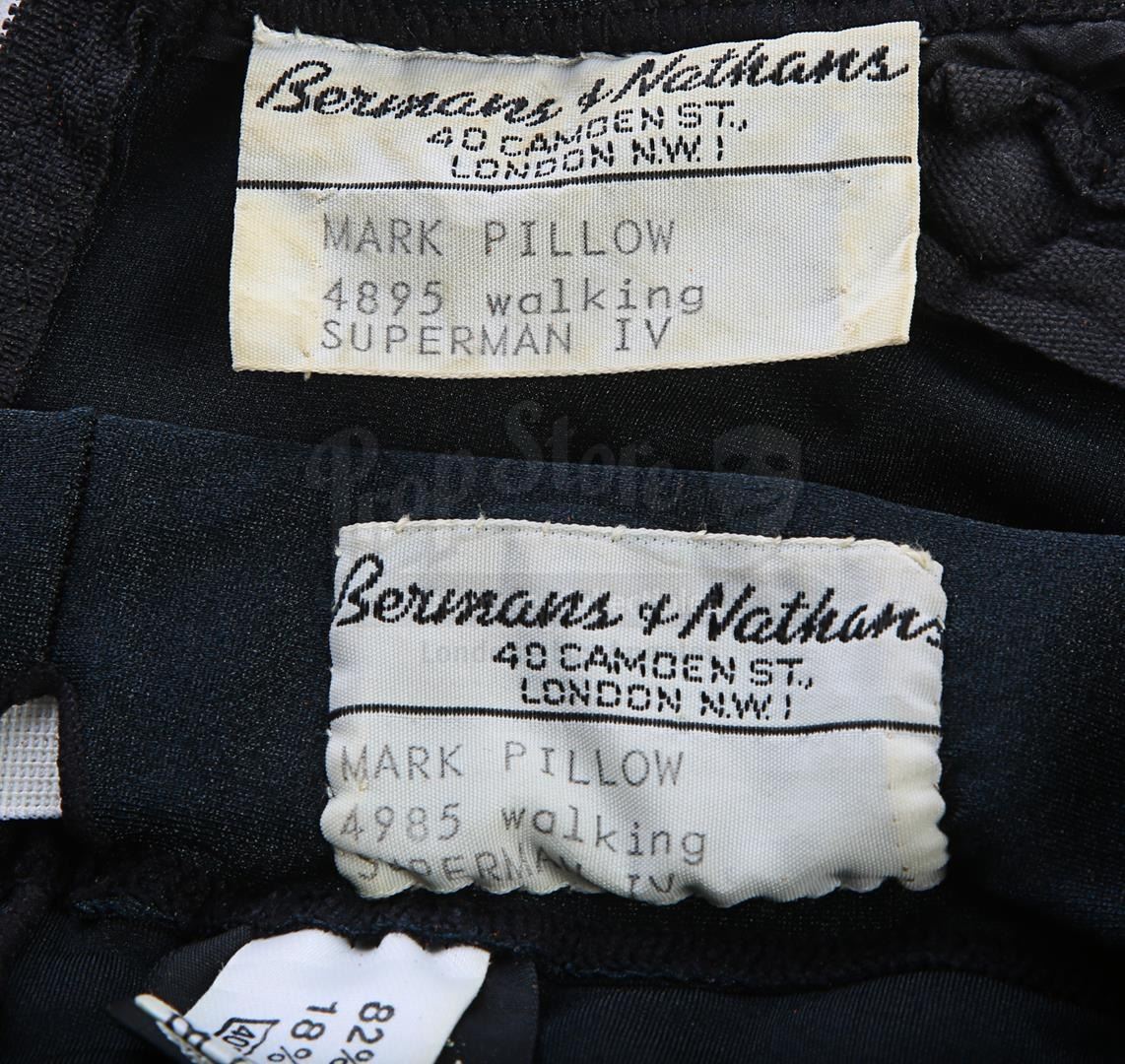 Each gold-and-black elasticated tunic is adorned with an "N" design in silver dots on the front, and the tunic is held in place during wear by Velcro running down the back and under the crotch. Bermans & Nathans labels inside the garments read "Mark Pillow 4985 walking Superman IV". "Left Pole Arm" is also handwritten on one of the tunic labels. Four metal poppers run along the shoulders of the tunics, where Nuclear Man's cape was attached. The leggings are made of the same material, with Velcro patches around the waistband. The costumes show very minor wear from production use and age, and remain in very good condition.