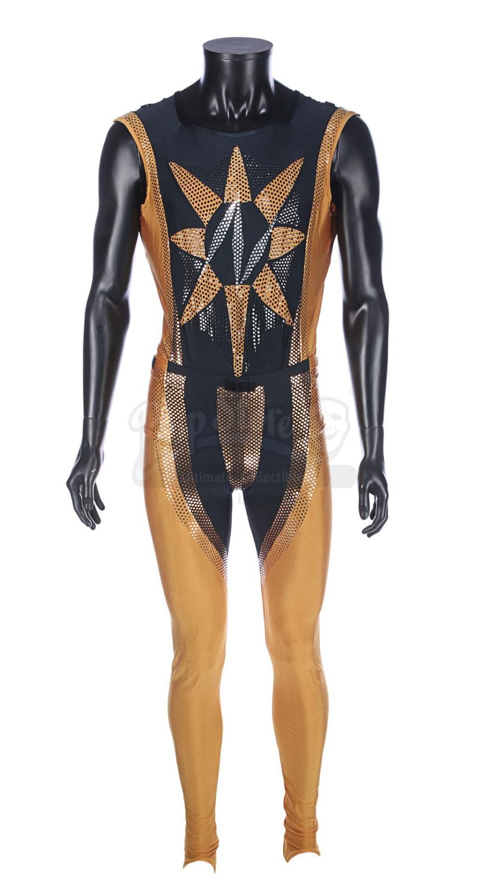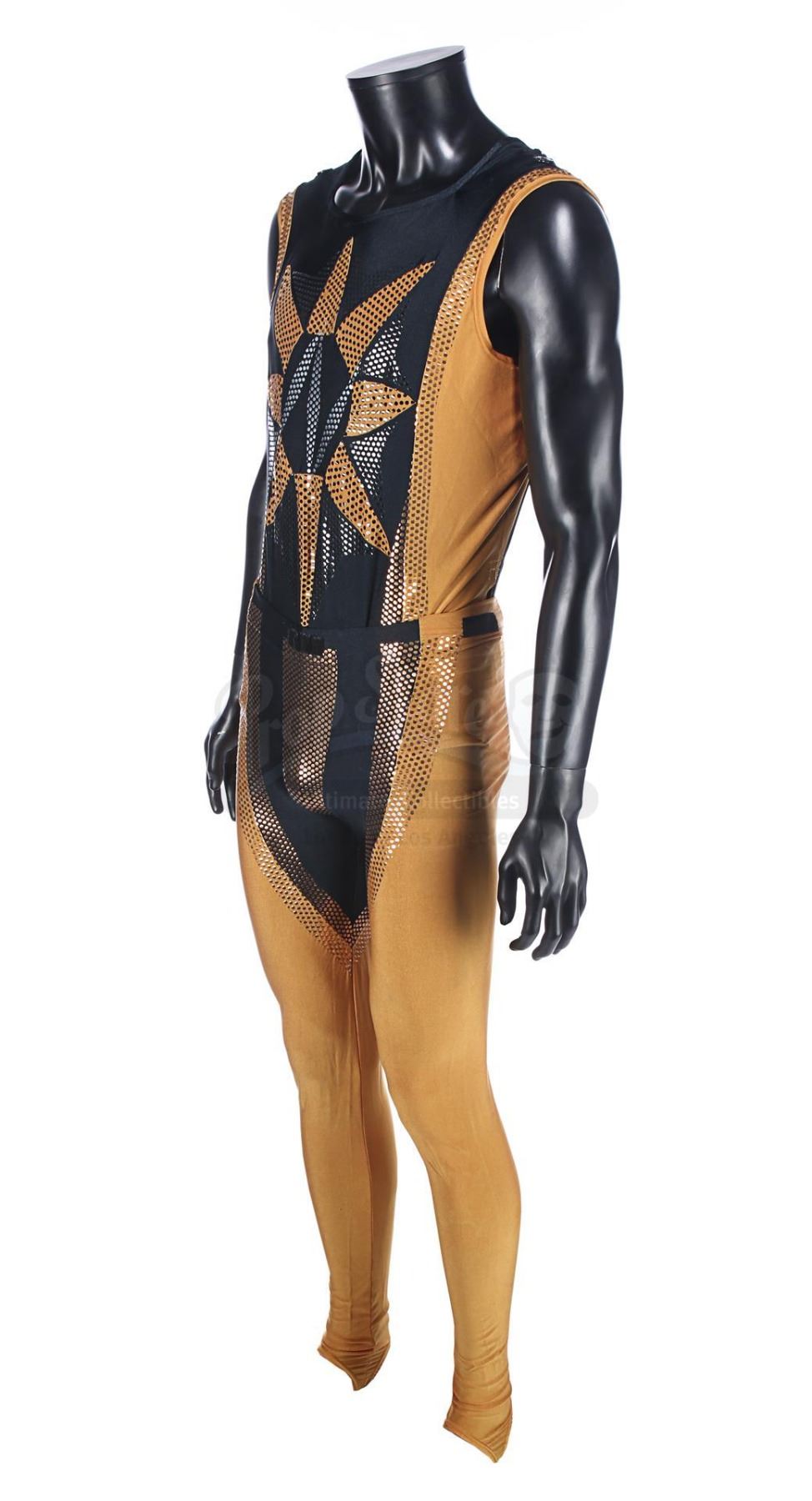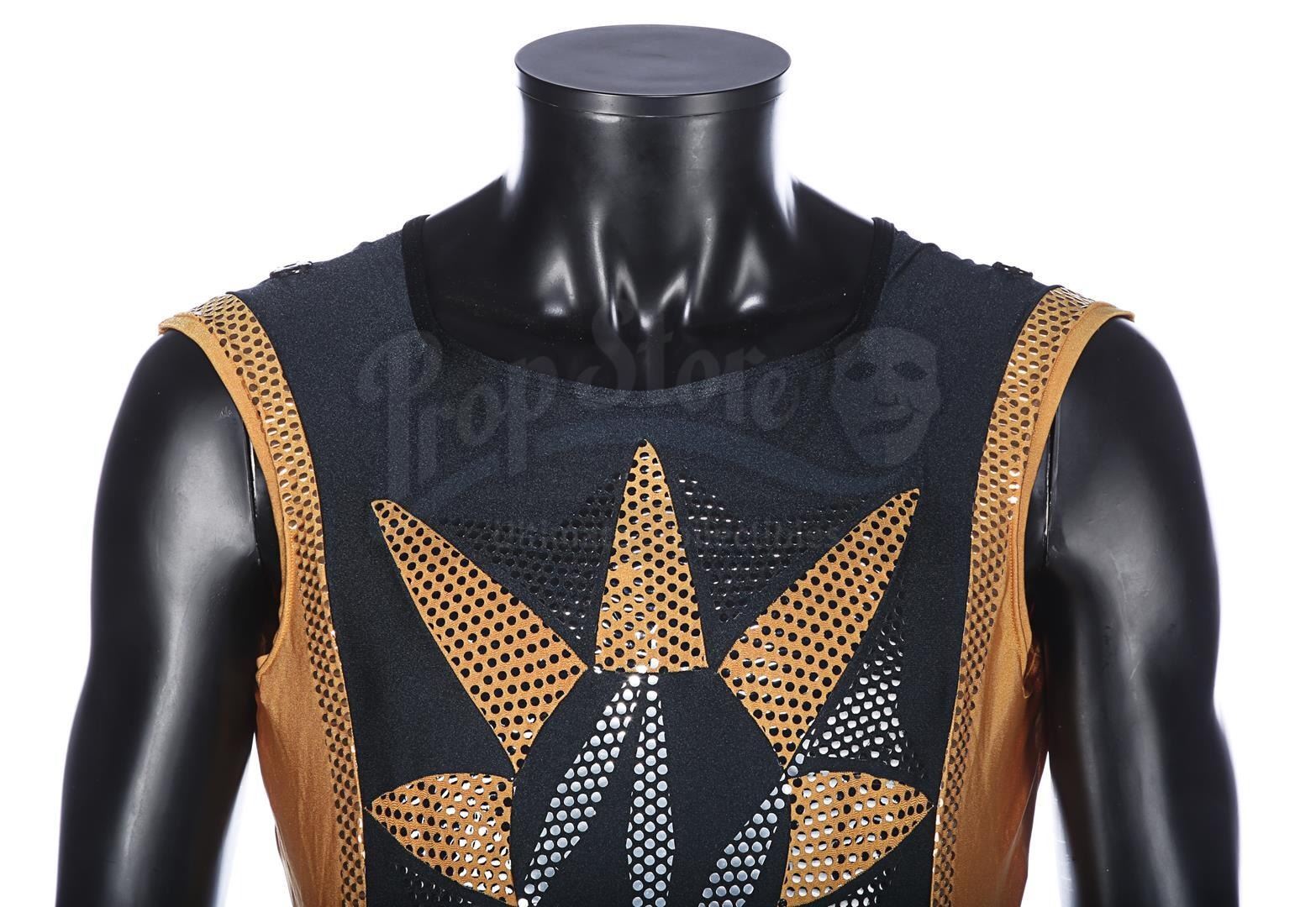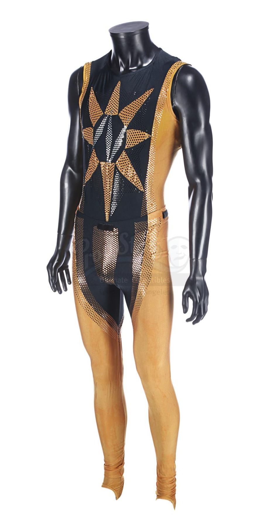 Each gold-and-black elasticated tunic is adorned with an "N" design in silver dots on the front, and the tunic is held in place during wear by Velcro running down the back and under the crotch. Bermans & Nathans labels inside the garments read "Mark Pillow 4985 walking Superman IV". "Left Pole Arm" is also handwritten on one of the tunic labels. Four metal poppers run along the shoulders of the tunics, where Nuclear Man's cape was attached. The leggings are made of the same material, with Velcro patches around the waistband. The costumes show very minor wear from production use and age, and remain in very good condition.