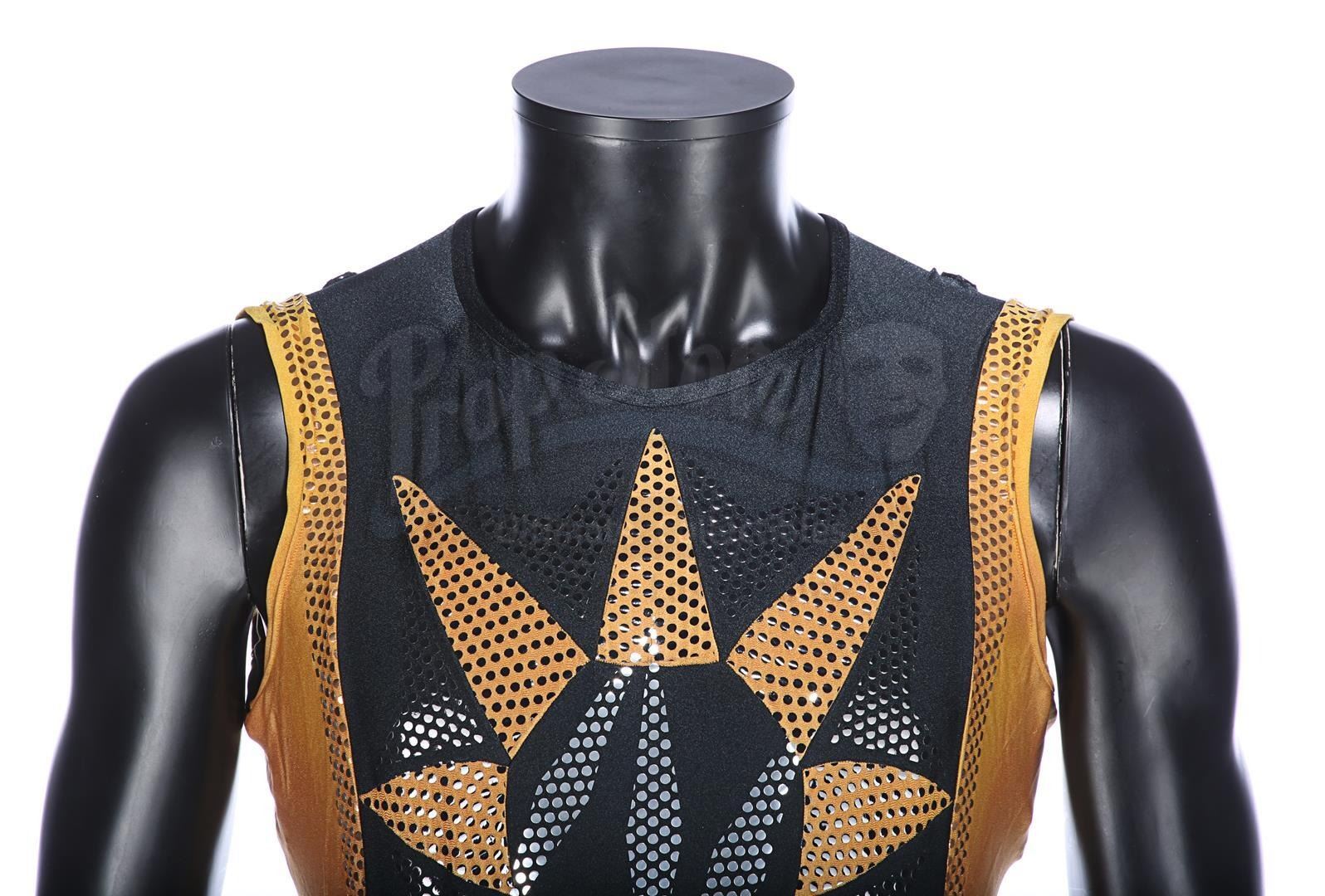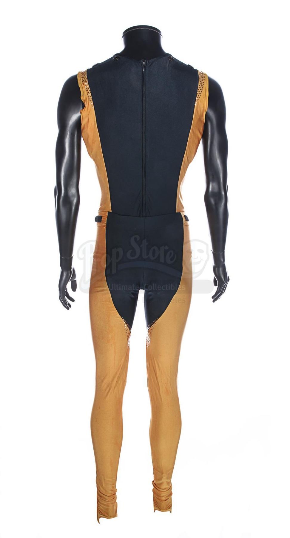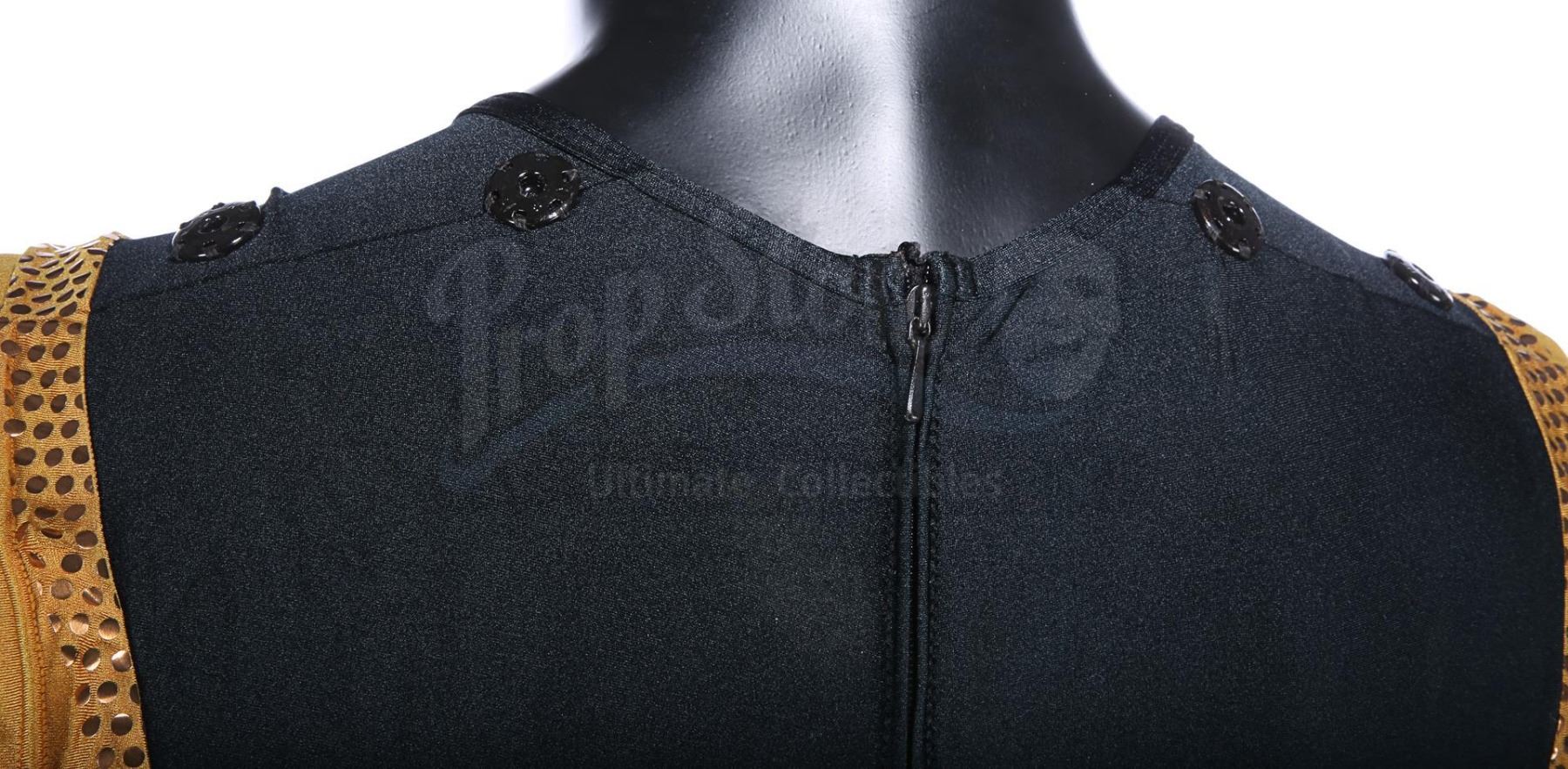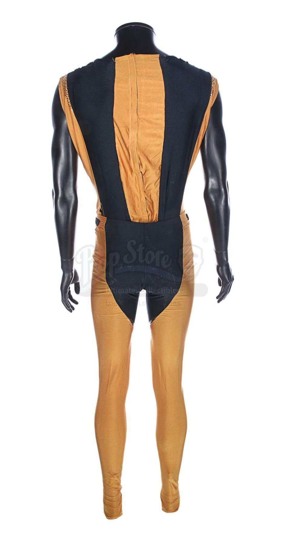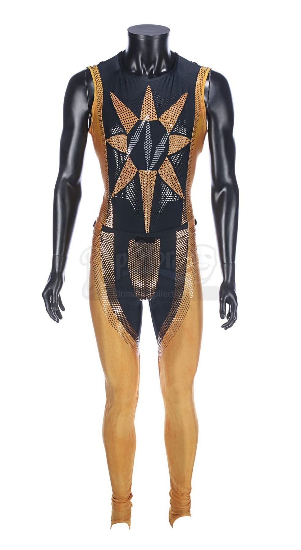 Each gold-and-black elasticated tunic is adorned with an "N" design in silver dots on the front, and the tunic is held in place during wear by Velcro running down the back and under the crotch. Bermans & Nathans labels inside the garments read "Mark Pillow 4985 walking Superman IV". "Left Pole Arm" is also handwritten on one of the tunic labels. Four metal poppers run along the shoulders of the tunics, where Nuclear Man's cape was attached. The leggings are made of the same material, with Velcro patches around the waistband. The costumes show very minor wear from production use and age, and remain in very good condition.