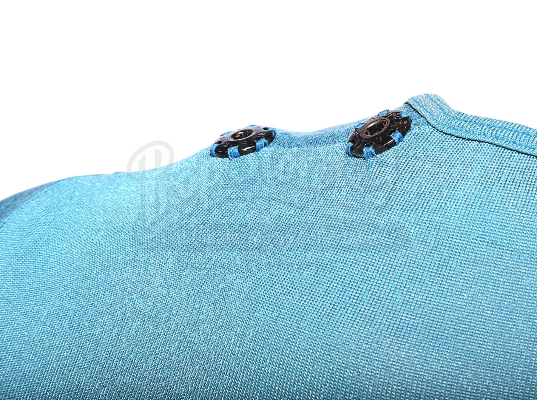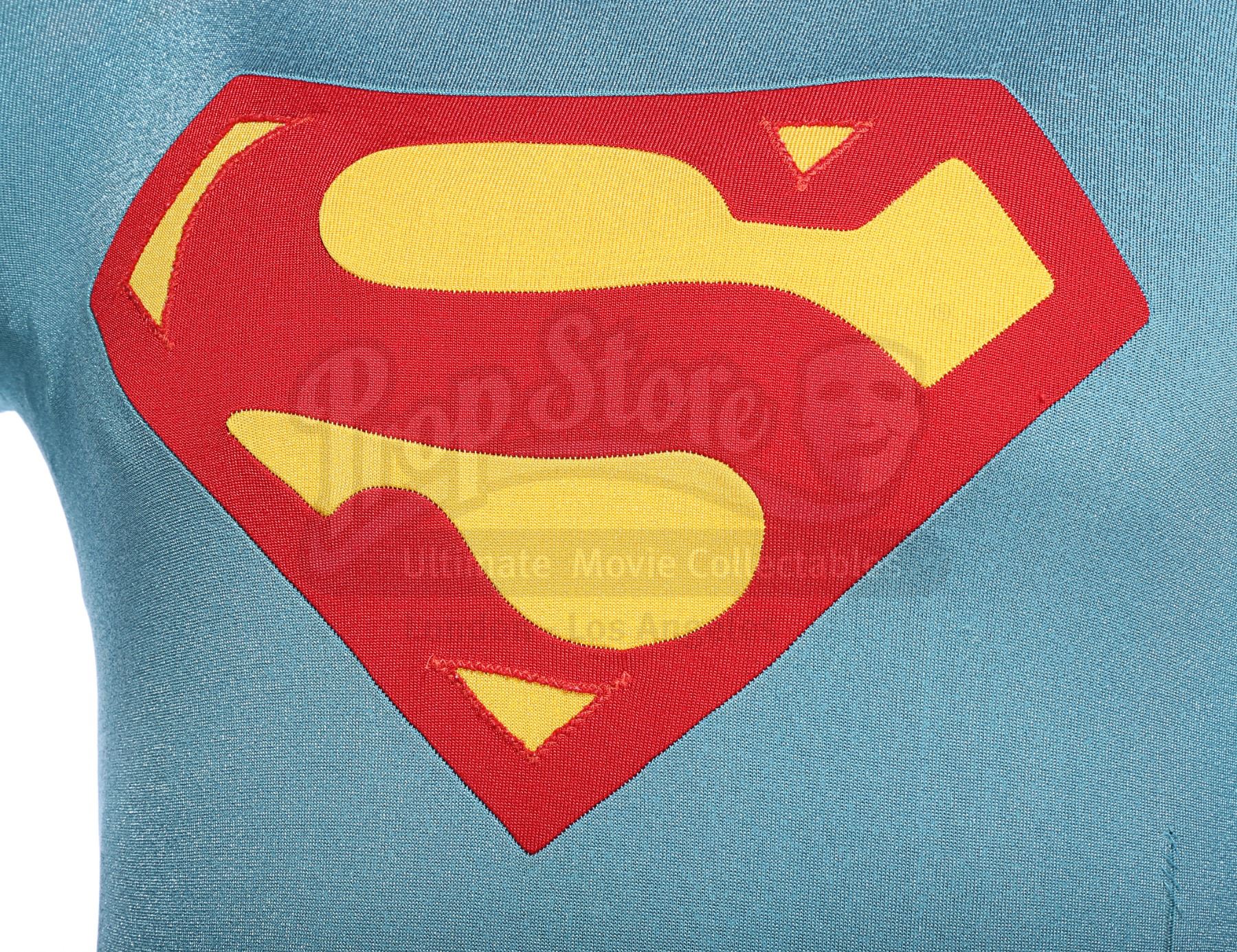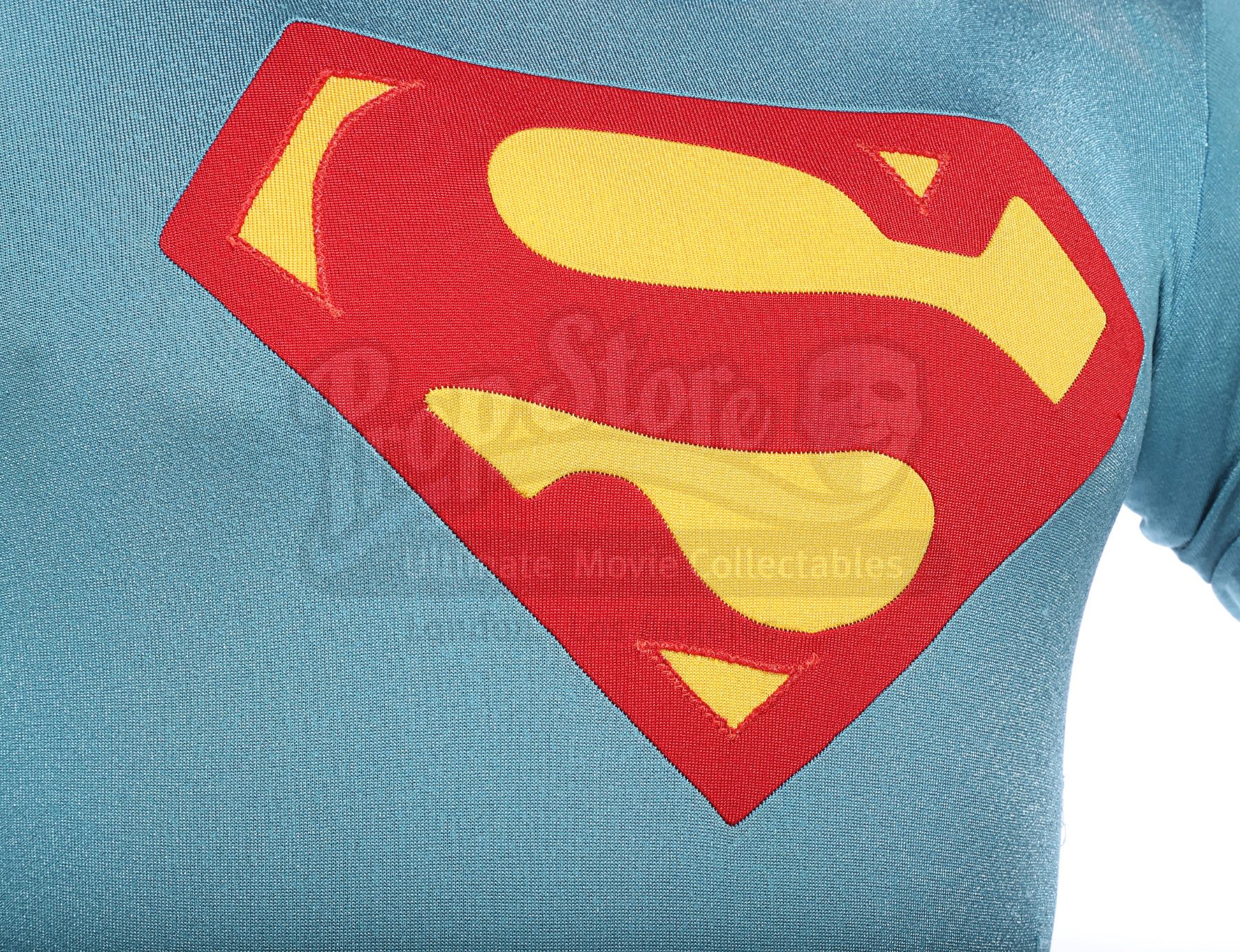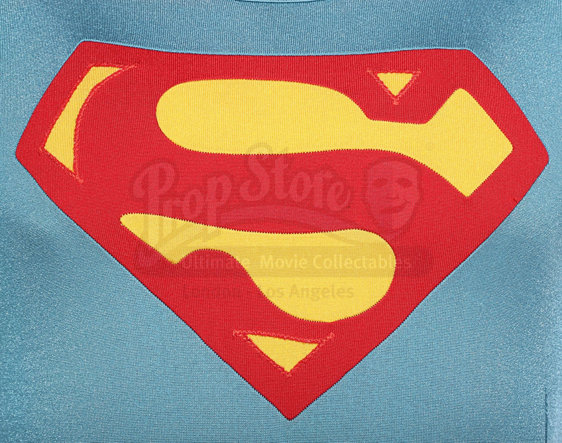 Superman's long-sleeved tunic is made of polyamide, a specially blended synthetic fabric designed to provide some stretch, while limiting visible signs of sweat during use under the heat of production lighting. The fabric was also designed to create a shimmering effect when illuminated. The tunic displays Superman's classic "S" logo in red and gold on the chest, and has a hidden zipper at the back, with four black metal poppers running along the shoulders to attach the cape.