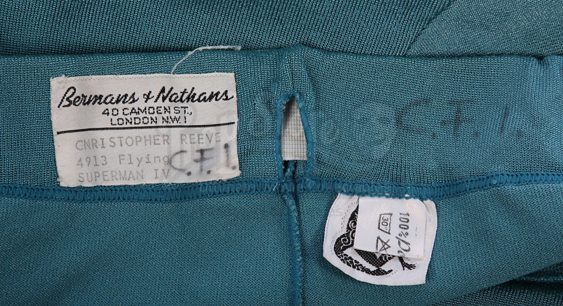 This instantly recognisable and iconic costume was custom-made for Reeve, and each item features a label from the costumiers Burman's & Nathan's, which reads, "Christopher Reeve 4913 Flying Superman IV", indicating that this costume was designed for the scenes in which Superman is airborne. All three parts of the costume feature slits down the sides for a harness to be attached to Reeve, allowing him to easily achieve his iconic flying pose.