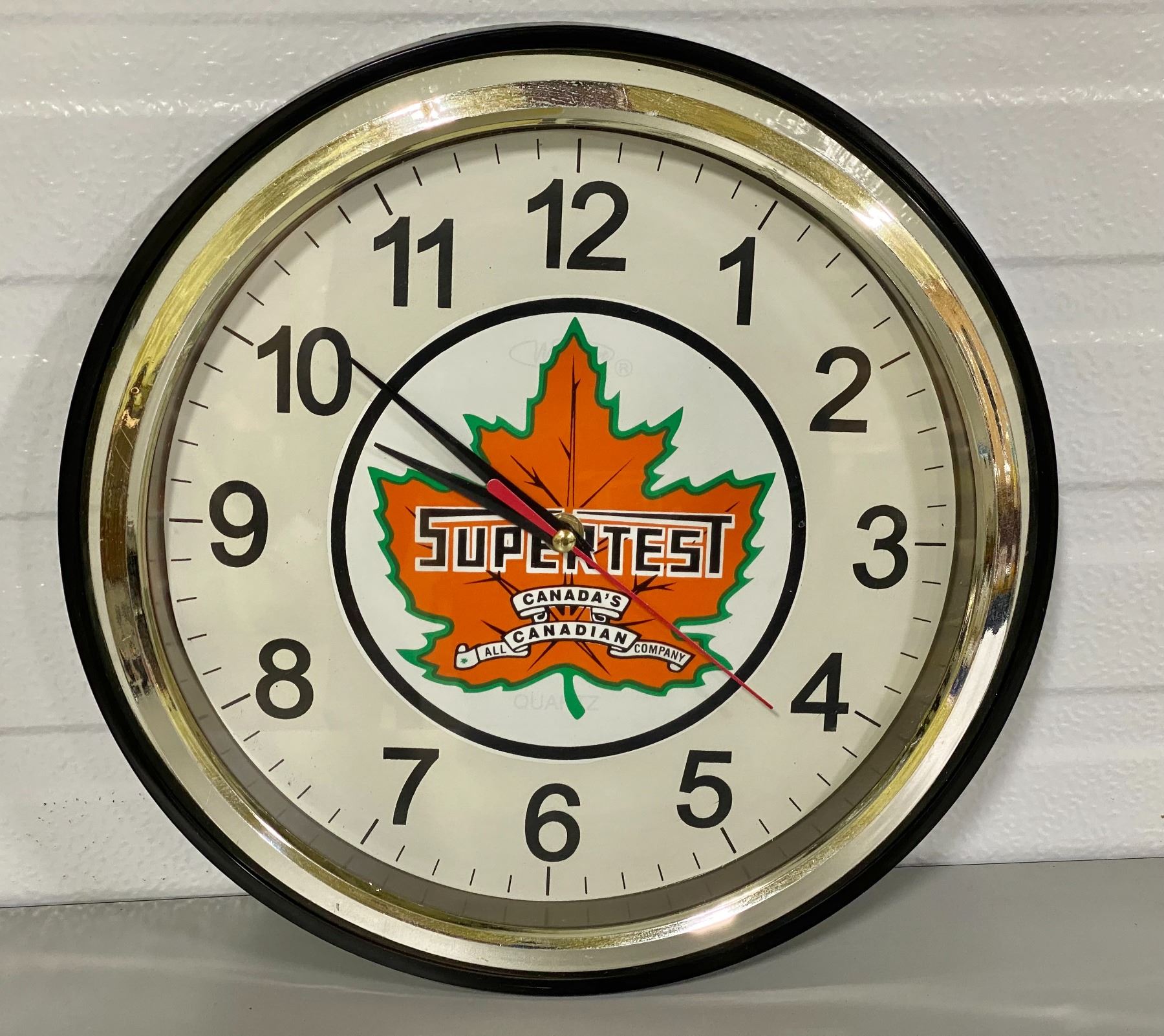 SUPERTEST CLOCK - WORKING. NOTE: SHIPPING GLASS ITEMS IS QUESTIONABLE WITH CANADA POST.