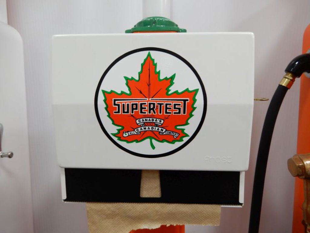 SUPERTEST SERVICE STATION ISLAND 2 BENNETT MODEL 541'S PROFESSIONALLY RESTORED GAS PUMP WITH KEYS - METAL BODY GLOBES & 13 1/2" PLASTIC LENSES - CENTER ISLAND LIGHT WITH TOWEL DISPENSER - 92" X 26" X 122" - LIGHTS UP LOCATION: SUPERTEST ROOM