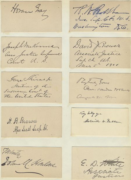 A group of ten signatures of Supreme Court judges on small cards, neatly mounted to a single album page: OLIVER WENDELL HOLMES, JOHN M. HARLAN, HORACE GRAY, DAVID J. BREWER, JOSEPH MCKENNA, E. D. WHITE, GEORGE SHIRAS, JR., HENRY B. BROWN, MELVILLE FULLER and one more not identified by signing adding "Jus. Sup. Ct. U.S.". Very good.