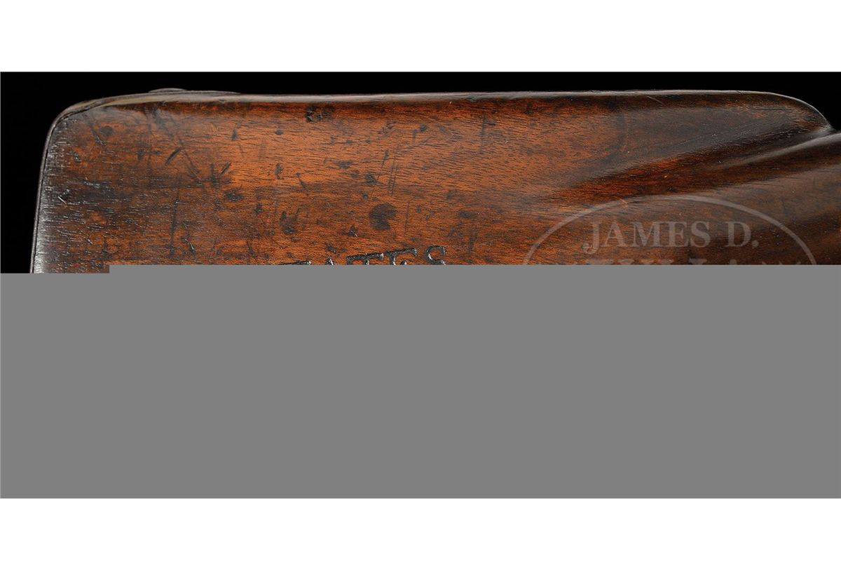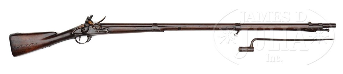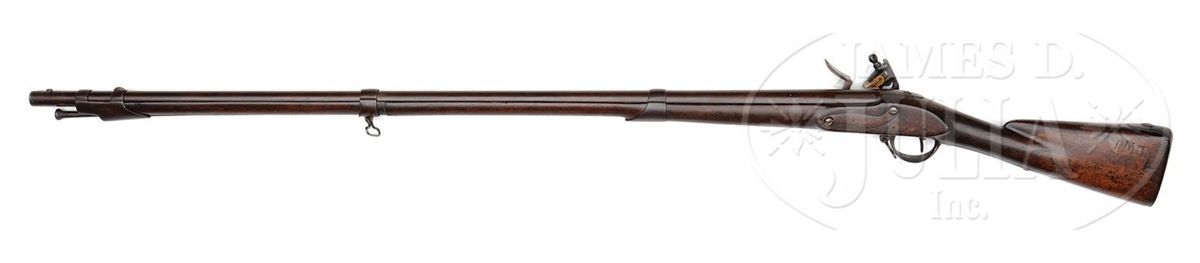 NSN. .77 Cal x 44-1/2" long rnd bbl marked "D75" at left breech indicating Charleville manufacture in 1775. Lock is 6-7/16" long marked under pan "N" over "CHARLEVILLE". Bbl bands, trigger guard, buttplate and side plate are all of proper French model 1774 pattern. European walnut stock proper pattern and branded "UNITED:STATES" in 3/8" letter height on right face of buttstock. Bayonet that accompanies this gun has a 14-1/2" blade and appears to be post American Revolutionary War. PROVENANCE: See Battle Weapons of the American Revolution, 1998, by Neumann, pp. 94-95. Collection of Dr. Douglas Sirkin. CONDITION: Bbl has been reconverted back to flint. Lock has also been reconverted having an incorrect frizzen spring and a pan that has been poorly fit to the lock plate. Cock appears to be orig as does the frizzen. All metal has smooth brown patina with only slight pitting around the touch hole area. European walnut stock is in overall very good condition with having only a 1/2" by 1/2" dent on right side of forearm. The initials "IMT" carved into the right side of the buttstock in 3/4" high letters. Balance of stock has only minor scratches and minor wood loss above lock behind flash hole. Ramrod appears to be very old, measures only 37-1/2" long. 10-1/2" x 1/4" long piece of wood replaced on right side of forend between front and middle band (nicely done) does not detract from overall appearance. Bayonet in good condition showing good patina and some pitting. 4-49958 PAS6