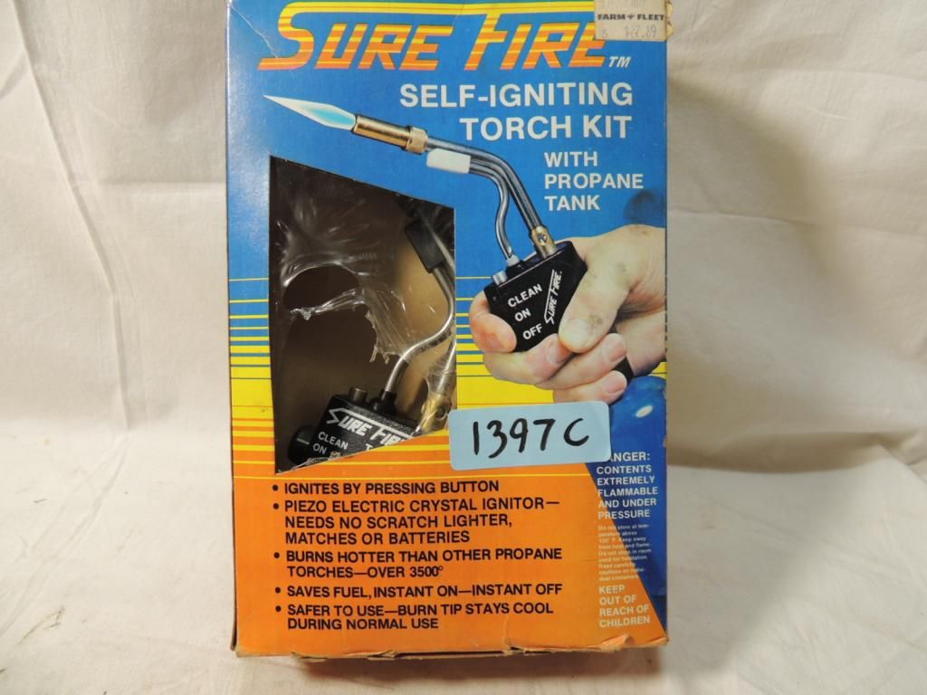 SURE FIRE SELF IGNITING TORCH KIT WITH PROPANE TANK. IGNITES BY PRESSING BUTTON. BURNS HOTTER THAN OTHER PROPANE TORCHES OVER 3500 DEGREES. SAVES FUEL INSTANT ON INSTANT OFF. AS SHOWN. SEE PHOTO FOR MORE DETAILS.
