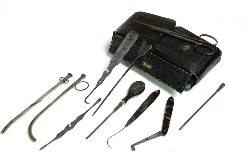 France, 19th century. Gilt leather cased set of surgeon's instruments, some with tortoise shell handles, case signed for Charriere, 3 1/2"w. 5 1/2"h.