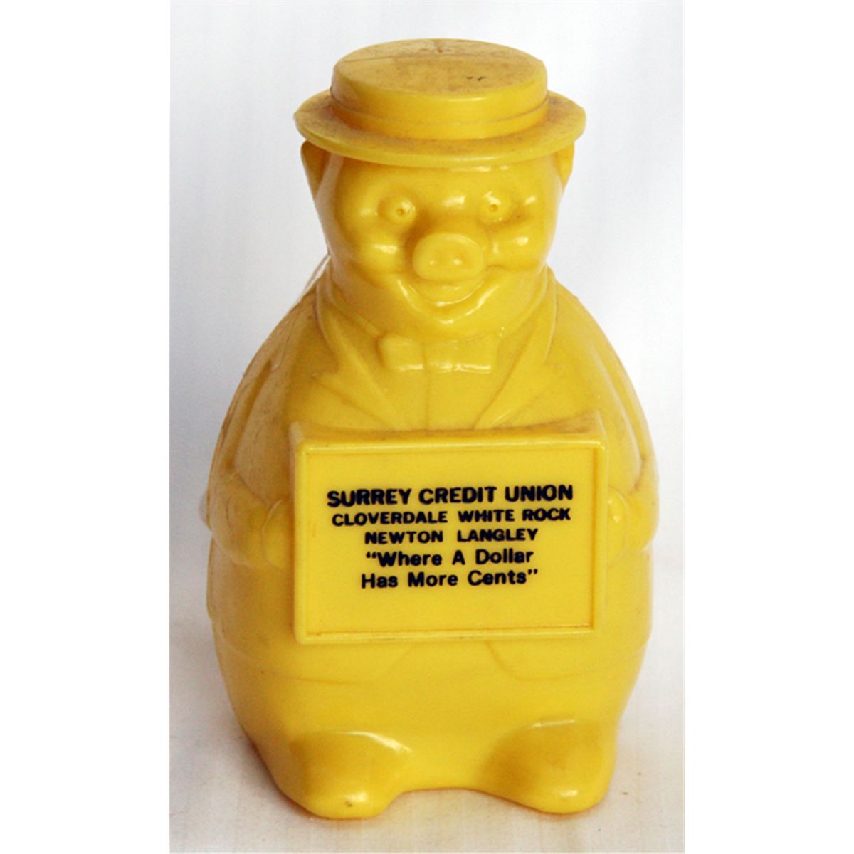 SURREY CREDIT UNION. A yellow plastic bank in the shape of a standing pig. Coin slot on top of back. EF.