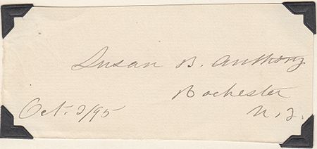 (1820 - 1906) American reformer active in suffrage, temperance and abolitionist movements instrumental in obtaining women the right to vote. Signature on a 5" x 2 1/8" slip: "Susan B. Anthony Rochester, N.Y. Oct. 2/95". Fine.