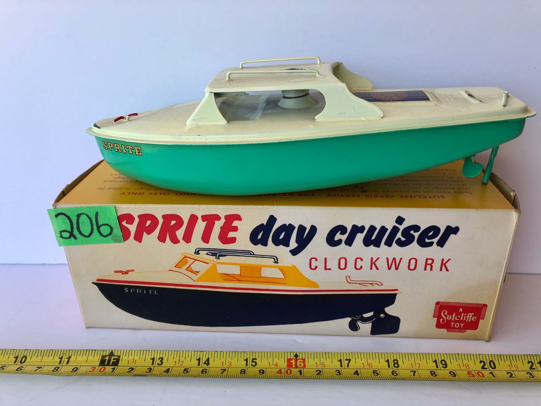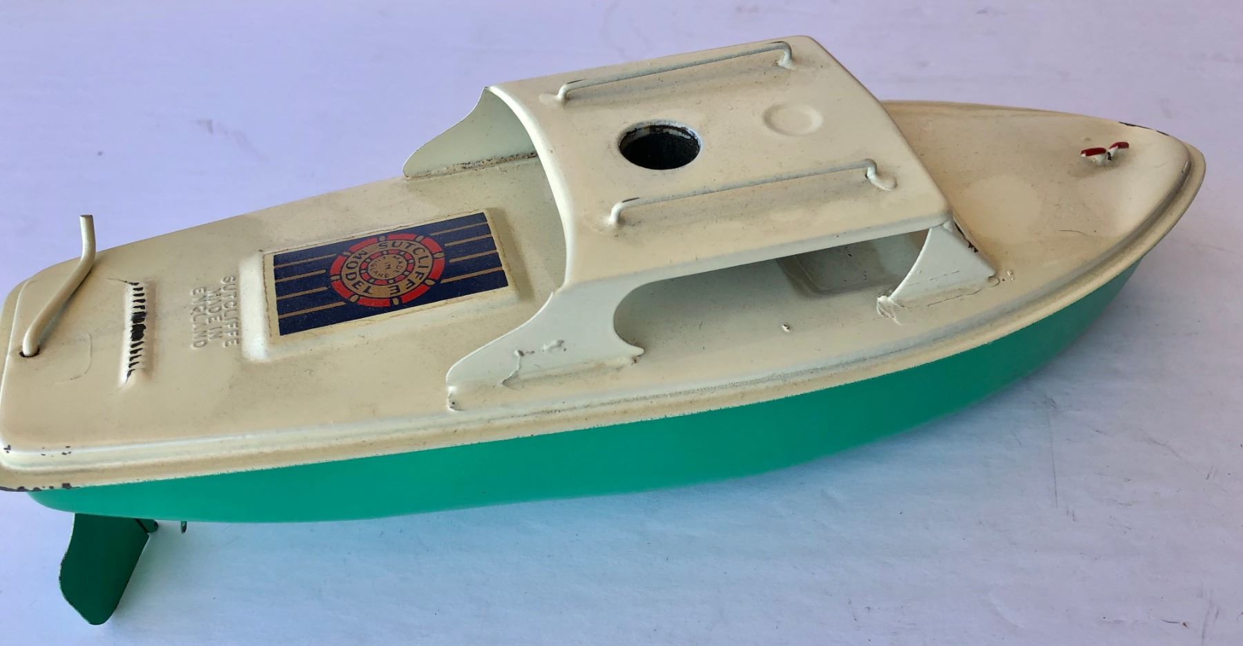 TIN WINDUP BOAT MISSING THE KEY. ORIGINAL BOX.