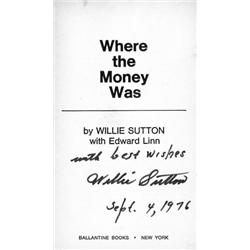 (1901 - 1980) "Willie the Actor", American bank robber of dozens of banks. When asked why he robbed banks, he replied: "Because that's where the money is". Scarce, bold inscription and signature: "with best wishes Willie Sutton, Sept. 4, 1976" signed on the title page (only) of his memoirs Where the Money Was. This title page has been affixed to the front flyleaf of a hardbound edition of the same book, but front flyleaf, half-title page and title page have been removed. Very good.