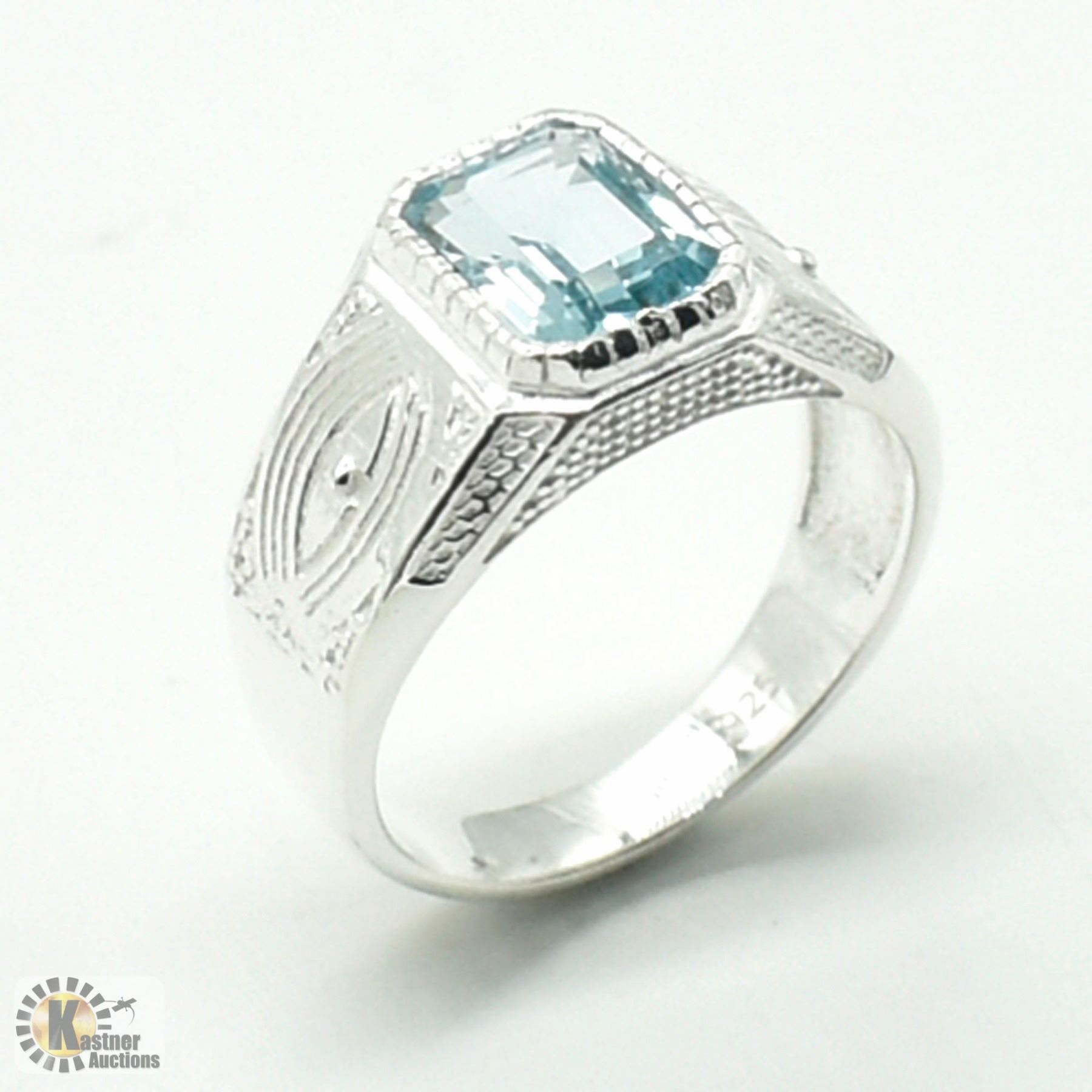 SILVER BLUE TOPAZ(3.25CT) RHODIUM PLATED MENS RING RING (~WEIGHT 7.1G)