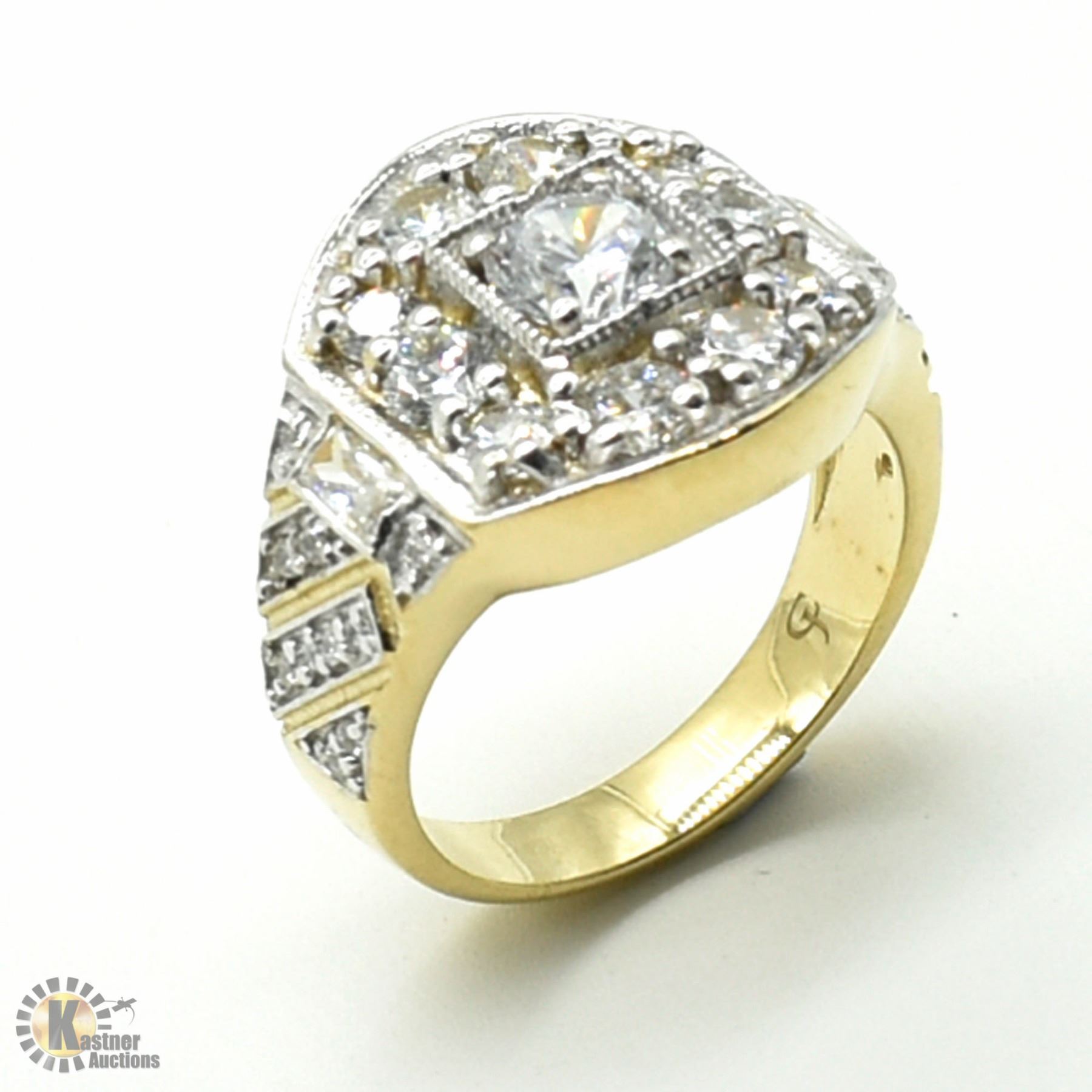GOLD PLATED SILVER CUBIC ZIRCONIA(3.1CT) GOLD RHODIUM PLATED MENS RING RING (~WEIGHT 9.3G)