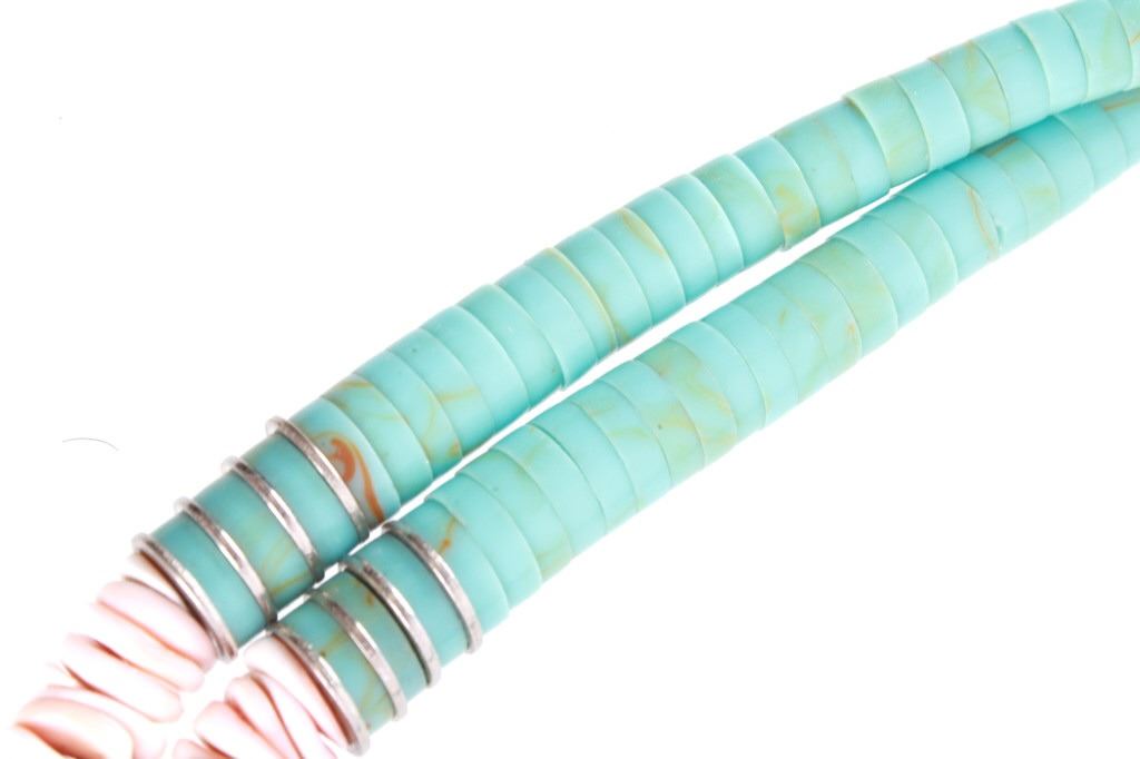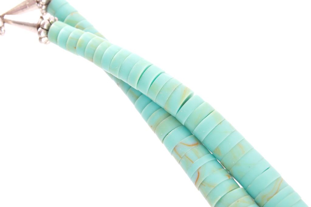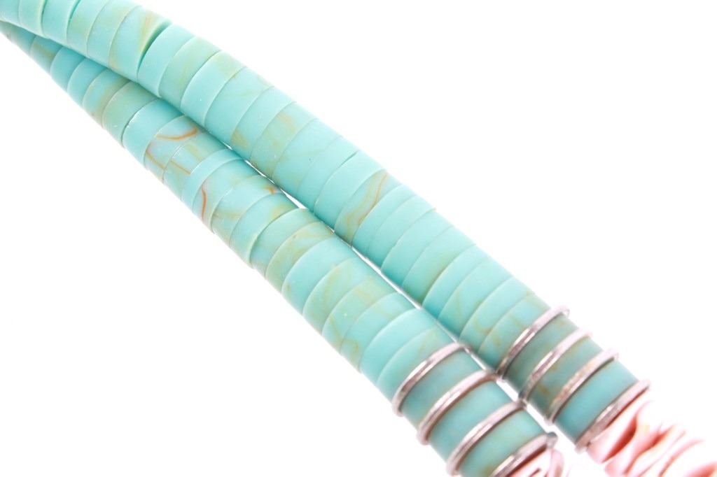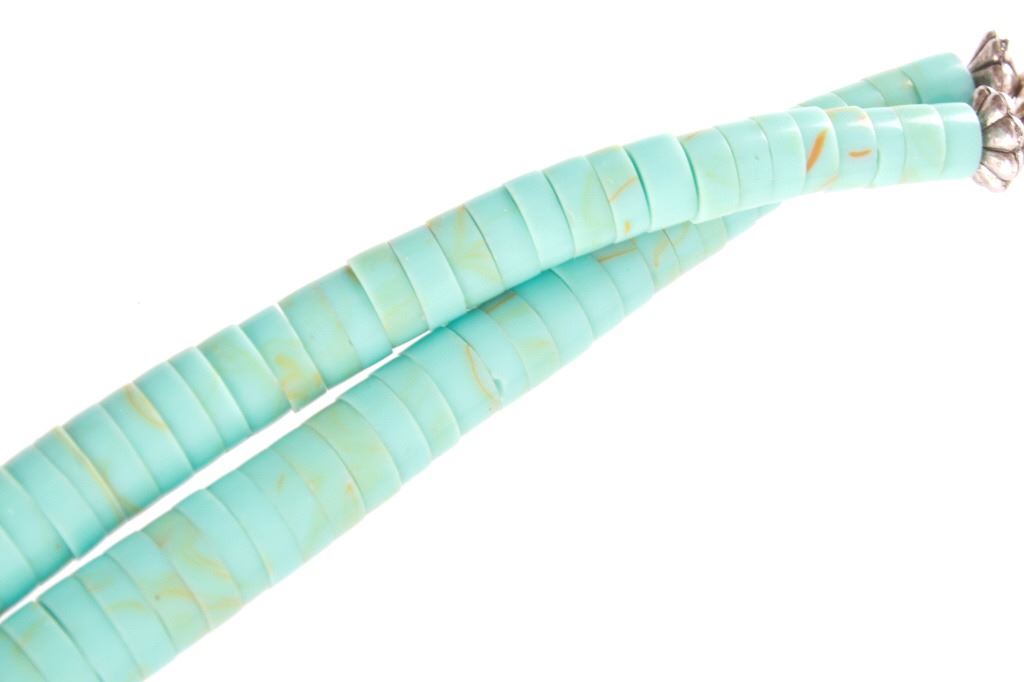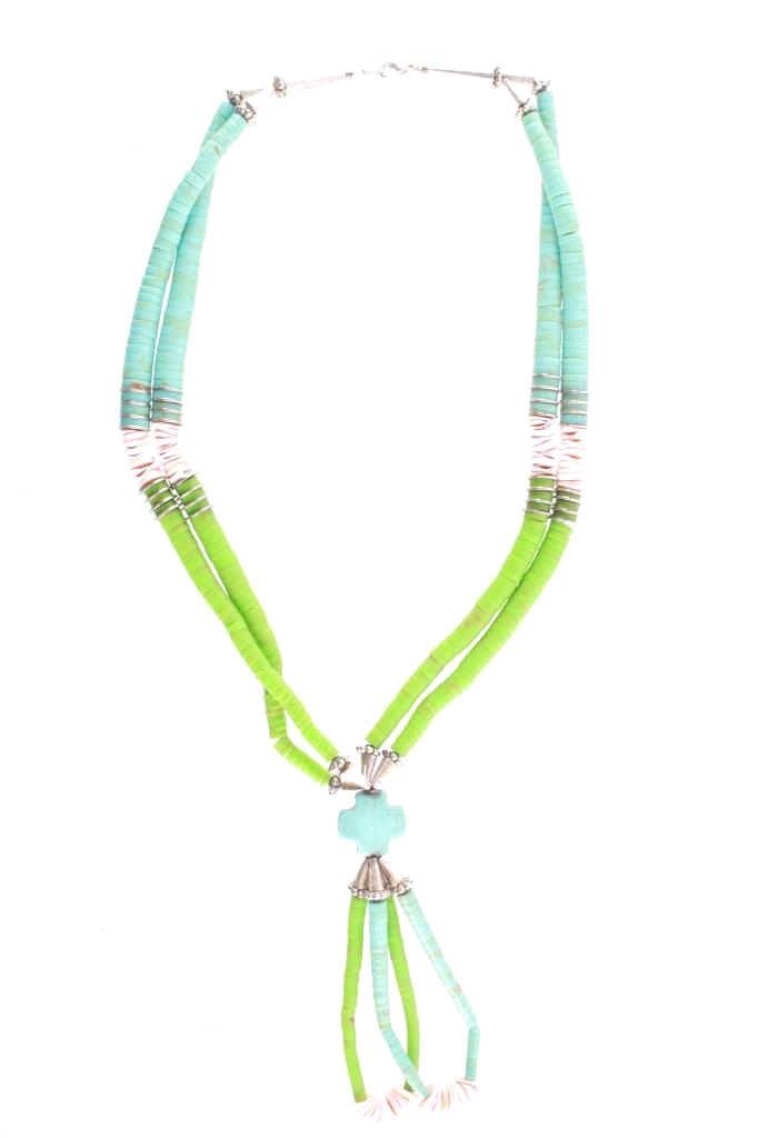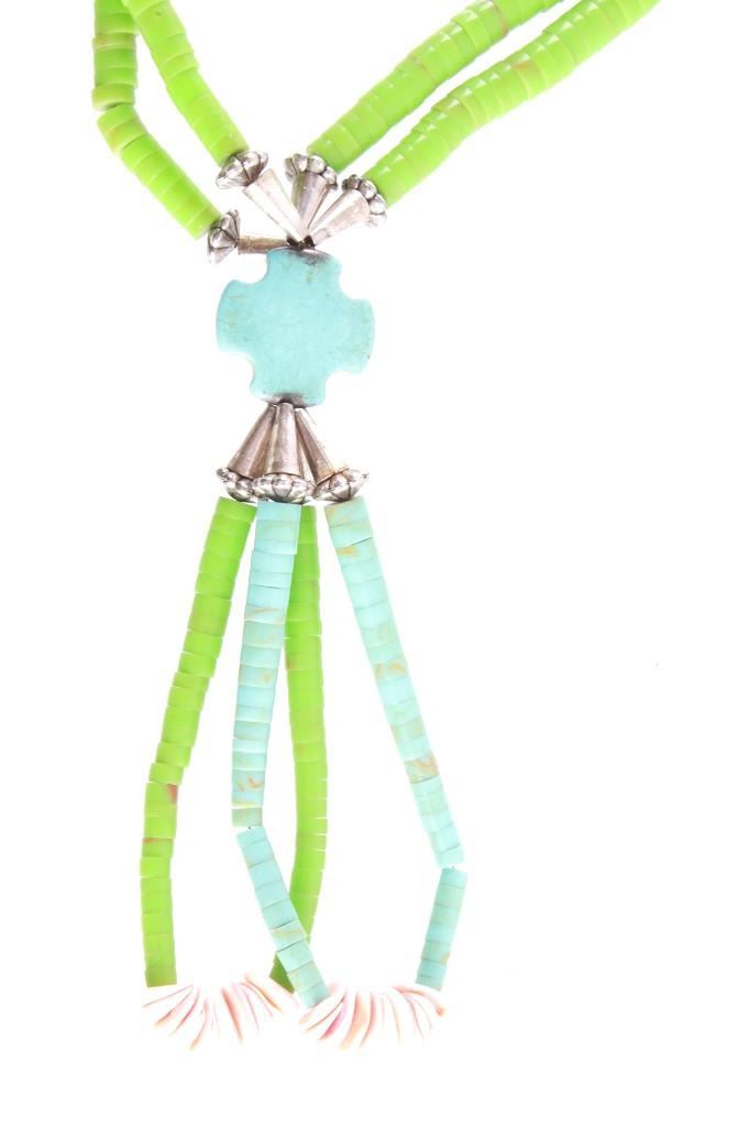 This lot includes a Vintage Southwest Cross-shaped Cripple Creek Turquoise cabochon Pendant, Faux Turquoise polymer bead four-strand necklace with spiny oyster shells, jingles, and sequins. Native American beadwork involves the use of both natural and manmade items. This necklace is a good example of both mediums being employed to create a beautiful piece. The cross-shaped cabochon is Cripple Creek turqouise from Teller, Colorado, and has a nice light blue hue with slight matrix visible. The polished Spiny Oyster shells have definite striations and color variations in soft pink. The polymer heishi bead turquoise strands are graduated in size, approximating both Cripple Creek and Carico turquoise blues and greens. The jingles are also graduated and stamped. Unable to locate a maker's signature stamp. Metal pieces exhibit a rich, uniform patina throughout, no obvious damage noted. Measures 18.5"L closed.