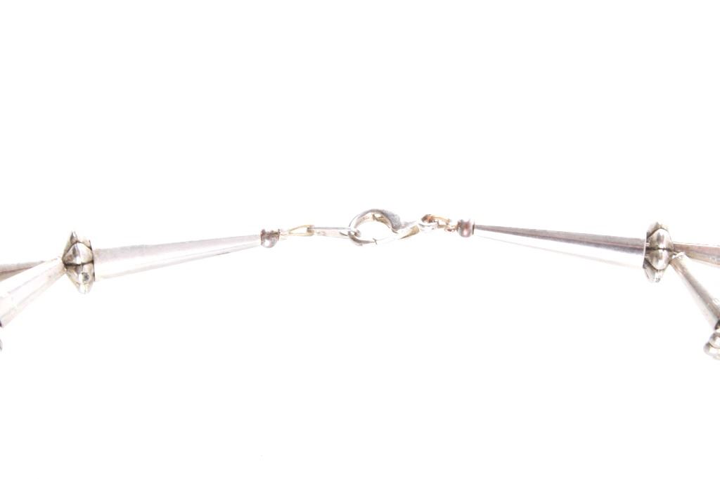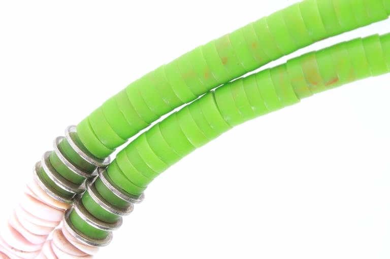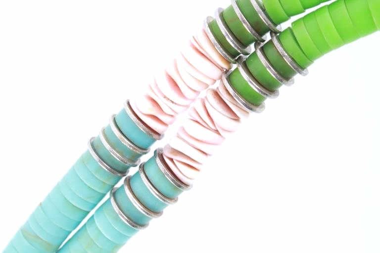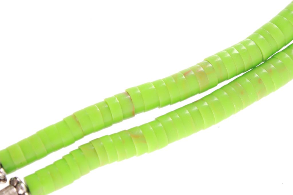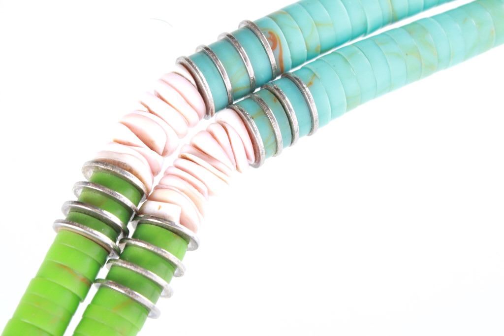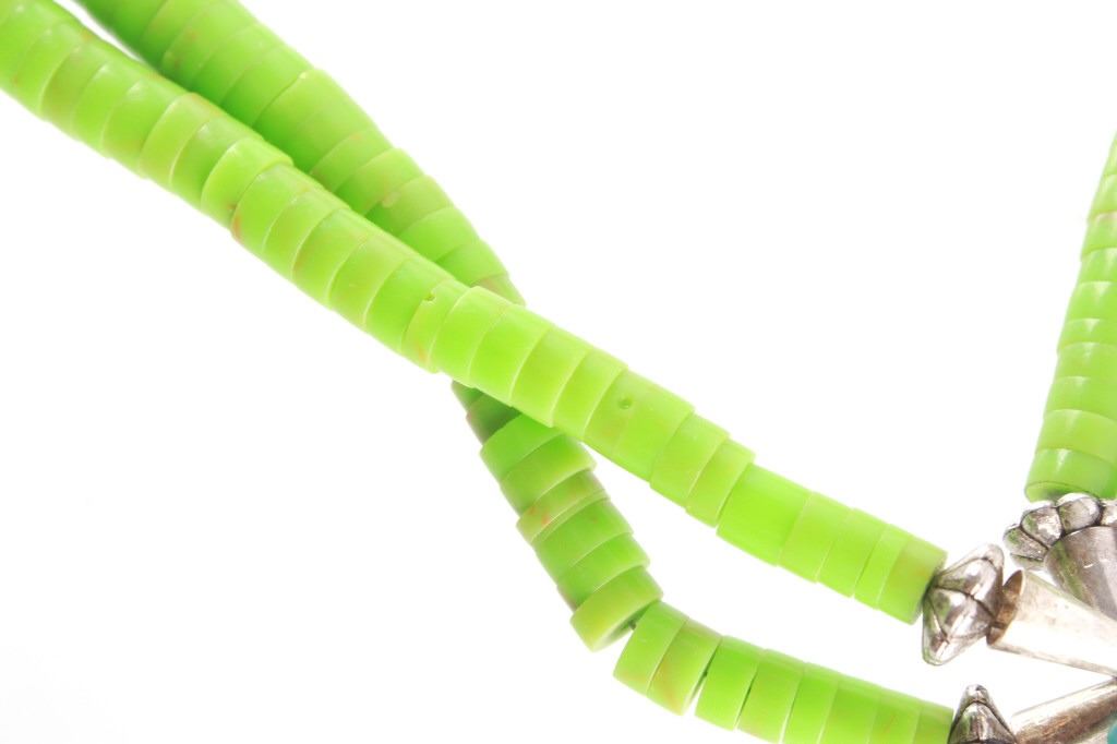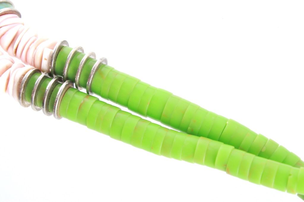 This lot includes a Vintage Southwest Cross-shaped Cripple Creek Turquoise cabochon Pendant, Faux Turquoise polymer bead four-strand necklace with spiny oyster shells, jingles, and sequins. Native American beadwork involves the use of both natural and manmade items. This necklace is a good example of both mediums being employed to create a beautiful piece. The cross-shaped cabochon is Cripple Creek turqouise from Teller, Colorado, and has a nice light blue hue with slight matrix visible. The polished Spiny Oyster shells have definite striations and color variations in soft pink. The polymer heishi bead turquoise strands are graduated in size, approximating both Cripple Creek and Carico turquoise blues and greens. The jingles are also graduated and stamped. Unable to locate a maker's signature stamp. Metal pieces exhibit a rich, uniform patina throughout, no obvious damage noted. Measures 18.5"L closed.
