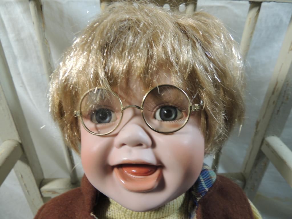 LITTLE BOY WITH GLASSES. BLONDE BROWN FLET OUTFIT GOOD CONDITION BRIGHT BLUE EYES. COLLECTIBLE AS SHOWN SEE PHOTO FOR MORE DETAILS