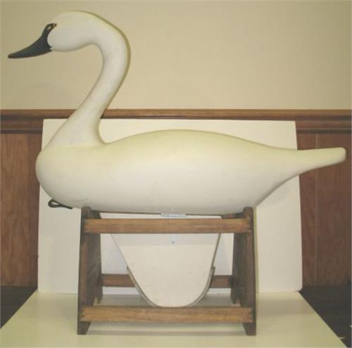 EVANS MCKINNEY LARGE SWAN DECOY. Large weight at bottom. Minor crack at front of neck. Initialed at bottom “J.E.Mc.” Has stand.