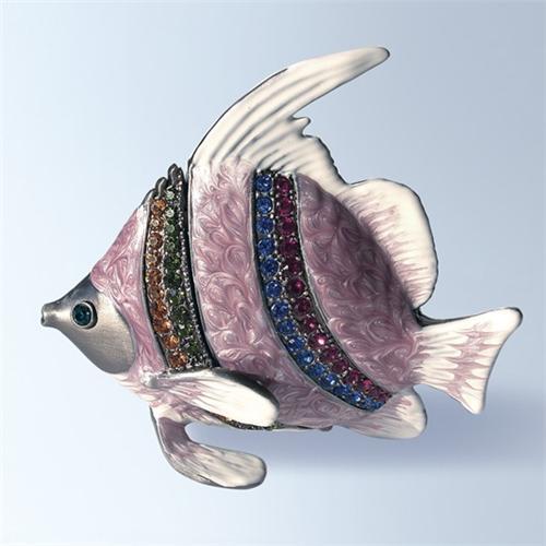 LOT OF EXPENSIVE, GENUINE SWAROVSKI CRYSTALS SPARKLE ON THIS JEWELRY/TRINKET BOX . LOOKS LIKE REEF FISH WITH MOTHER OF PEARL COLORED SCALES. BUT IT IS REALLY A BOX TO HIDE VALUABLE IN!