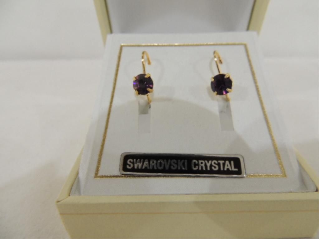 PURPLE AND GOLDTONE SWAROVSKI CRYSTAL EARRINGS. AS SHOWN. SEE PHOTO FOR MORE DETAILS.