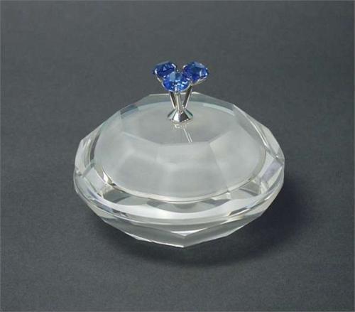 SWAROVSKI SELECTION, Austria. A cut crystal box. The domed cover with triangular handle of facetted aquamarine in chromed metal claw setting. Signed and hallmarked. 4" diameter. Together with presentation booklet, in original case and with certificate.. 600-700