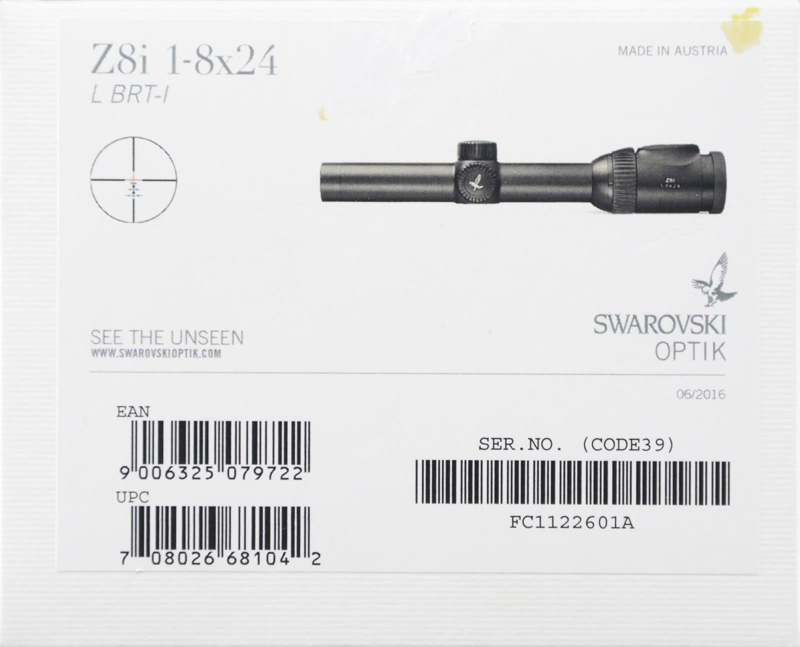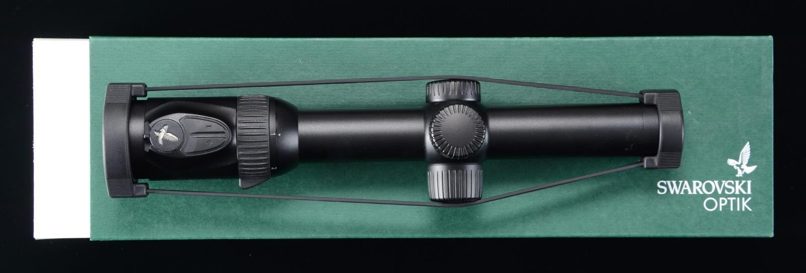 WITH MATCHING FACTORY BOX. Z8i 1-8x25mm scope manufactured by Swarovski in Austria. Black anodized aluminum construction with illuminated optic and BRT reticule. UNATTACHED ACCESSORIES: matching factory box with sleeve, containing factory paperwork. CONDITION: near new, with exterior showing few minute superficial marks from handling and storage overall. Scope retains a clear and sharp optic. Box and sleeve show mild exterior wear from handling and storage, but otherwise remain sturdy and serviceable. PROVENANCE: The Collection of Gun Sport Ltd. owned by Jon R. Thomas. (02-20650/MLW). $2,000-2,750.