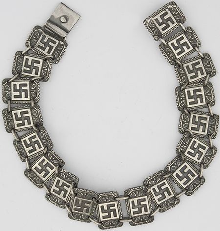 An interesting pieces of jewelry, an attractive linked silver bracelet comprised of plaques bearing swastikas and leaf motifs (but not oak leaves), hallmarked on back of clasp with "JG" and an indistinguishable mark, possibly for silver content. The bracelet is just over 8" long and 1/2" wide, closing by means of a box clasp. The delicate style and craftsmanship suggests that it might be an earlier nineteenth-century piece rather than one from the Third Reich era, and the style of the hallmark suggests British origin. In fine condition.