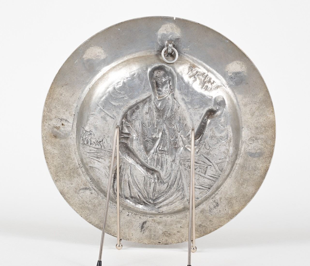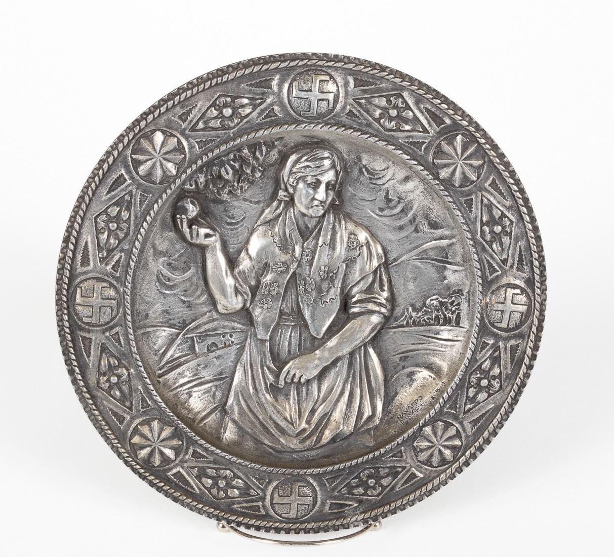 Swastika pewter wall decoration plate decorated with four swastikas around the rim of the plate. Engraved 'Navarro Bilsac - A.S.A.' Verso has a small loop for the plate for display.