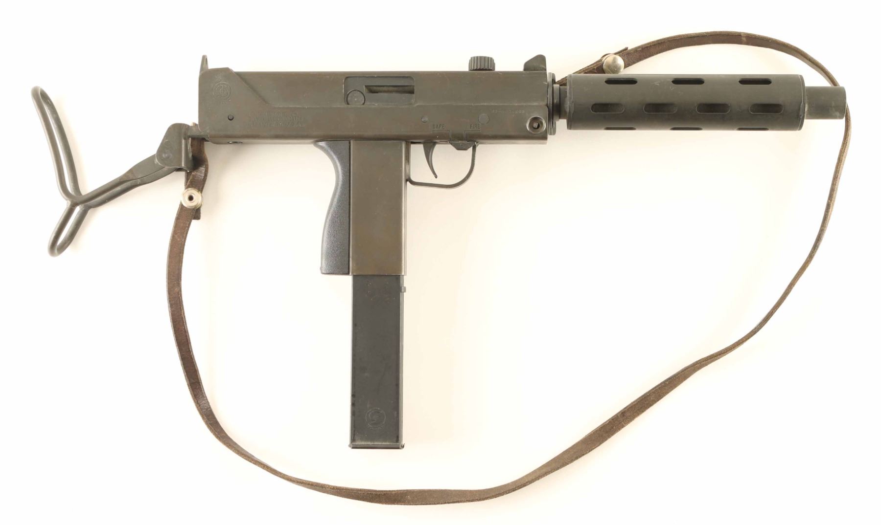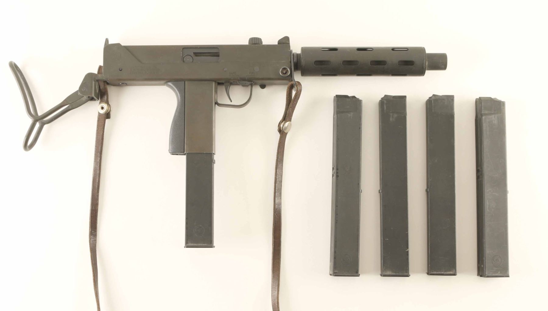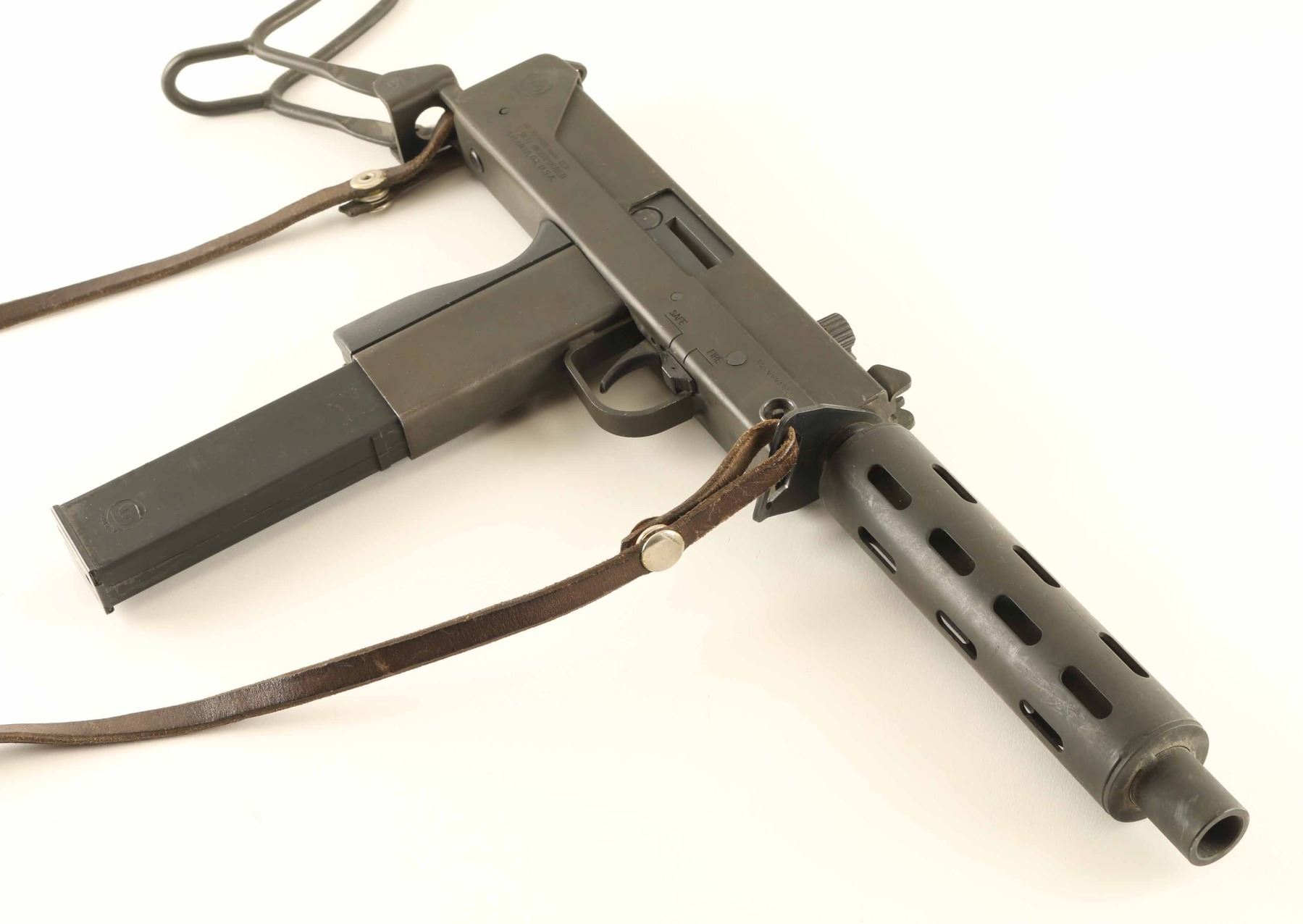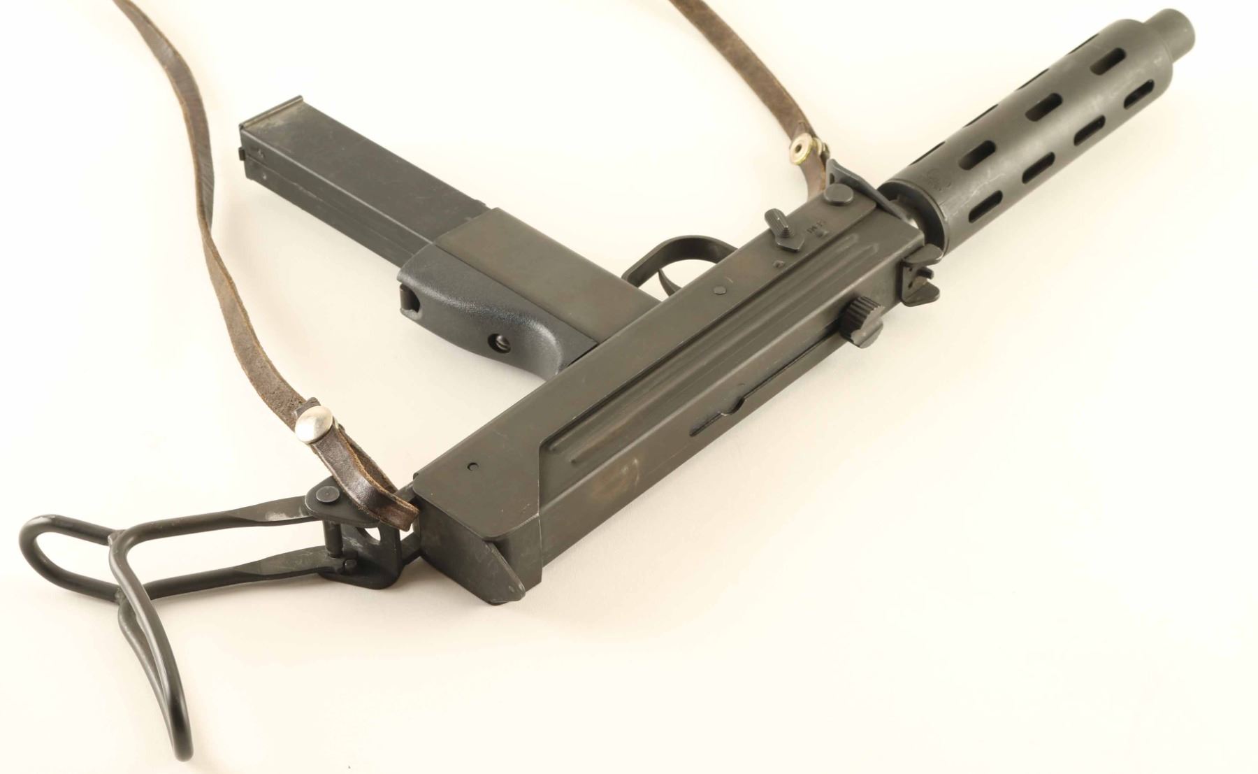 ‘Fully Tansferable’ Select fire open-bolt submachine gun chambered in 9x19mm, manufactured in Atlanta, GA pre-1986. Features a parkerized finish, 5.25" threaded barrel, detachable 7.5" barrel extension with ventilated handguard, shrouded post front sights, fixed rear aperture sight, smooth trigger, sliding safety on the lower receiver to the right of the triggerguard, selector lever on the left side of the lower receiver, heel magazine release, 32 round extended magazine, thin brown leather sling, black polymer palmswell on the back of the magazine well and retractable metal stock with overfolding wire shoulder piece. Includes four spare magazines. SMG retains approximately 90% of its original parkerized finish showing scattered handling marks, wear on the magazine well and a bright rub mark on the top of the receiver from the shoulder piece. Action is sound, the bore is pristine and the polymer is fine. From the Jim Lockwood, Legends of Leather Prescott, AZ Collection. Condition is NRA Very Good. ***NFA/Class 3 Firearm***