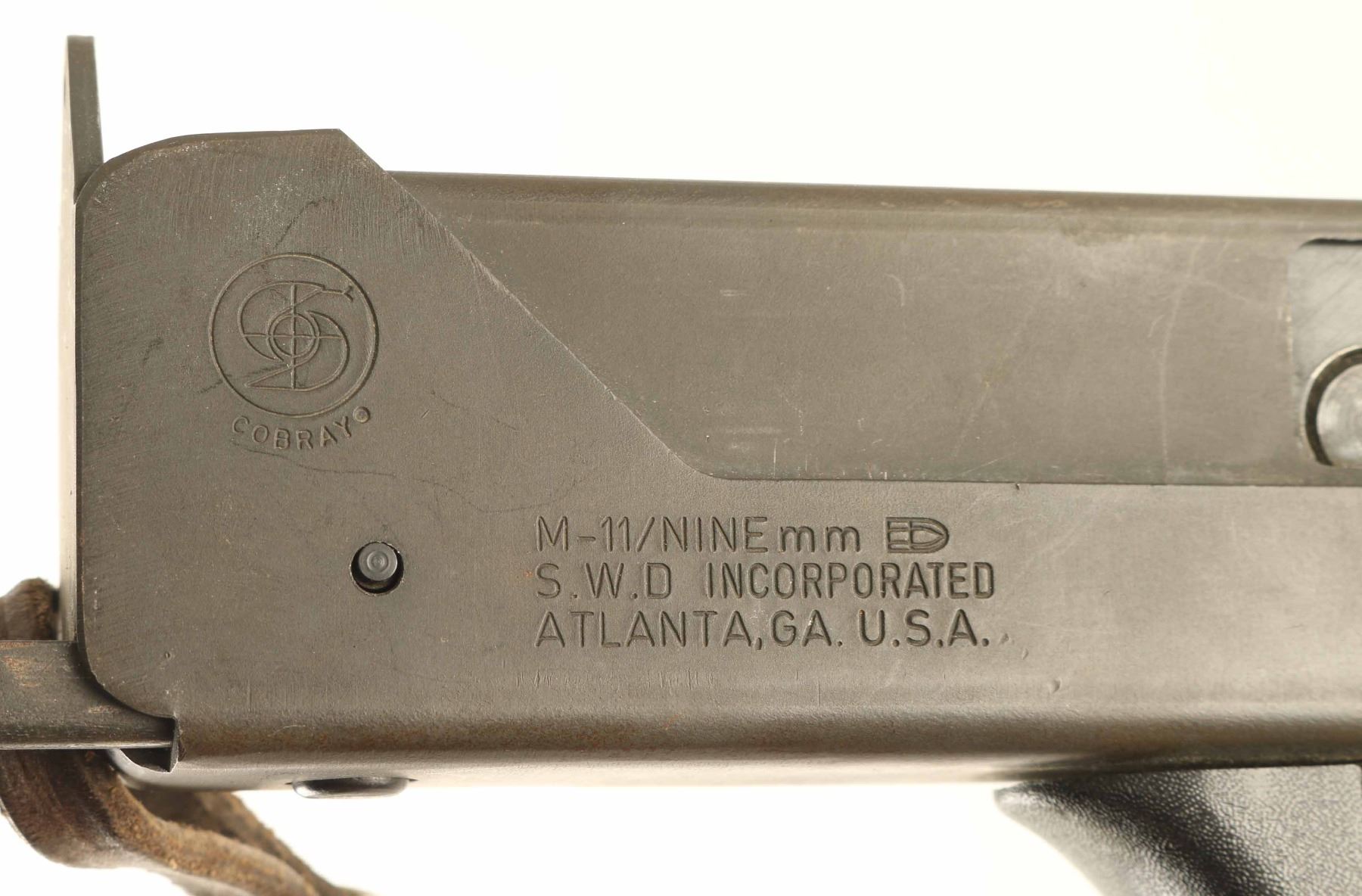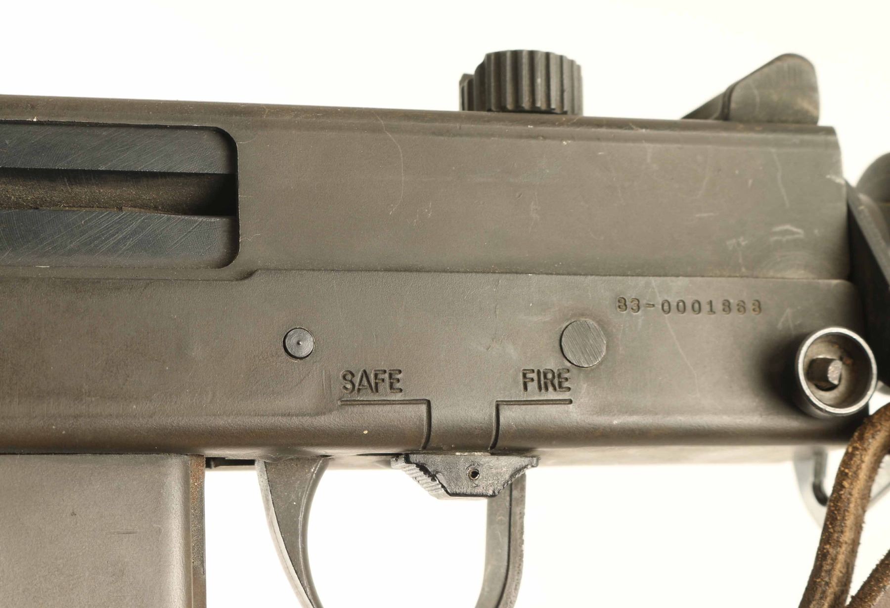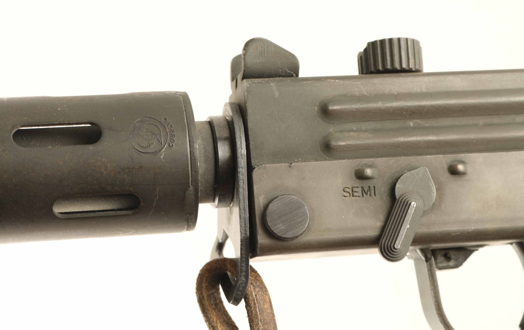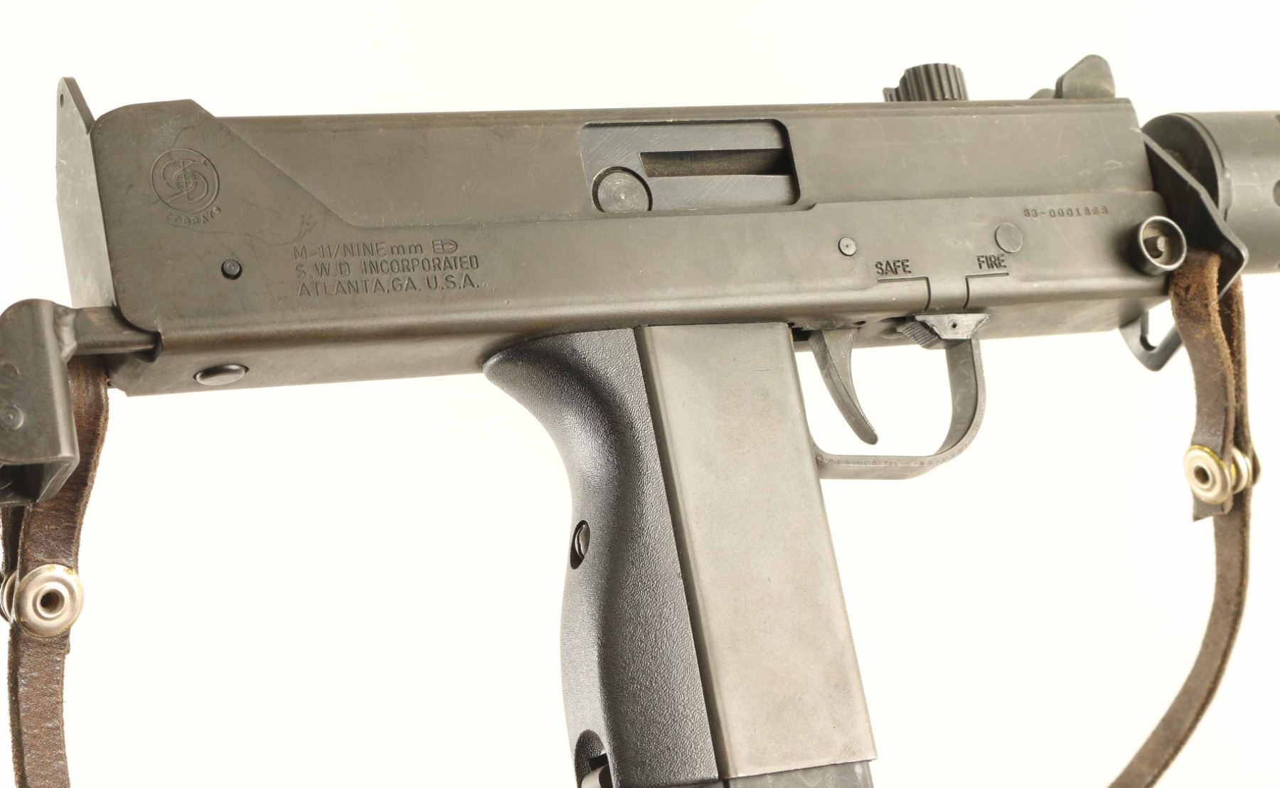 ‘Fully Tansferable’ Select fire open-bolt submachine gun chambered in 9x19mm, manufactured in Atlanta, GA pre-1986. Features a parkerized finish, 5.25" threaded barrel, detachable 7.5" barrel extension with ventilated handguard, shrouded post front sights, fixed rear aperture sight, smooth trigger, sliding safety on the lower receiver to the right of the triggerguard, selector lever on the left side of the lower receiver, heel magazine release, 32 round extended magazine, thin brown leather sling, black polymer palmswell on the back of the magazine well and retractable metal stock with overfolding wire shoulder piece. Includes four spare magazines. SMG retains approximately 90% of its original parkerized finish showing scattered handling marks, wear on the magazine well and a bright rub mark on the top of the receiver from the shoulder piece. Action is sound, the bore is pristine and the polymer is fine. From the Jim Lockwood, Legends of Leather Prescott, AZ Collection. Condition is NRA Very Good. ***NFA/Class 3 Firearm***
