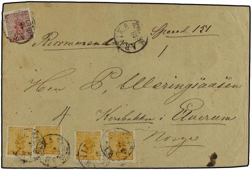 1862 ARVIKA a ELVERUN (Noruega). 24 ore amarillo (4) y 50 ore carmín, carta certificada. Manuscrito "Recommenderas" franqueo de 146 ore correspondientes a un cuadruple porte (sobrepagado en 2 ore), la tarifa exacta es de 144 ore. Franqueo excepcional y UNICO CONOCIDO (Facit 45.000 Skr). Cert. H.OBERMÜLLER.