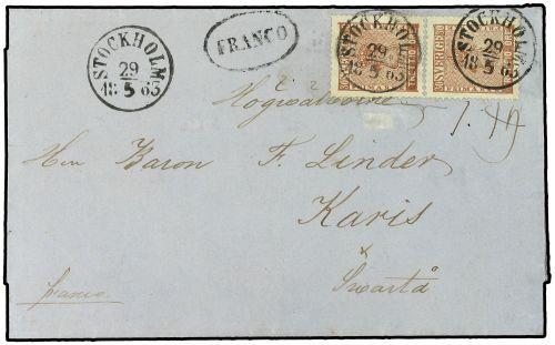 1863 (29 Mayo) ESTOCOLMO a KARIS (Finlandia). Franqueada con 60 öre con 2 sellos de 30 öre (Facit 11).